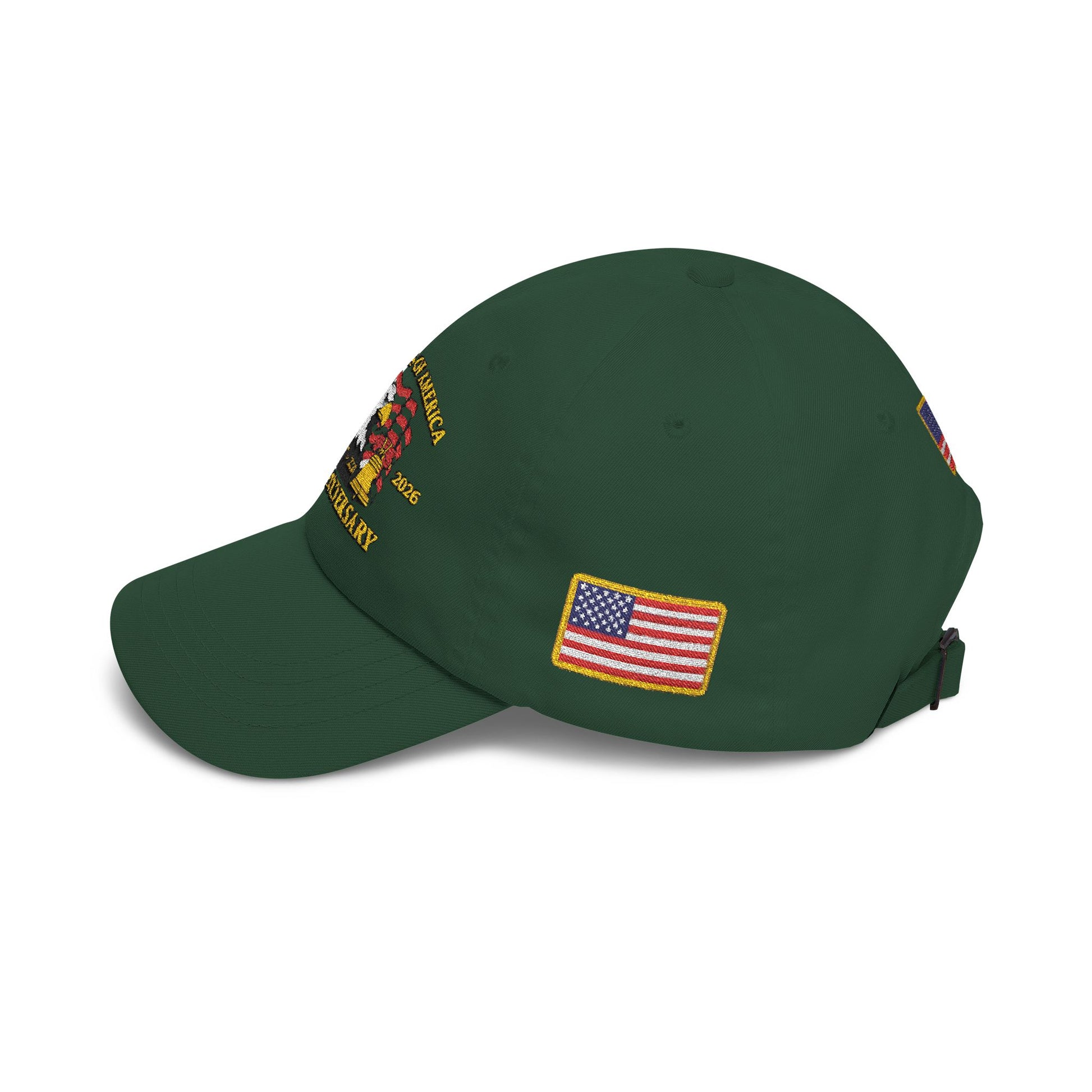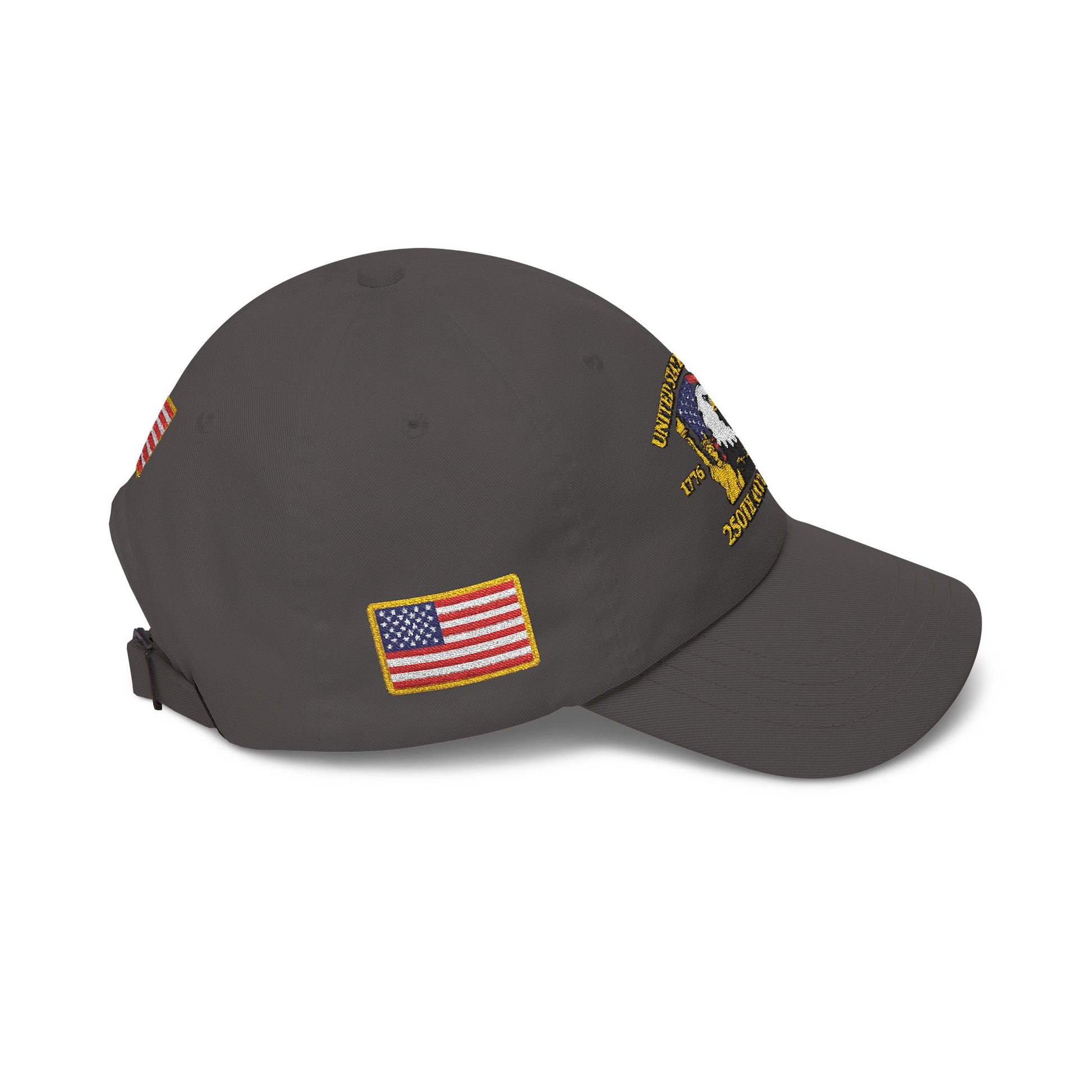 Celebrate America’s 250th year with a hat designed to feel like a keepsake. This commemorative dad hat features the full 250th Anniversary embroidered logo on the front — the bold eagle, the waving flag, the Statue of Liberty, and the Liberty Bell — all arranged in a powerful, patriotic composition honoring 1776–2026.