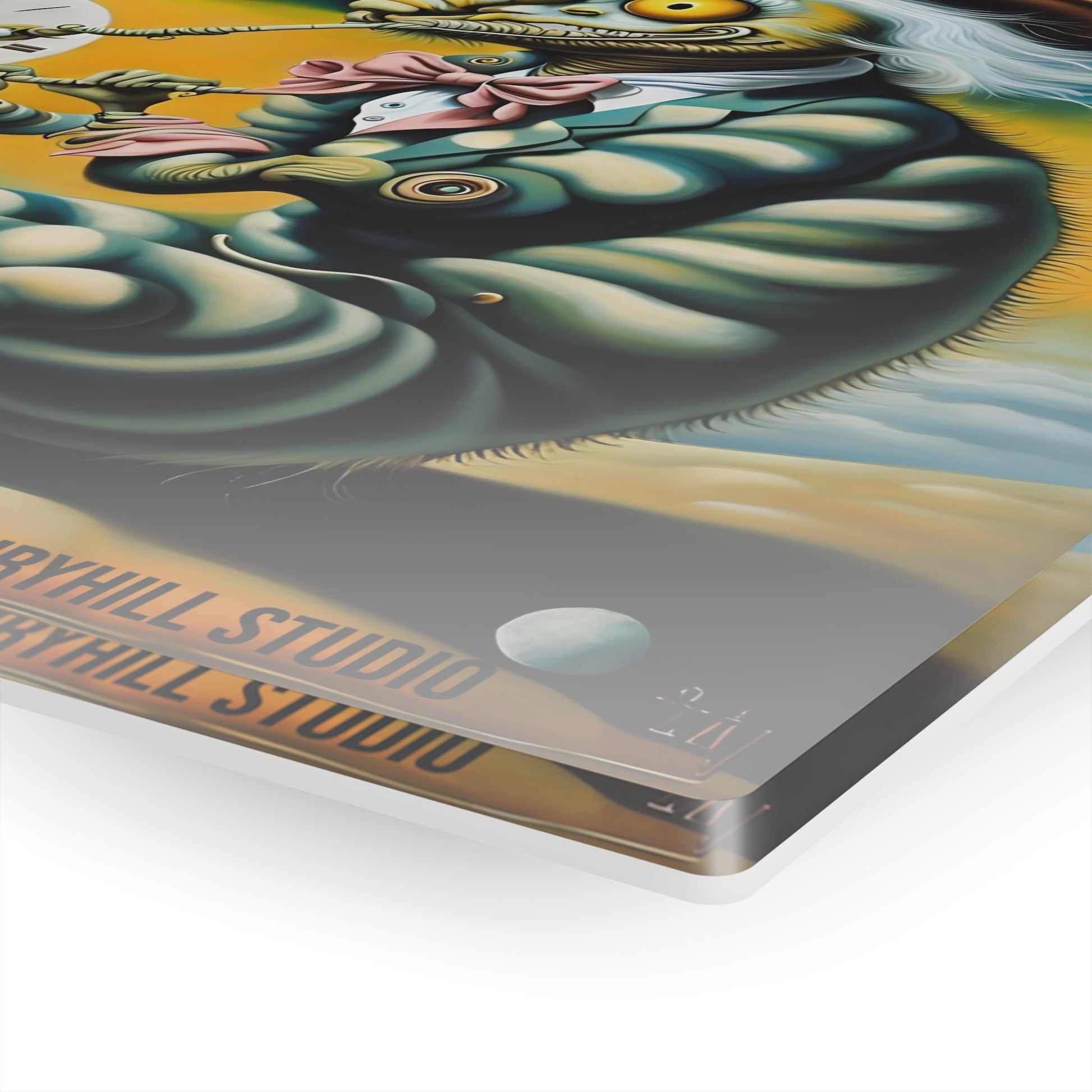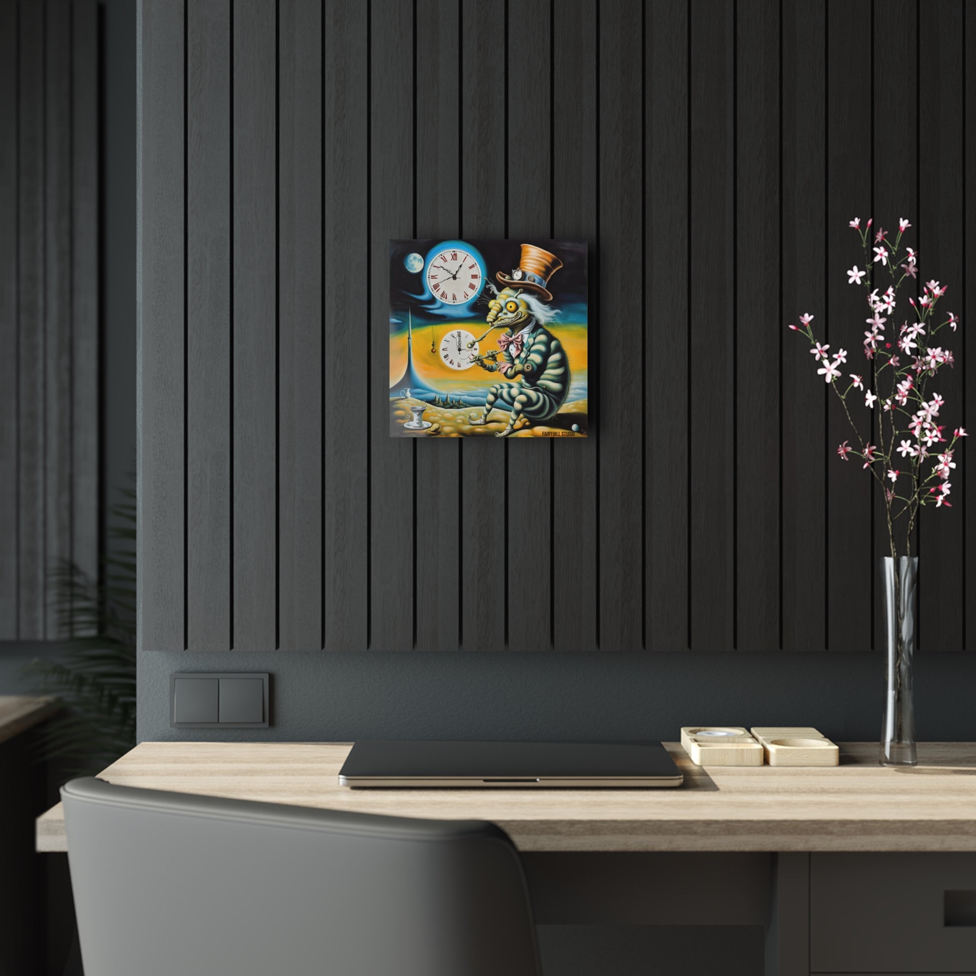 This whimsical Acrylic Print features a caterpillar in a top hat and pipe under a clock, creating a sense of solitude. Perfect for Hatter lovers, this unique piece can add a touch of whimsy to any space. Ideal for those who appreciate quirky and unconventional artwork, this print is a great gift for fans of fantasy and surrealism. Suitable for decorating homes, offices, and creative spaces. Relevant for birthdays, housewarmings, and special occasions.