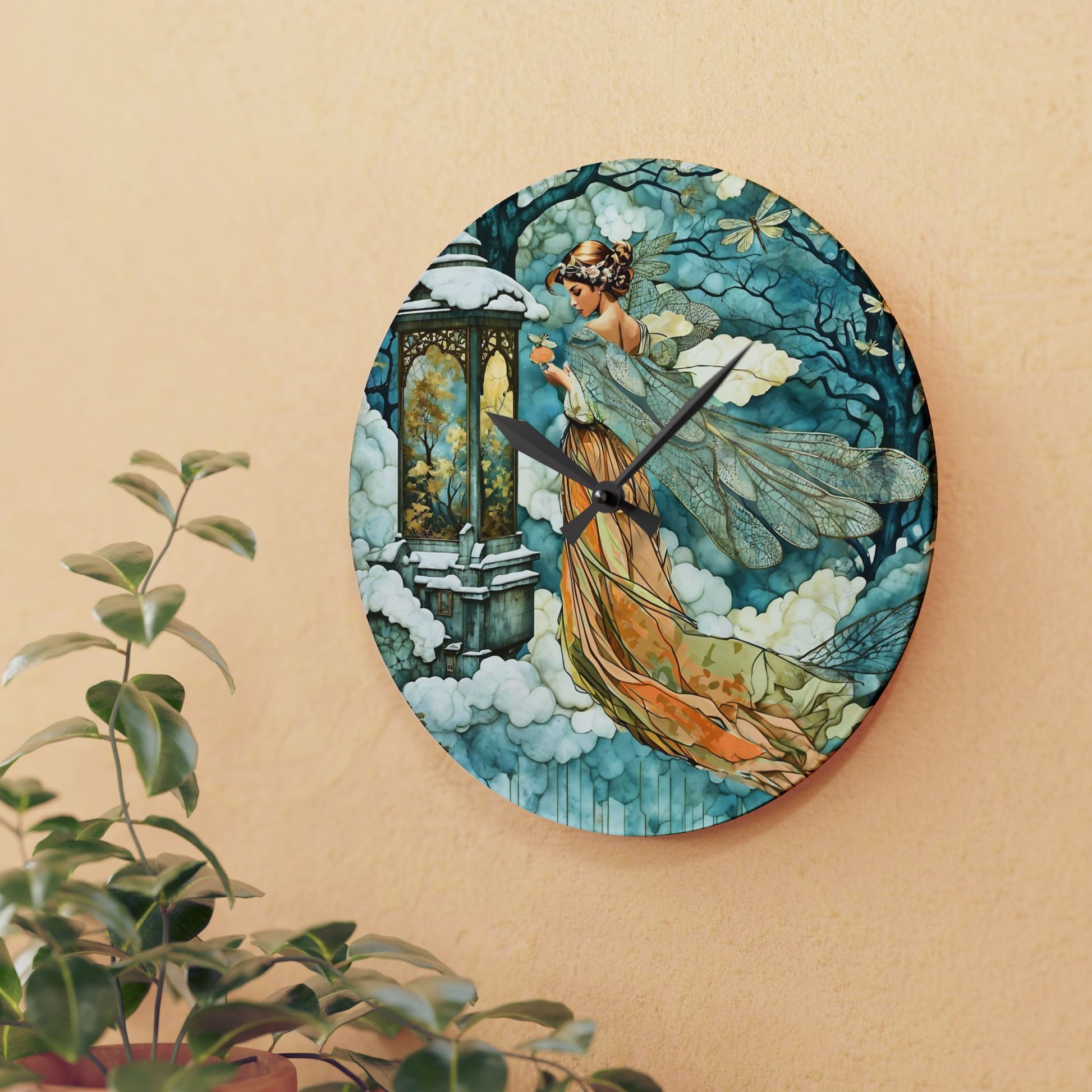 This Acrylic Wall Clock features a winter snow fairy/Angel next to a lantern, giving off a magical and whimsical vibe. Perfect for fairy enthusiasts and those who love unique art pieces. Ideal for decorating during the winter season and would make a great gift for Christmas or winter birthdays.