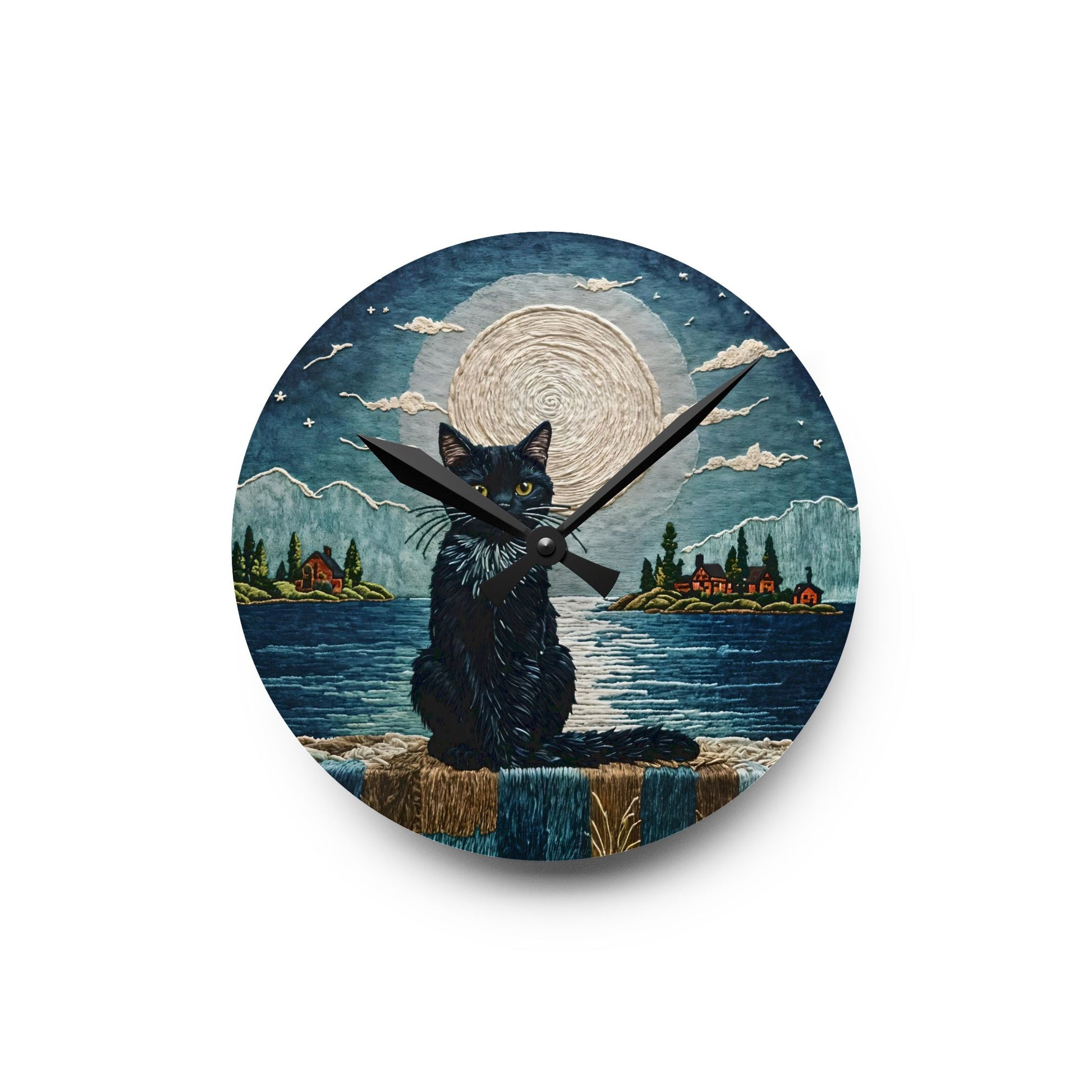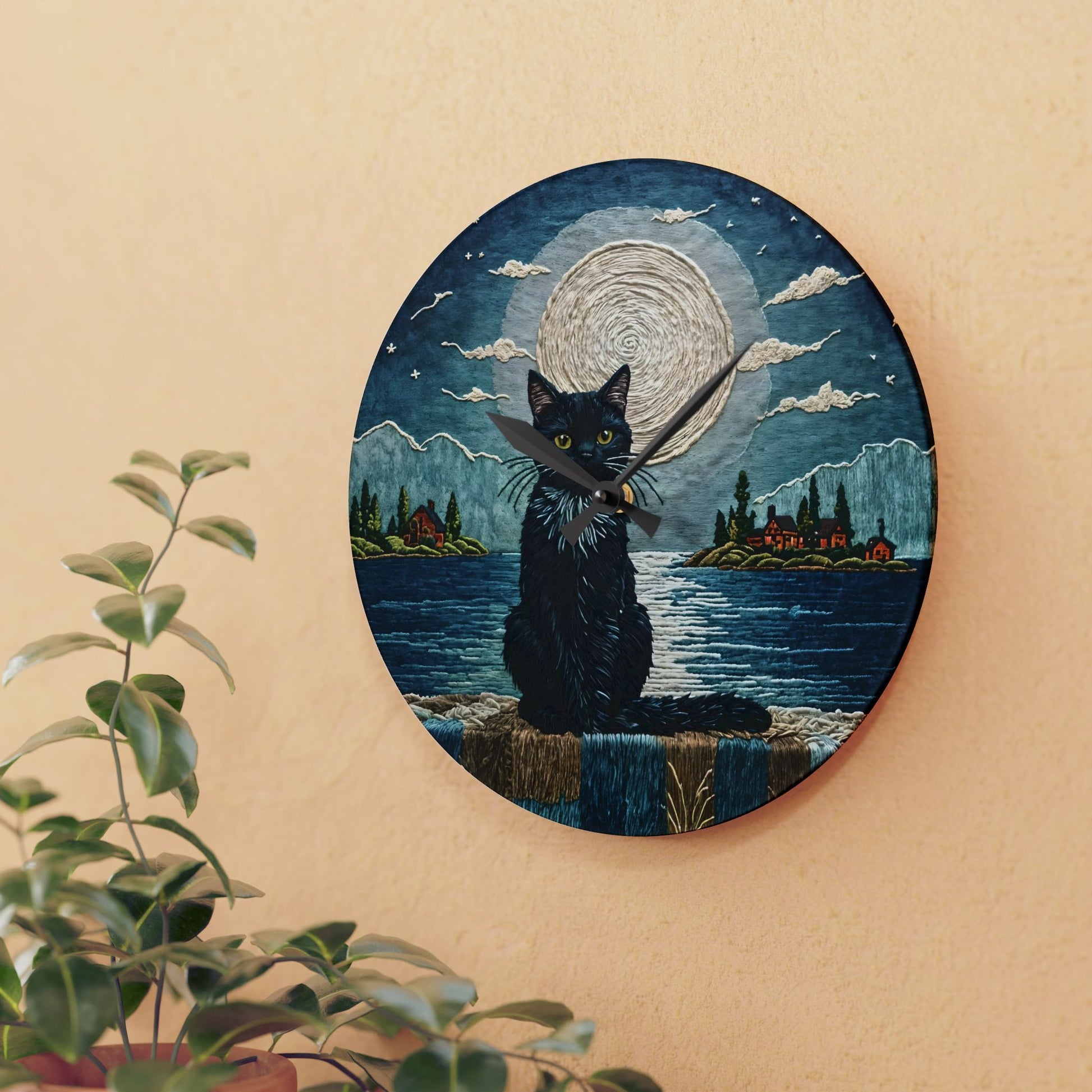 Acrylic Wall Clock - Black Cat Sea Moonlight Art by Fairyhill Studio
