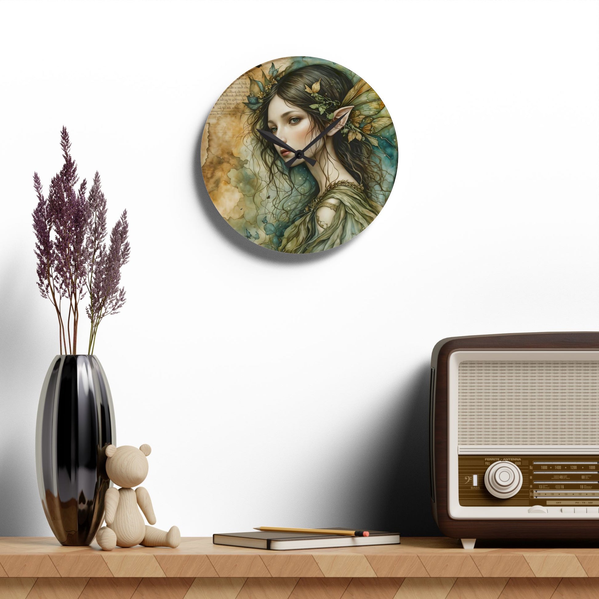 This Wall Clock features a forest fairy/Elf art by Fairyhill Studio, giving off a whimsical and magical vibe. Perfect for fairy tale lovers and fantasy enthusiasts, this clock is relevant for home decor, birthdays, and special occasions.