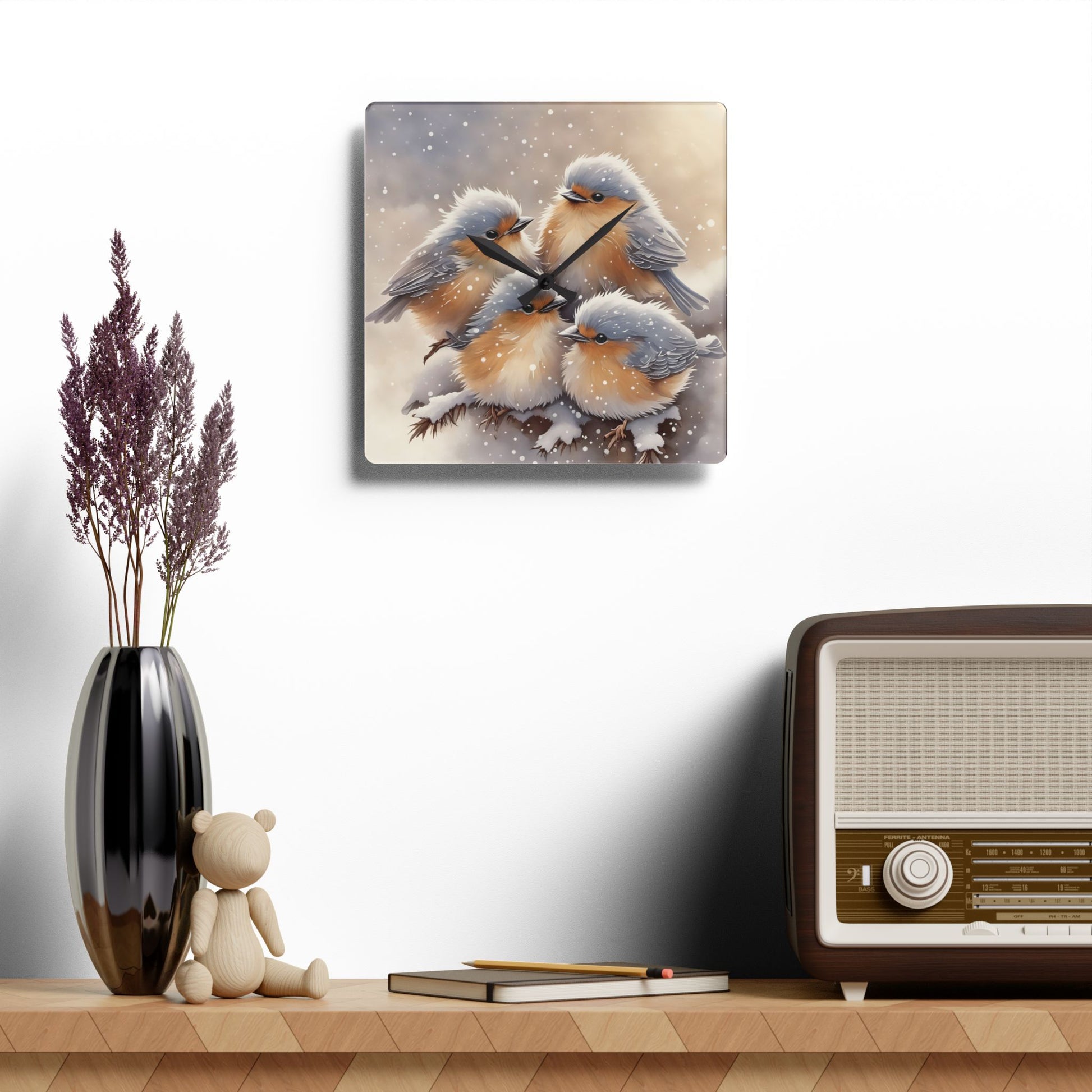 A charming Wall Clock featuring a lovely winter scene with small birds under snow art by Fairyhill studio. This clock adds a touch of whimsy and nature to your home decor, perfect for bird lovers and nature enthusiasts. Ideal for adding a cozy and peaceful atmosphere to your space, suitable for winter and holiday decorations.