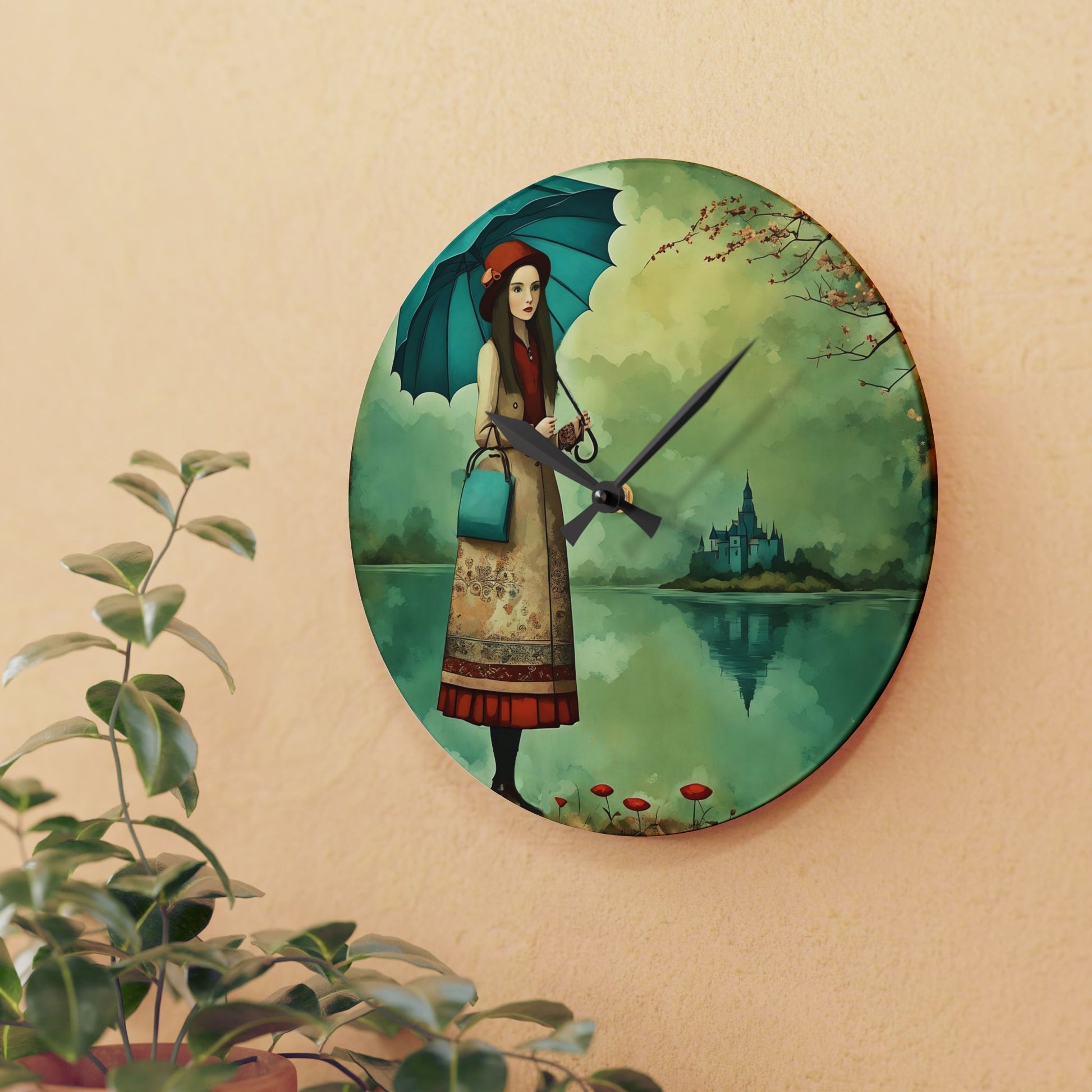 This customized and personalized acrylic wall clock features a beautiful design of a girl with an umbrella by Fairyhill Studio. Perfect as a holiday or birthday gift, this wall clock provides a cozy and whimsical atmosphere to any room. Ideal for those who appreciate unique and artistic decor, this clock will brighten up any space.