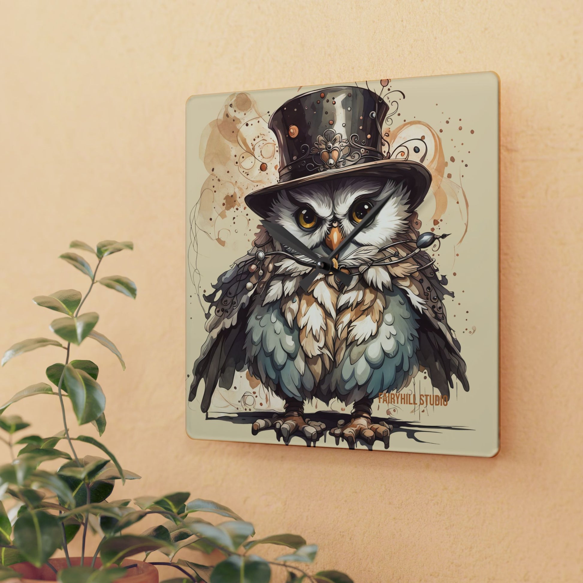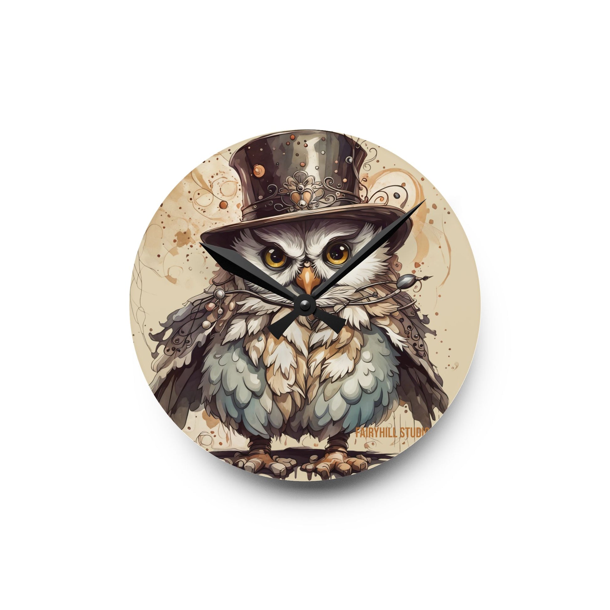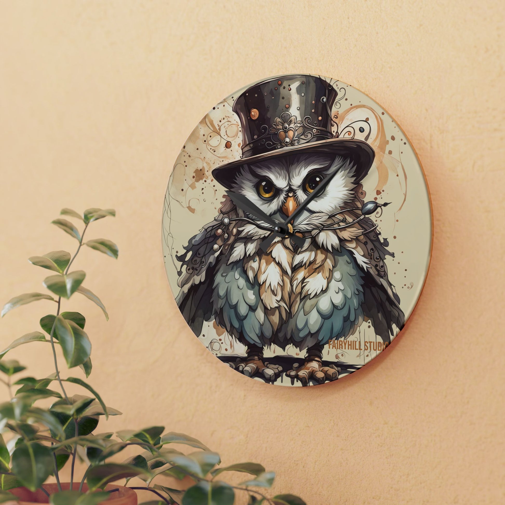 Acrylic Wall Clock - Cute Night Owl Steampunk Art