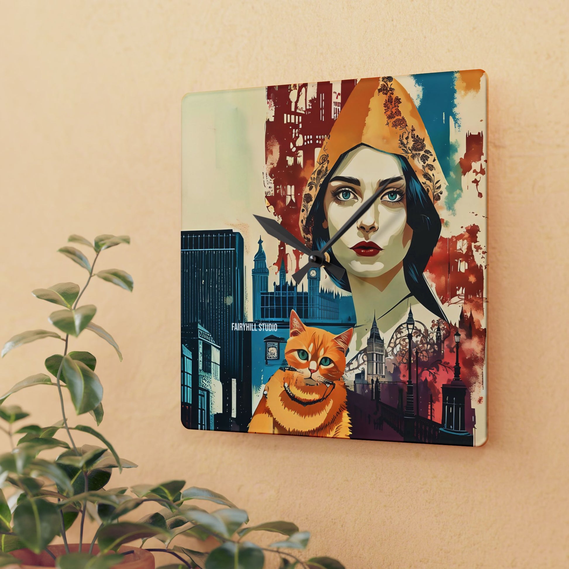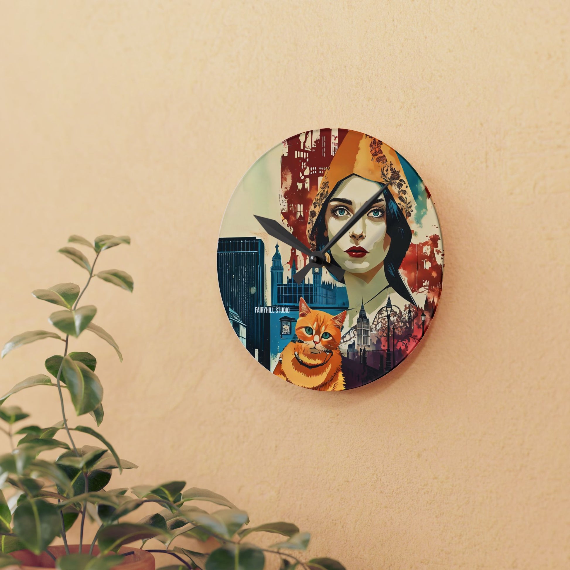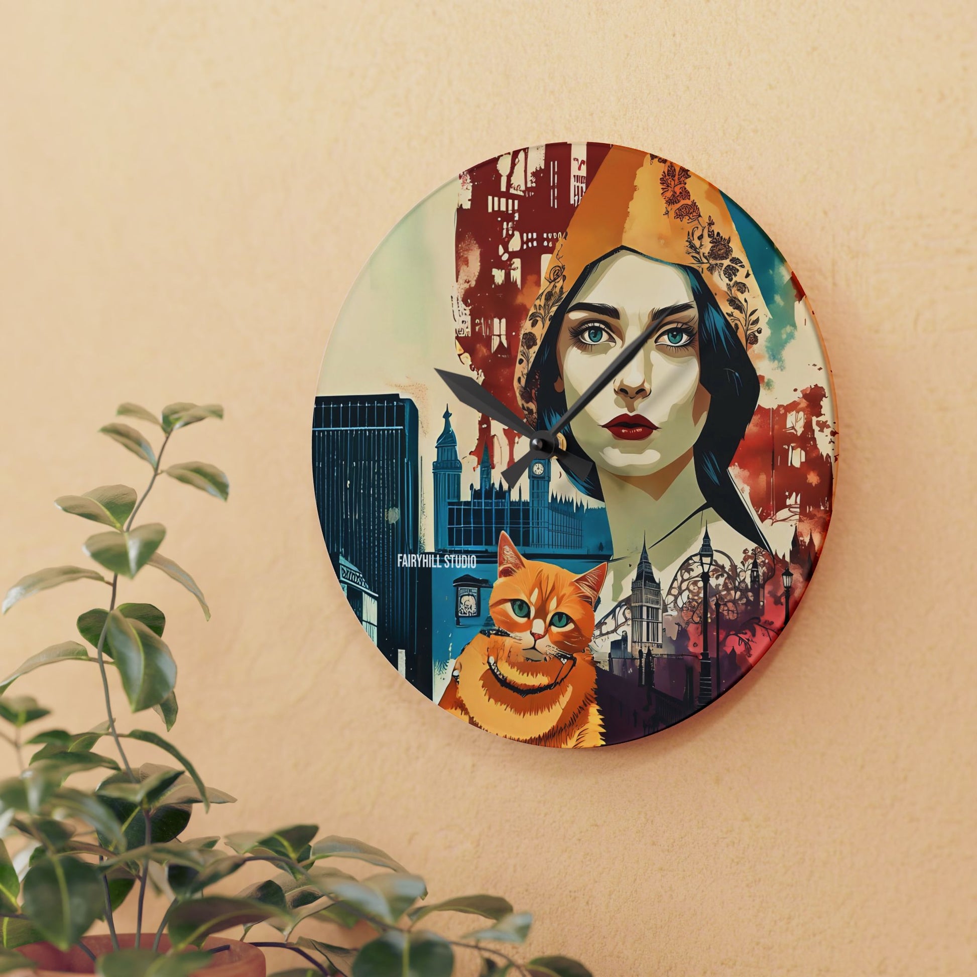 Acrylic Wall Clock - Yellow cat in London /Art
