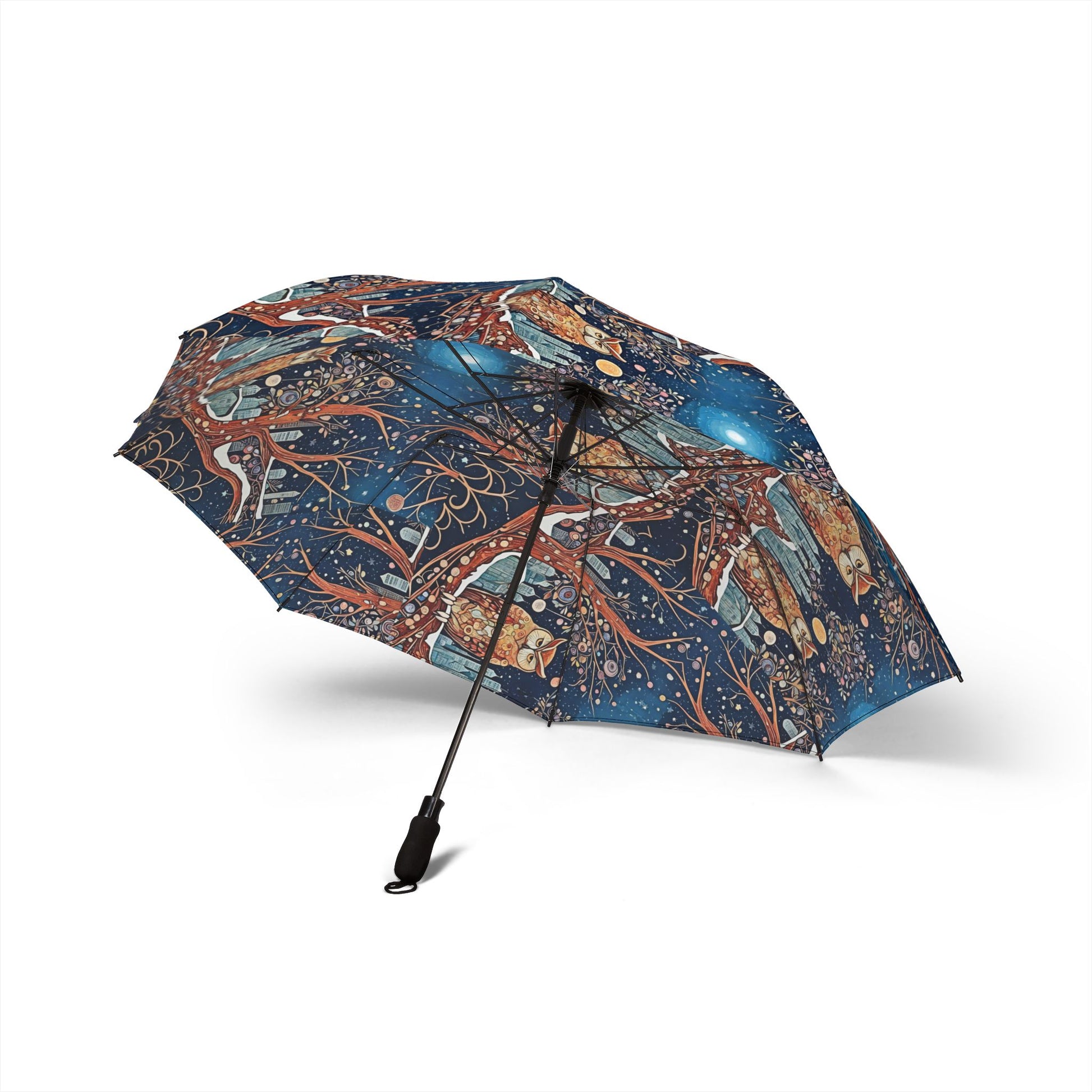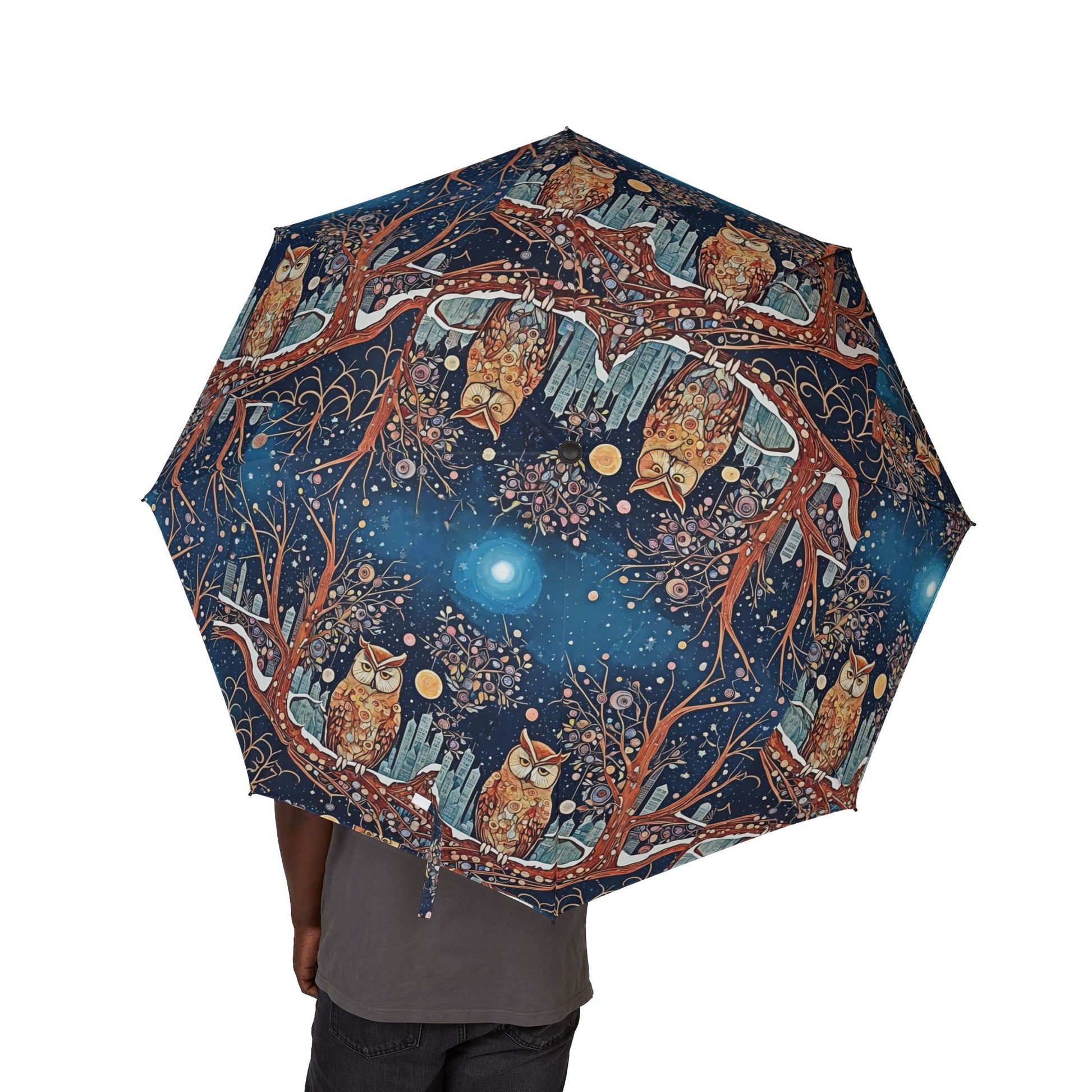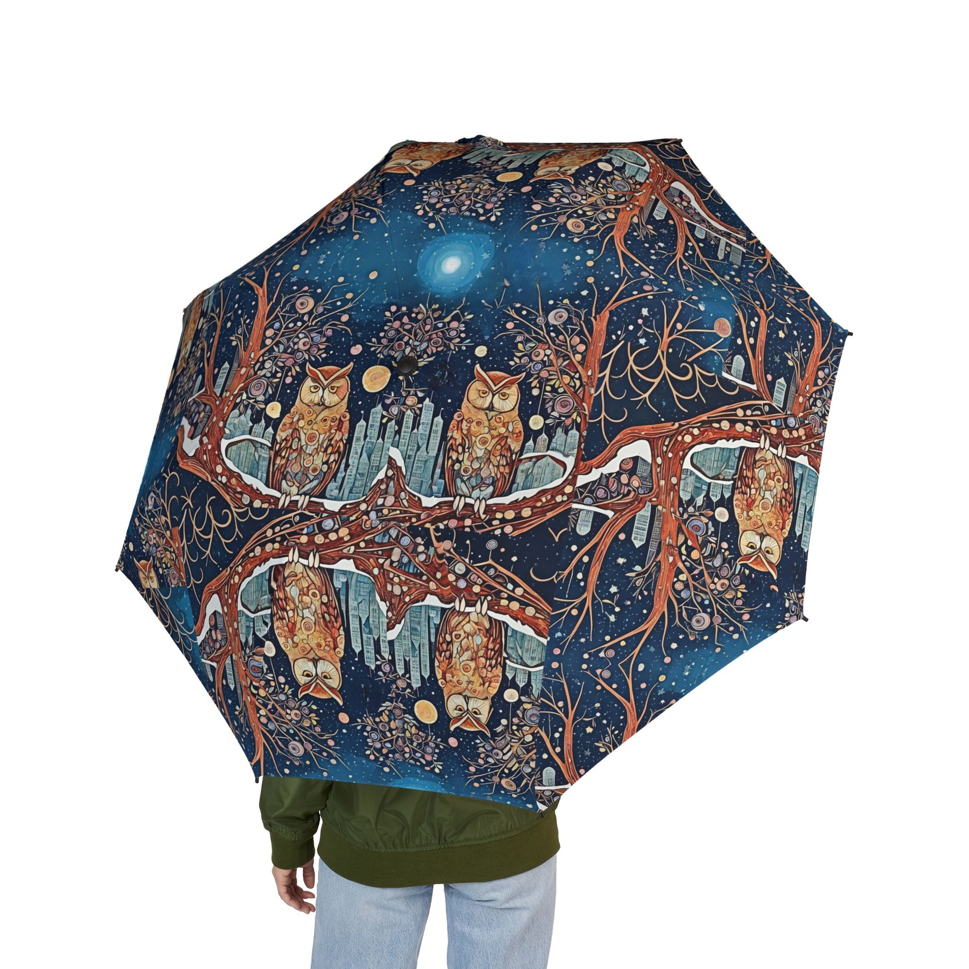Introducing a stylish and functional semi-automatic foldable umbrella that elevates your rainy day experience. With its artistic design featuring whimsical owls and a serene nighttime backdrop, this umbrella brings a touch of enchantment to every gloom-filled day. It offers effortless one-handed operation, making it easy to stay dry without fumbling. Perfect for busy individuals, this umbrella is ideal for commuting, outdoor events, or leisurely strolls in the park. A must-have for nature lovers, owl enthusiasts, or anyone looking to express their unique style, it makes a thoughtful gift for birthdays or holidays. Embrace the beauty of rainy days with a pop of color and character!