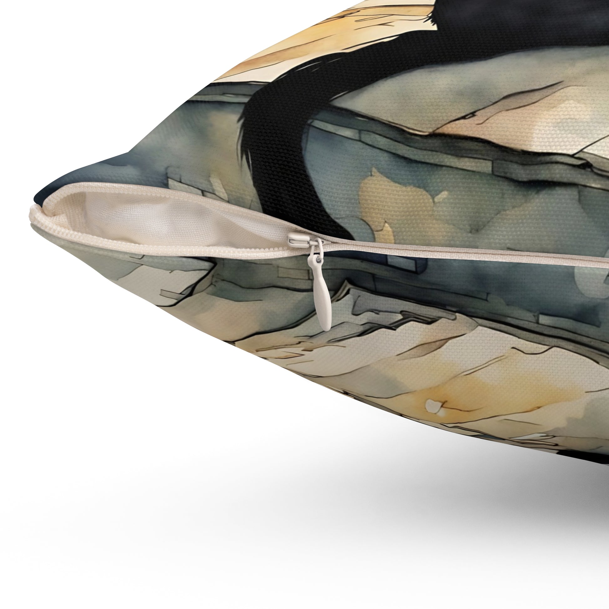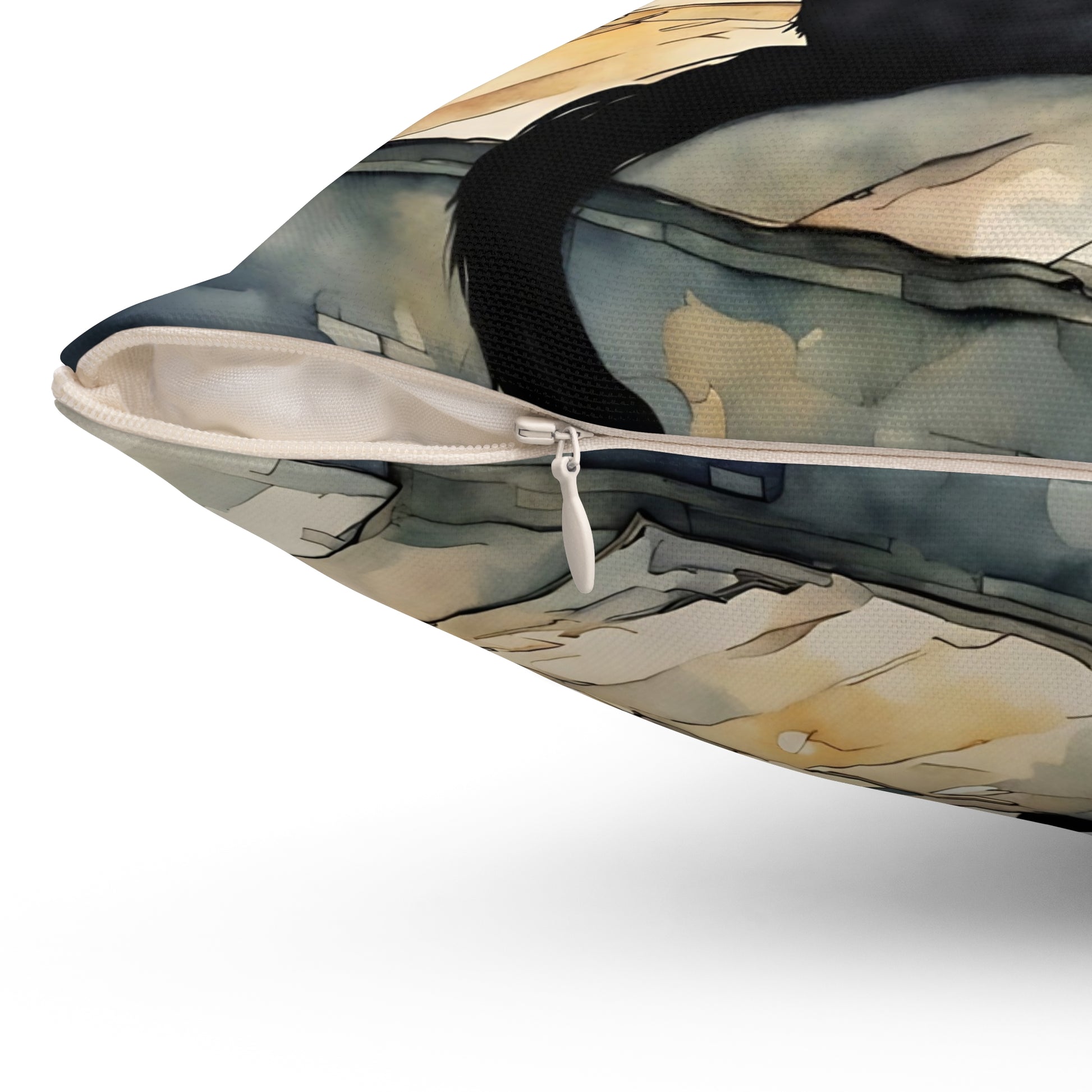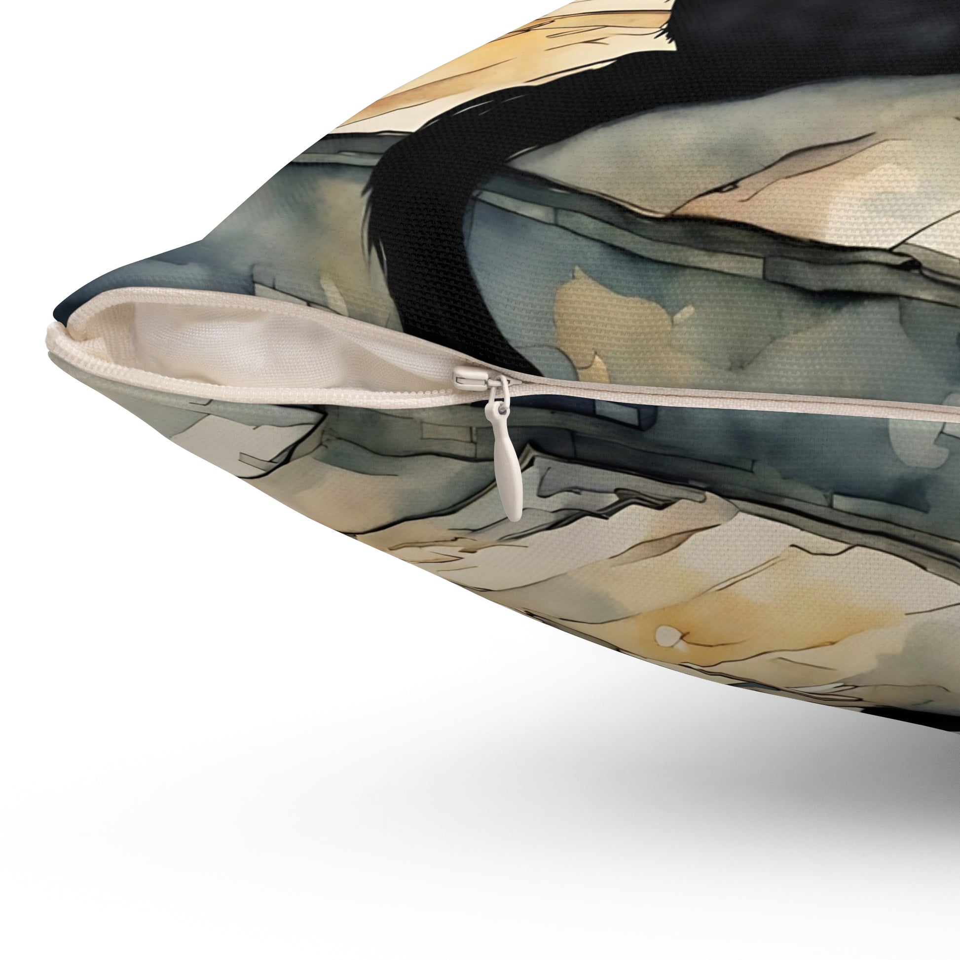 This double-sided printed Black cat Square Pillow - by Fairyhill Studio Square  pillow features a Black cat on a balcony  Square Pillow by fairyhill studio, giving off a whimsical and charming vibe. Perfect for  book art lovers lovers and those who enjoy a touch of whimsy in their decor. Ideal for spring and summer home decor, garden parties, and cat-themed celebrations.