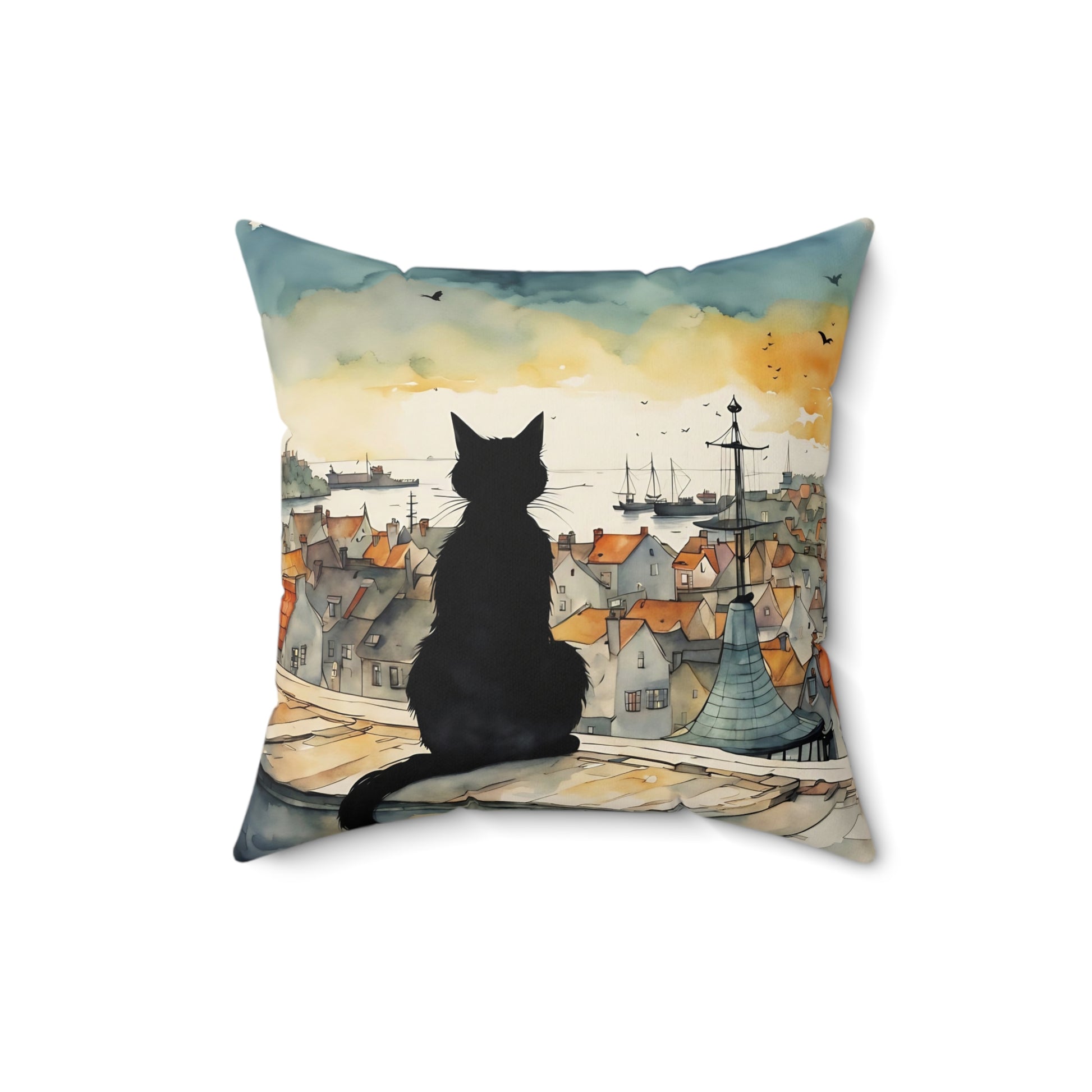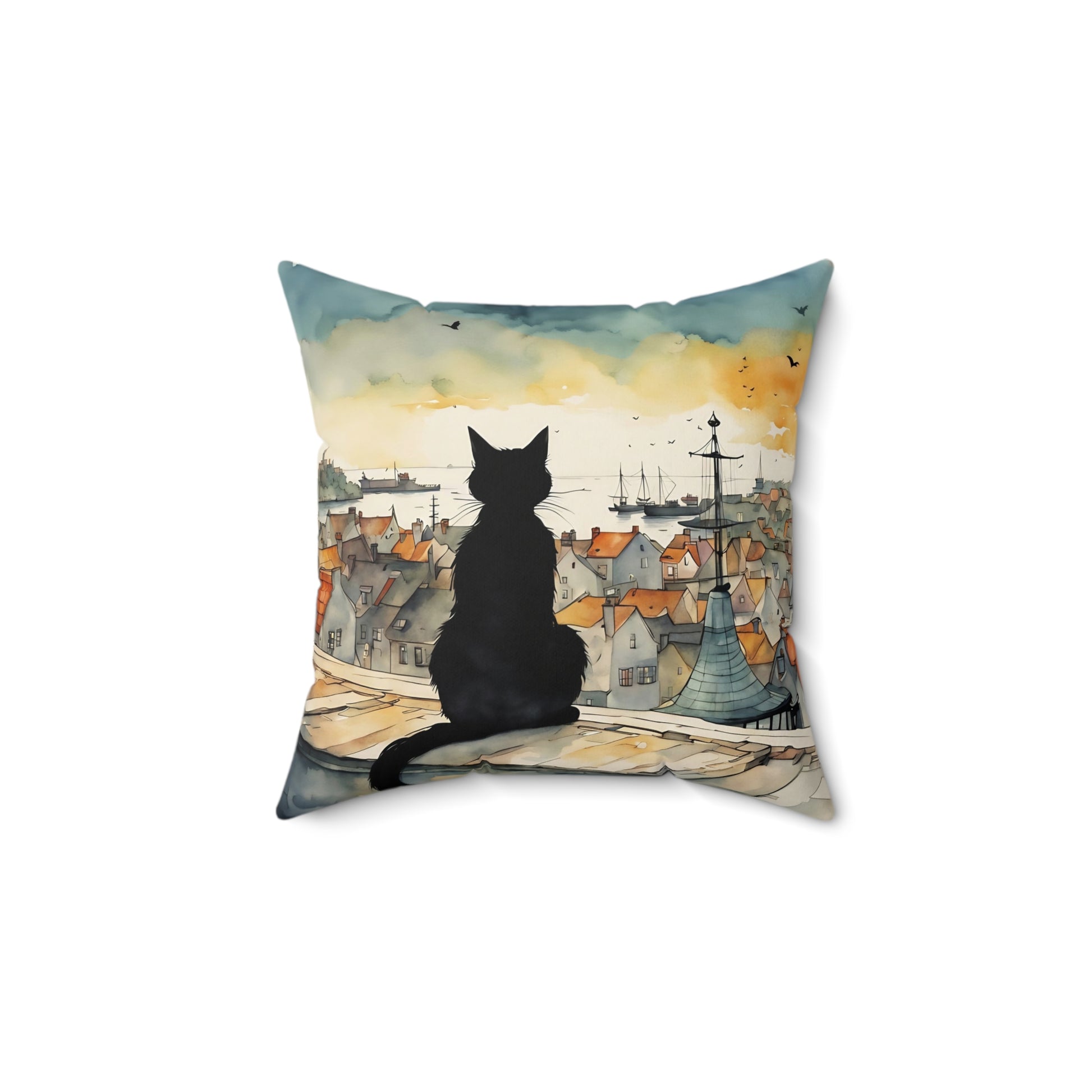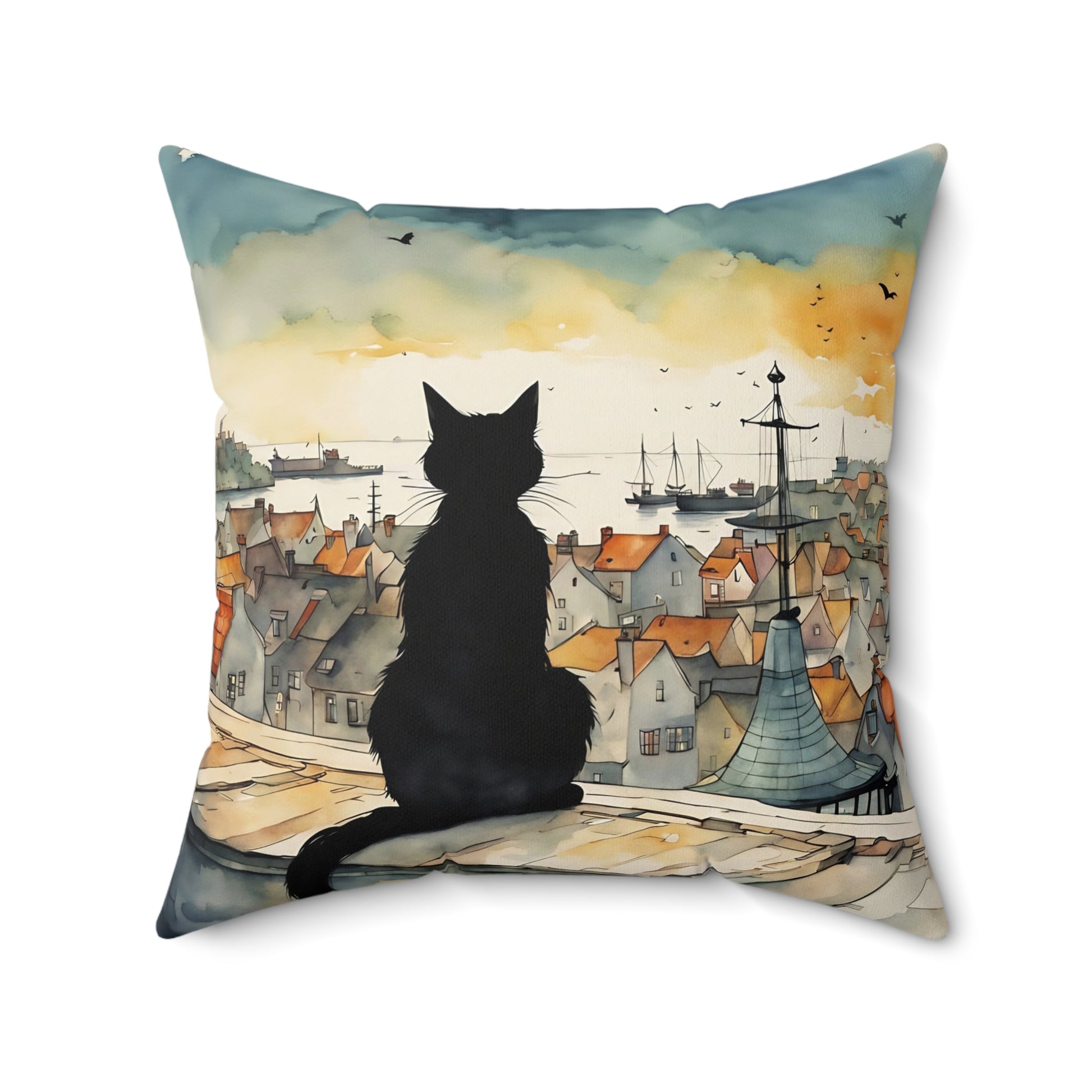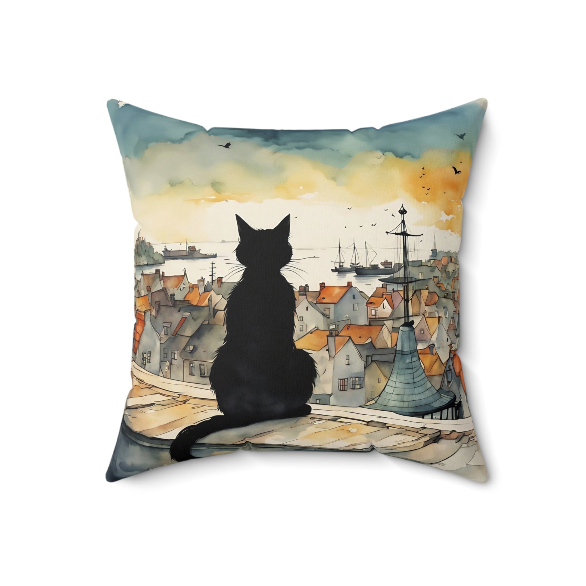 Black cat on a balcony Square Pillow - by Fairyhill Studio