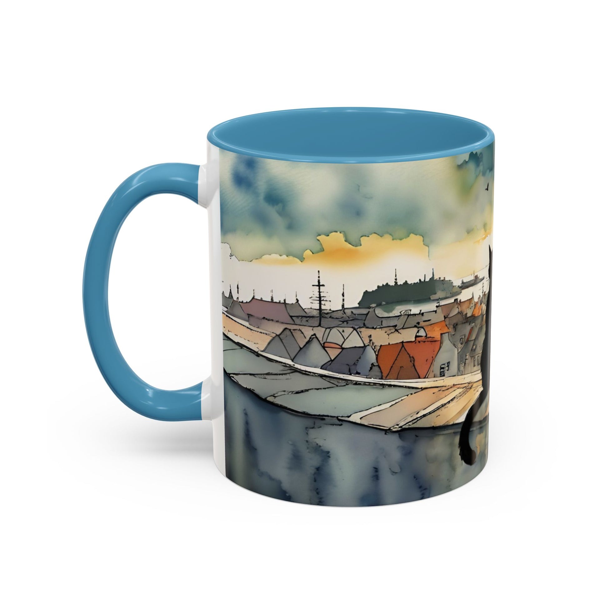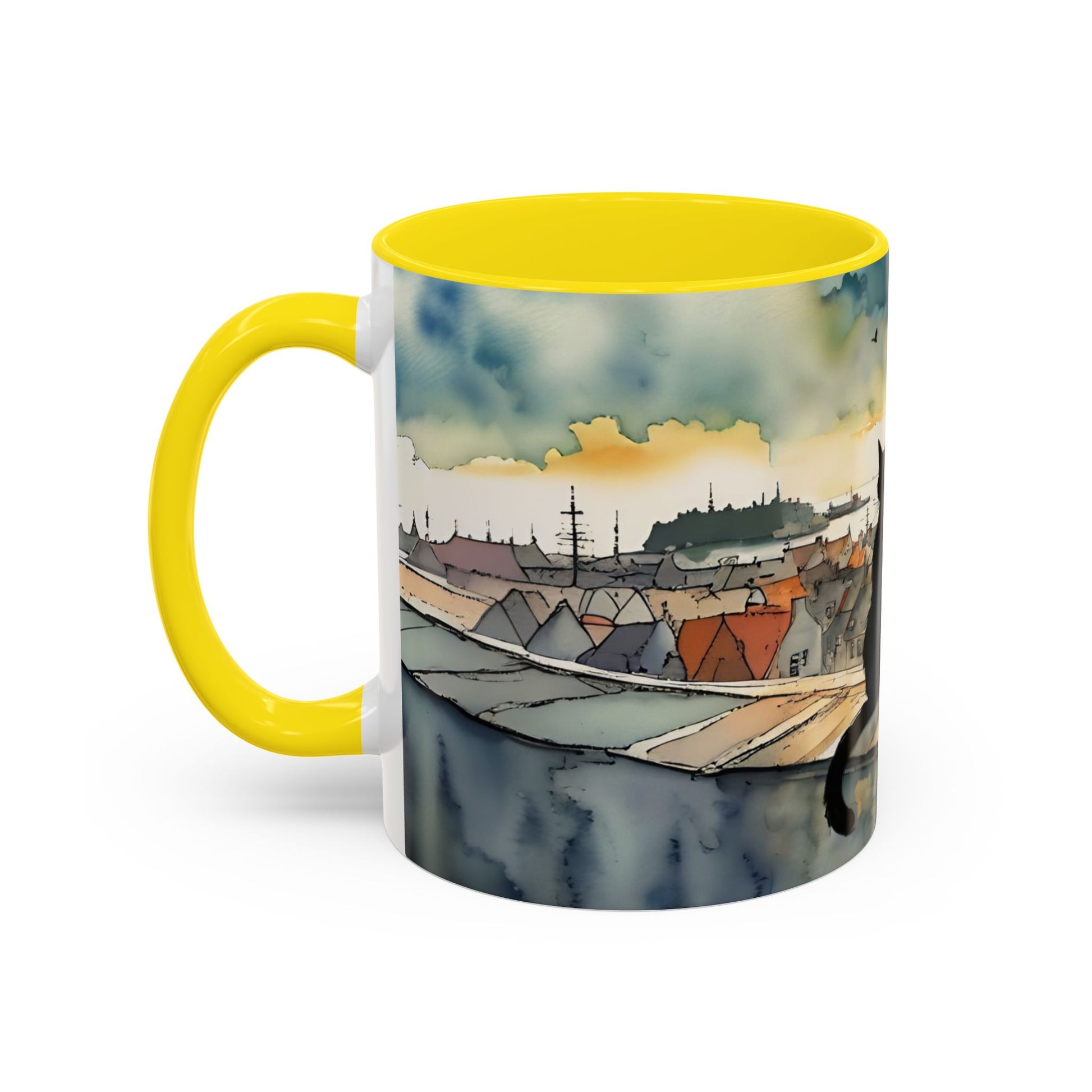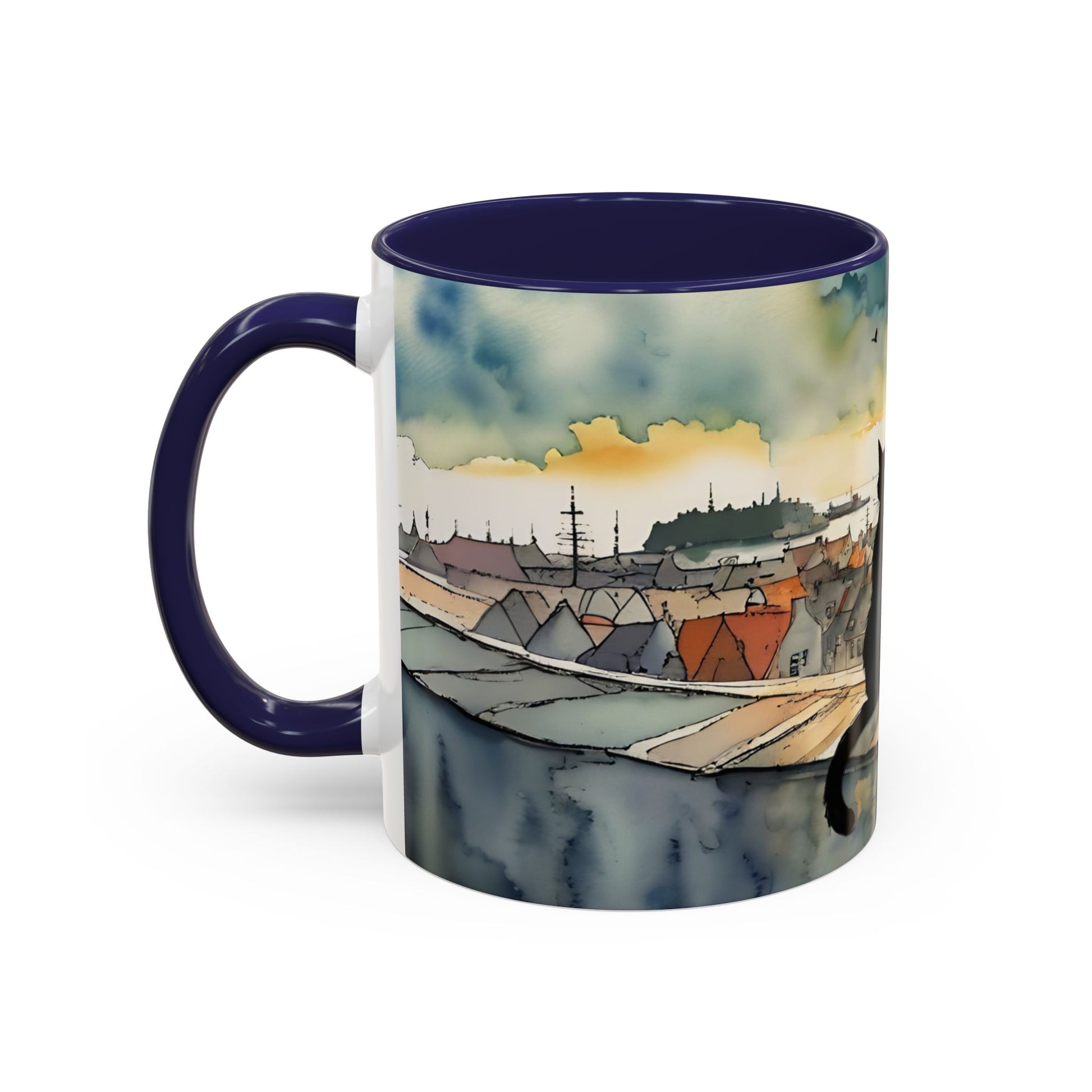Experience your morning brew with a burst of creativity using our vibrant Accent Black cat/Coffee Black cat on a roof top Mug. with a quote featuring a sitting black cat Crafted from high-quality white ceramic, this eye-catching mug features a striking color contrast that transforms your kitchen into a lively café. Perfect for art lovers and coffee enthusiasts, it adds a splash of personality to everyday moments. Enjoy the glossy finish and comfortable C-shaped handle while sipping your favorite beverages, whether you're at home or in the office. Ideal for gifting during holidays, housewarmings, or celebrations with friends and family. Elevate your coffee experience and brighten up your day with this stunning mug!