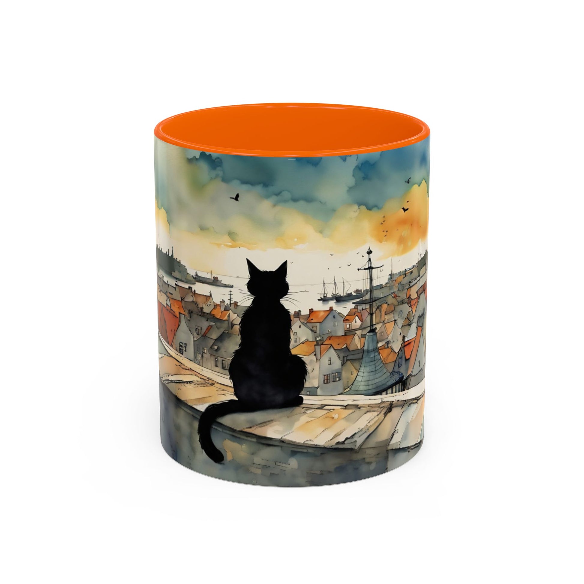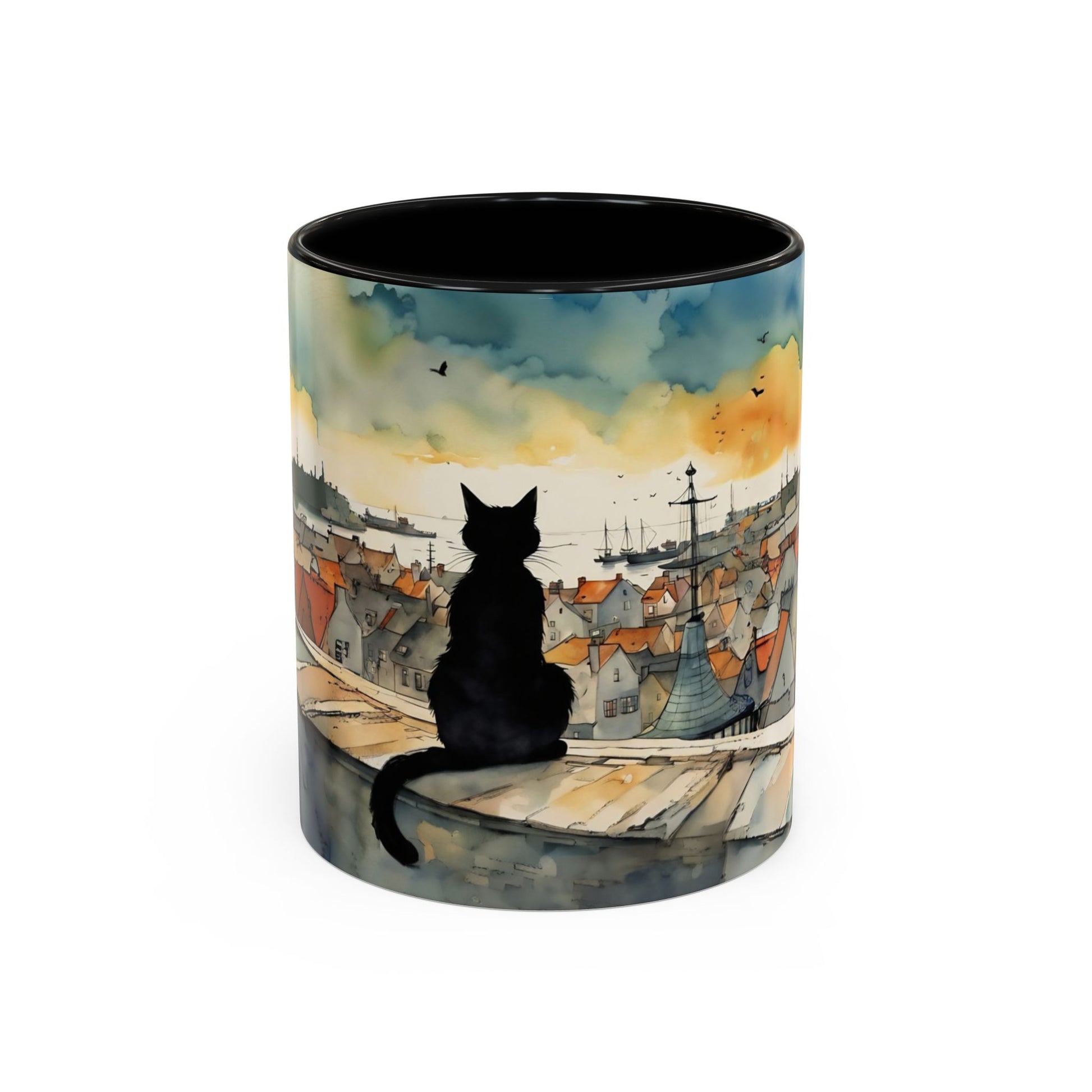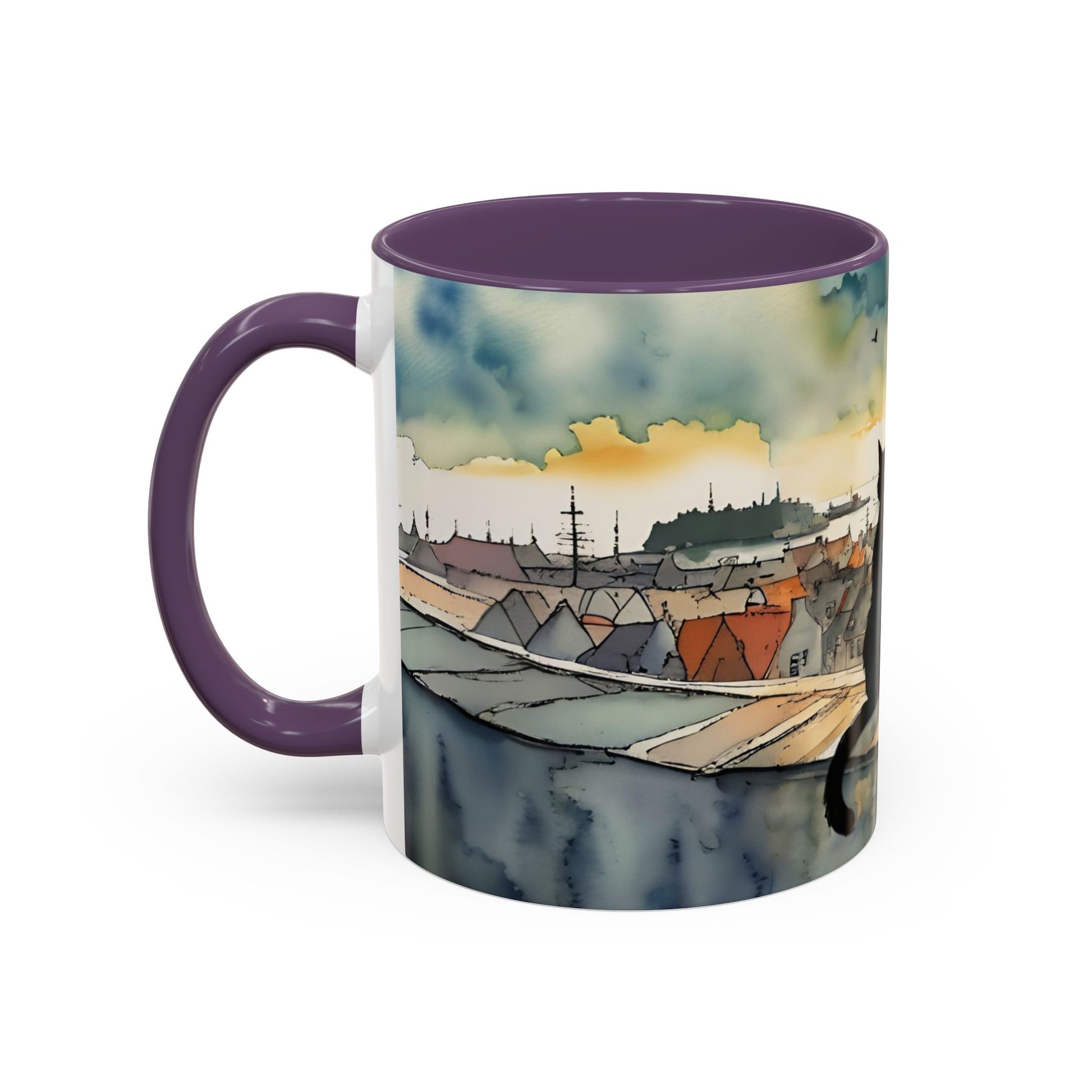 Experience your morning brew with a burst of creativity using our vibrant Accent Black cat/Coffee Black cat on a roof top Mug. with a quote featuring a sitting black cat Crafted from high-quality white ceramic, this eye-catching mug features a striking color contrast that transforms your kitchen into a lively café. Perfect for art lovers and coffee enthusiasts, it adds a splash of personality to everyday moments. Enjoy the glossy finish and comfortable C-shaped handle while sipping your favorite beverages, whether you're at home or in the office. Ideal for gifting during holidays, housewarmings, or celebrations with friends and family. Elevate your coffee experience and brighten up your day with this stunning mug!