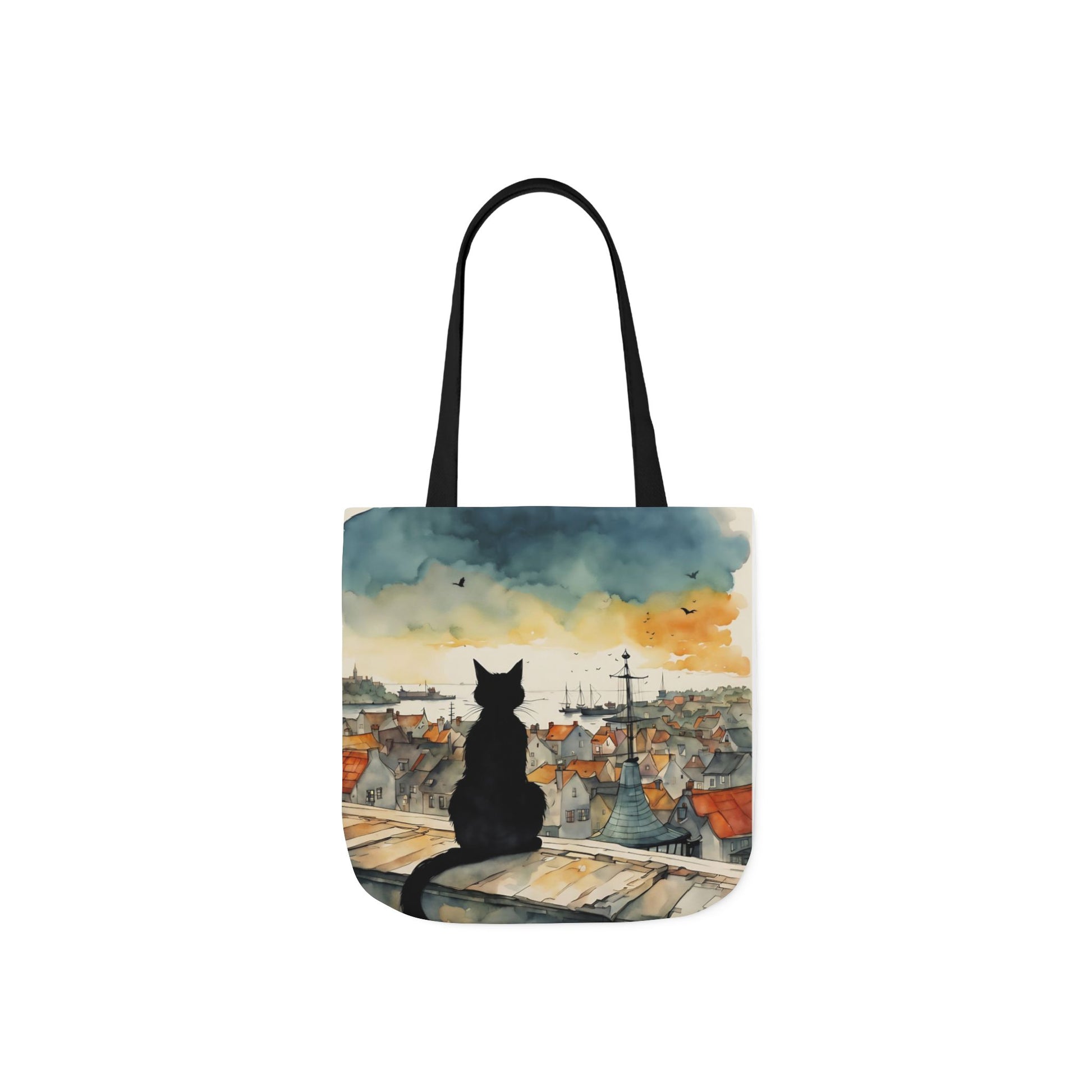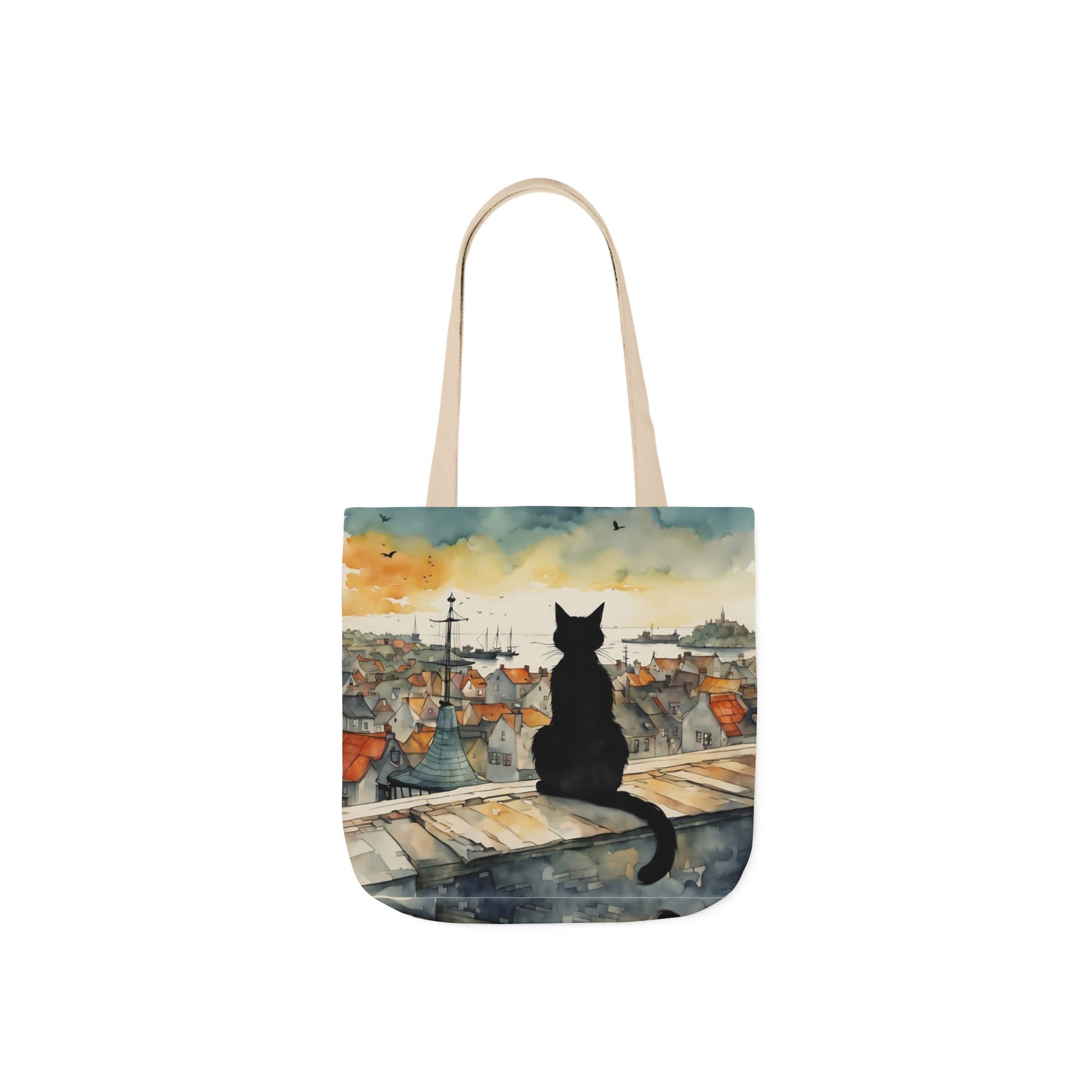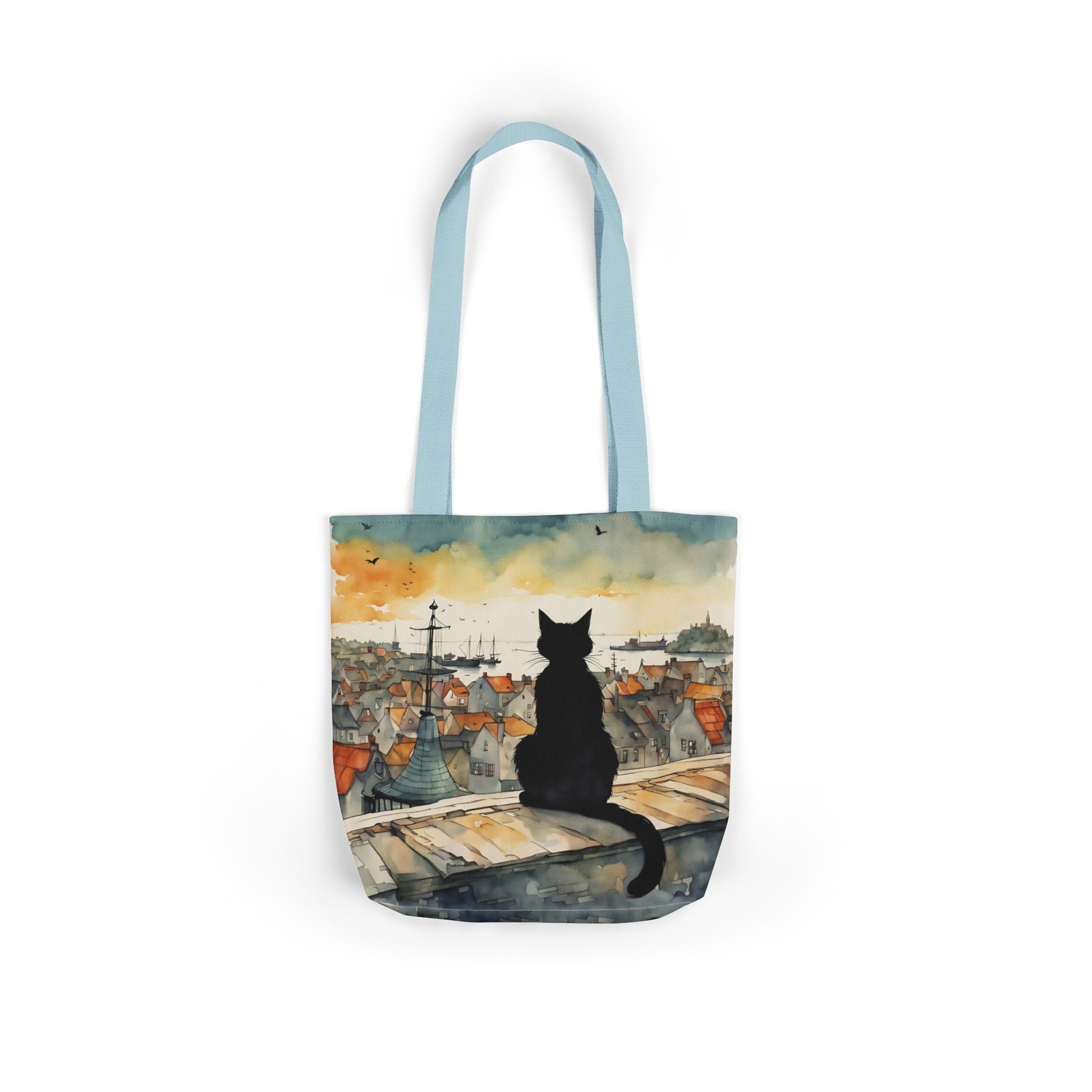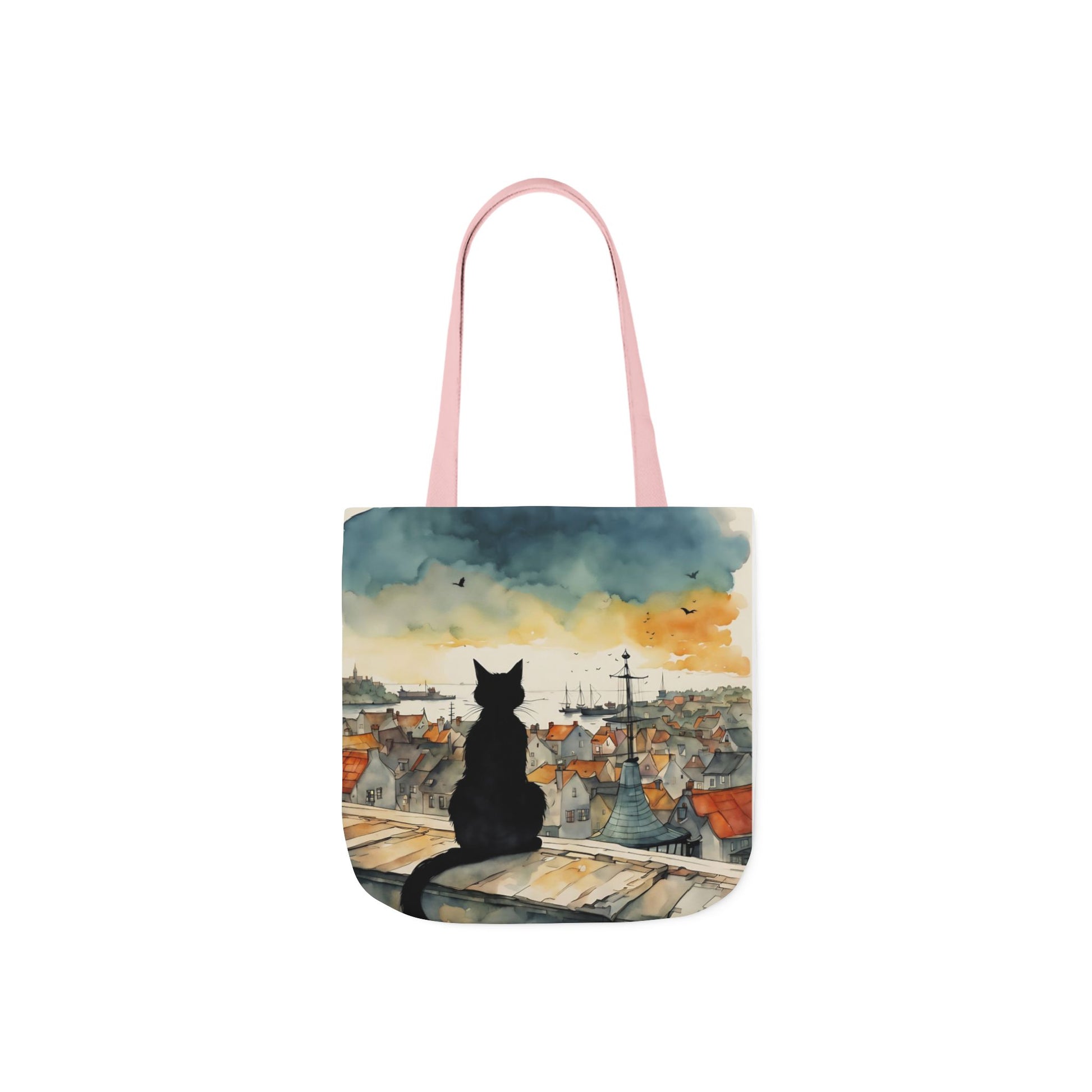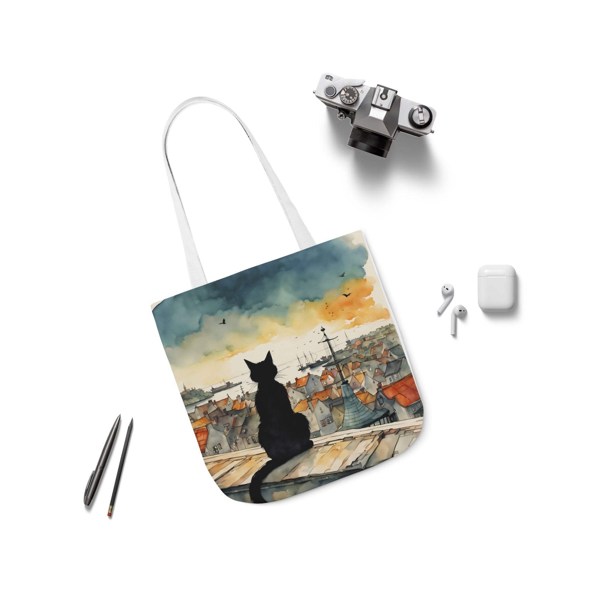 Elevate your everyday style with this Black cat on a rooftop vibrant Canvas Tote Bag. Crafted from luxuriously soft 100% polyester canvas, it features a stunning all-over print that showcases bold colors and unique designs, perfect for making a statement wherever you go. This tote bag effortlessly blends functionality with flair, making it ideal for daily errands, beach days, or city adventures. With its spacious interior and boxed corners, it provides ample room for your essentials while the five color strap options let you express your personal style. This bag is perfect for art lovers, eco-conscious shoppers, and anyone who enjoys adding a splash of color to their life. Whether you're celebrating a birthday, gearing up for a summer festival, or just treating yourself, this Canvas Tote Bag is a must-have accessory for every occasion.