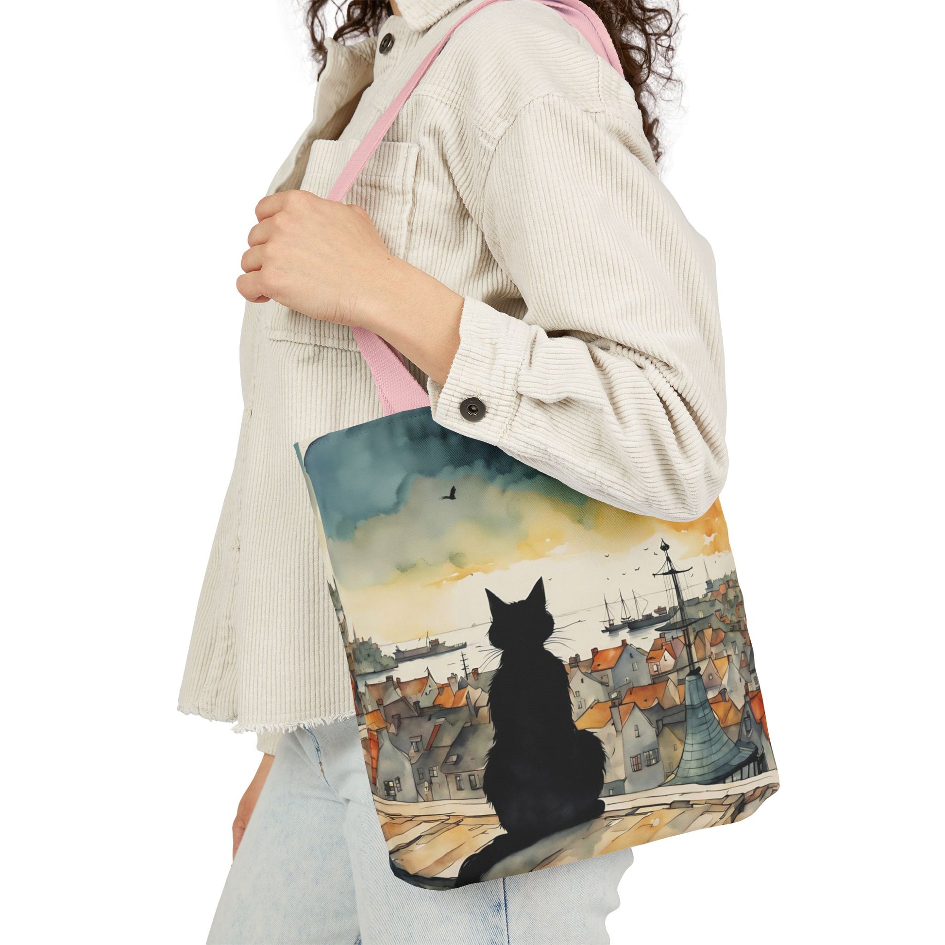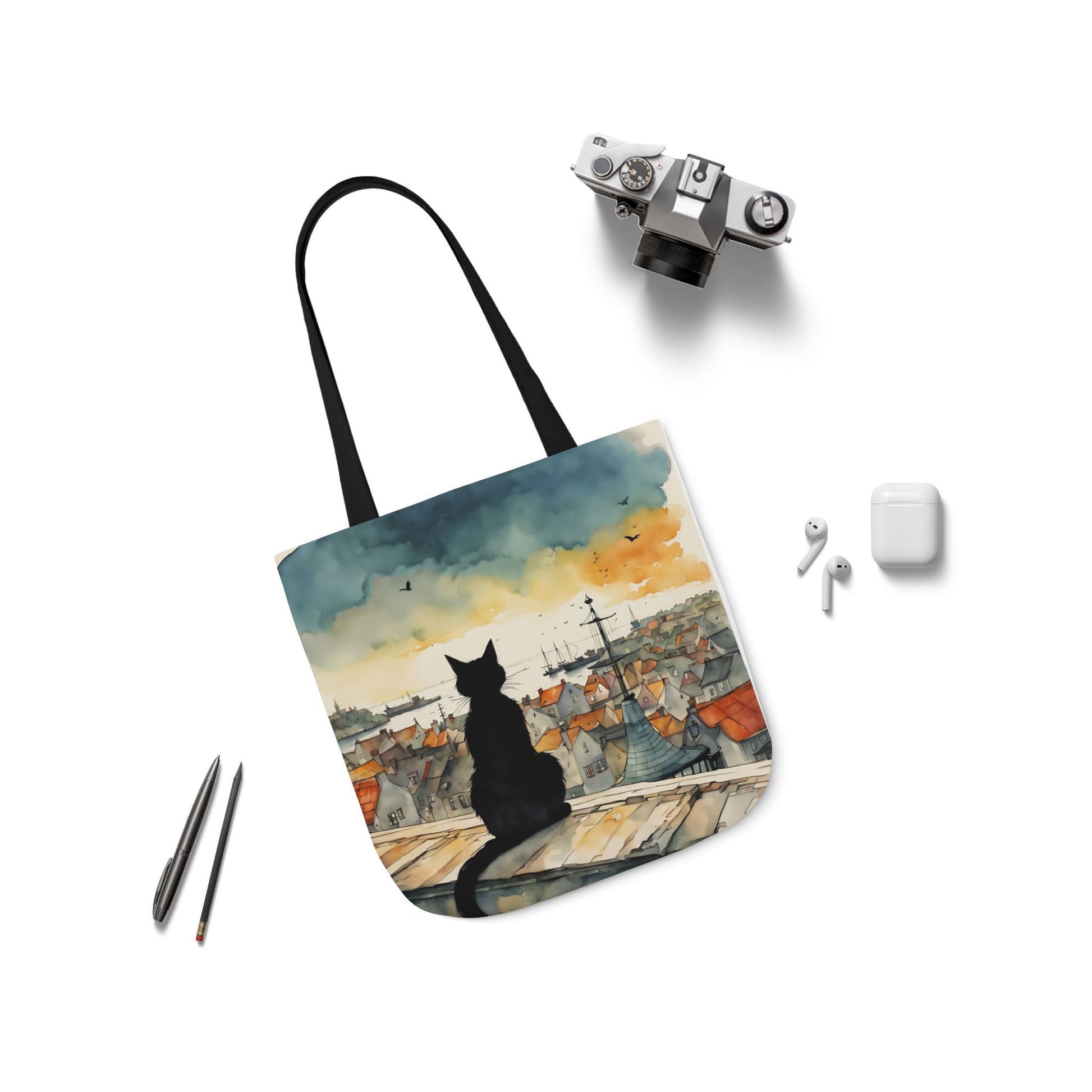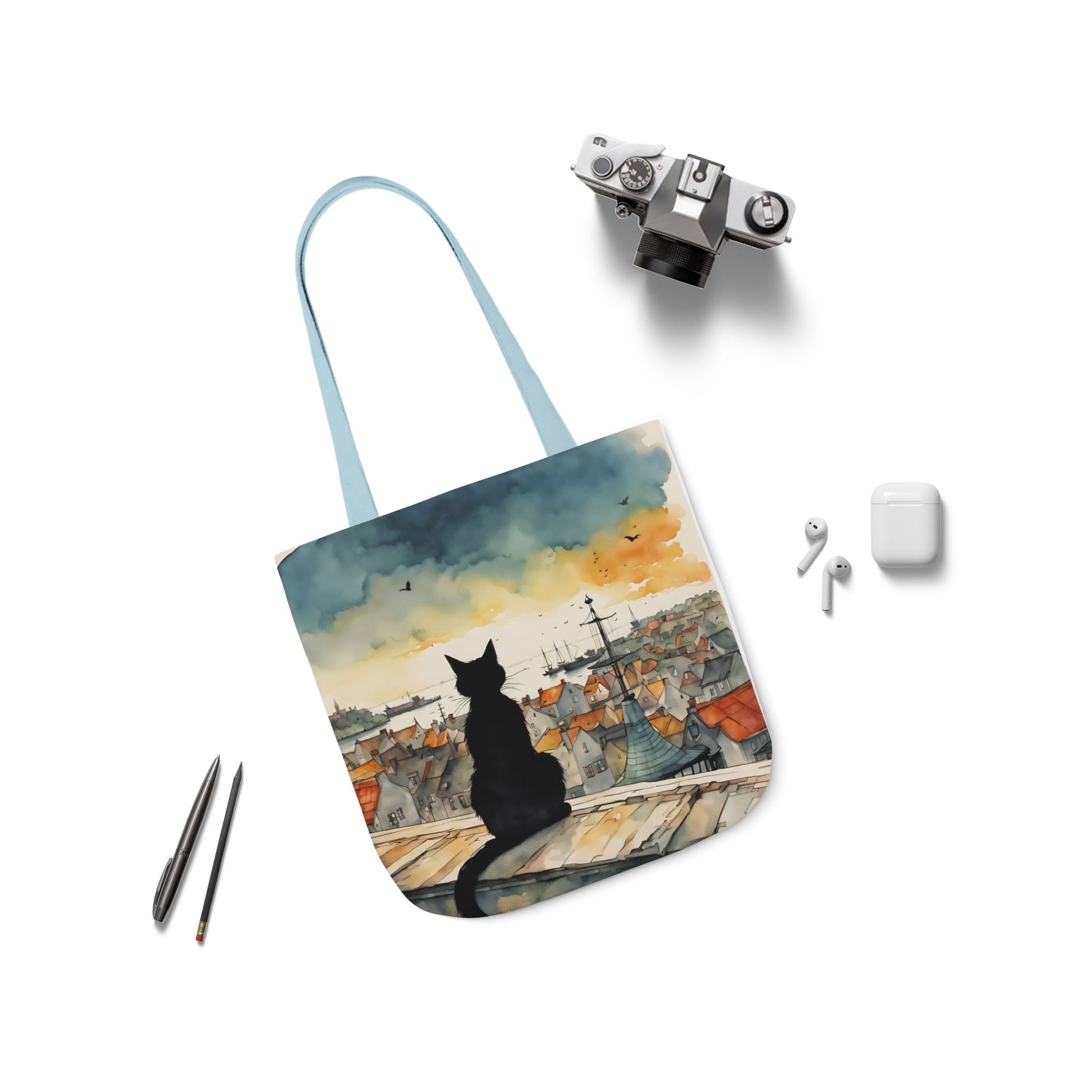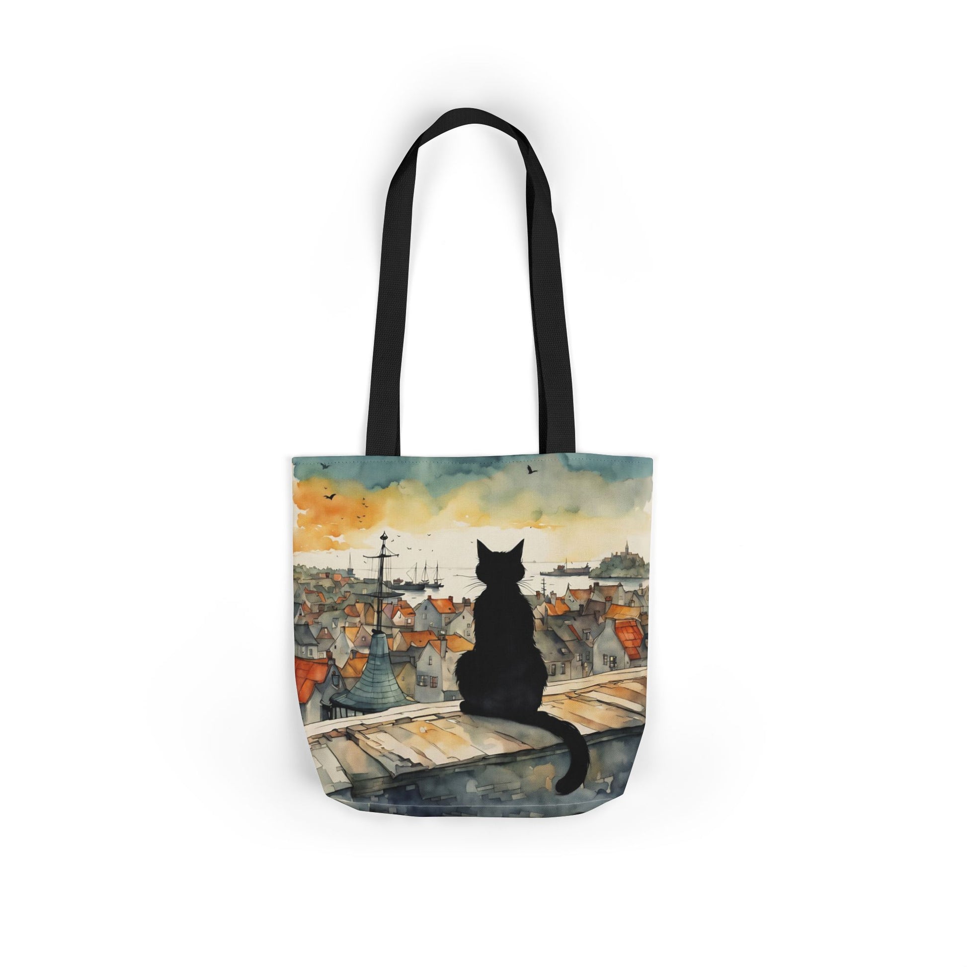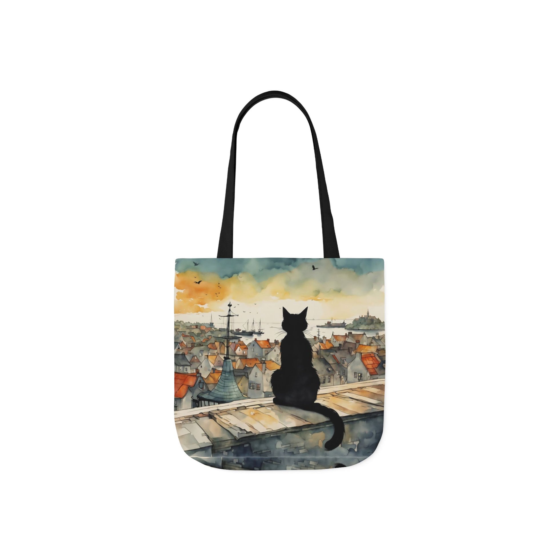 Elevate your everyday style with this Black cat on a rooftop vibrant Canvas Tote Bag. Crafted from luxuriously soft 100% polyester canvas, it features a stunning all-over print that showcases bold colors and unique designs, perfect for making a statement wherever you go. This tote bag effortlessly blends functionality with flair, making it ideal for daily errands, beach days, or city adventures. With its spacious interior and boxed corners, it provides ample room for your essentials while the five color strap options let you express your personal style. This bag is perfect for art lovers, eco-conscious shoppers, and anyone who enjoys adding a splash of color to their life. Whether you're celebrating a birthday, gearing up for a summer festival, or just treating yourself, this Canvas Tote Bag is a must-have accessory for every occasion.