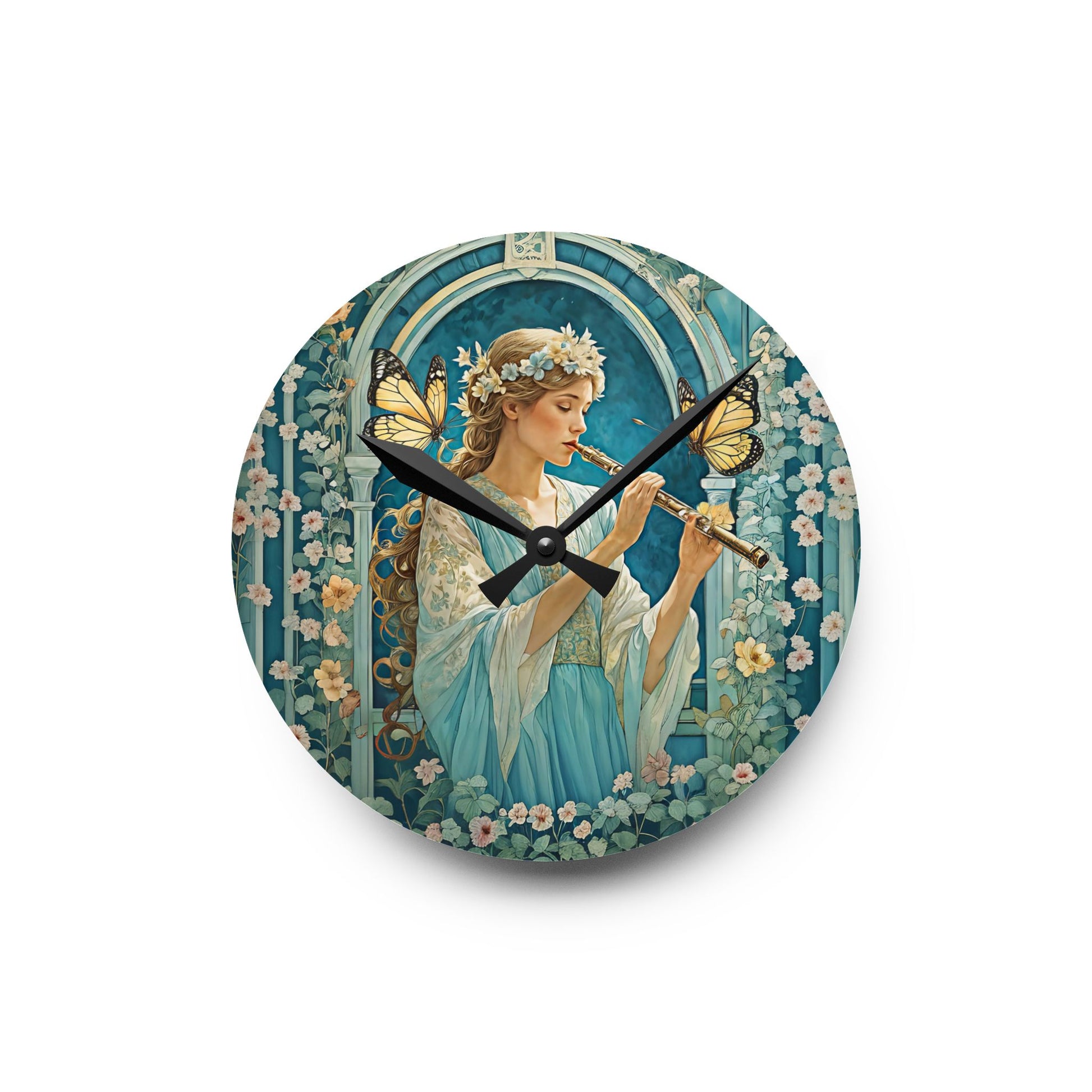 Bring the serene and magical feeling of Summer into your home with this Acrylic Wall Clock featuring a Butterfly / Flute player art by Fairyhill. Perfect for winter lovers and holiday enthusiasts, this wall clock adds a touch of whimsy and nature to any room.