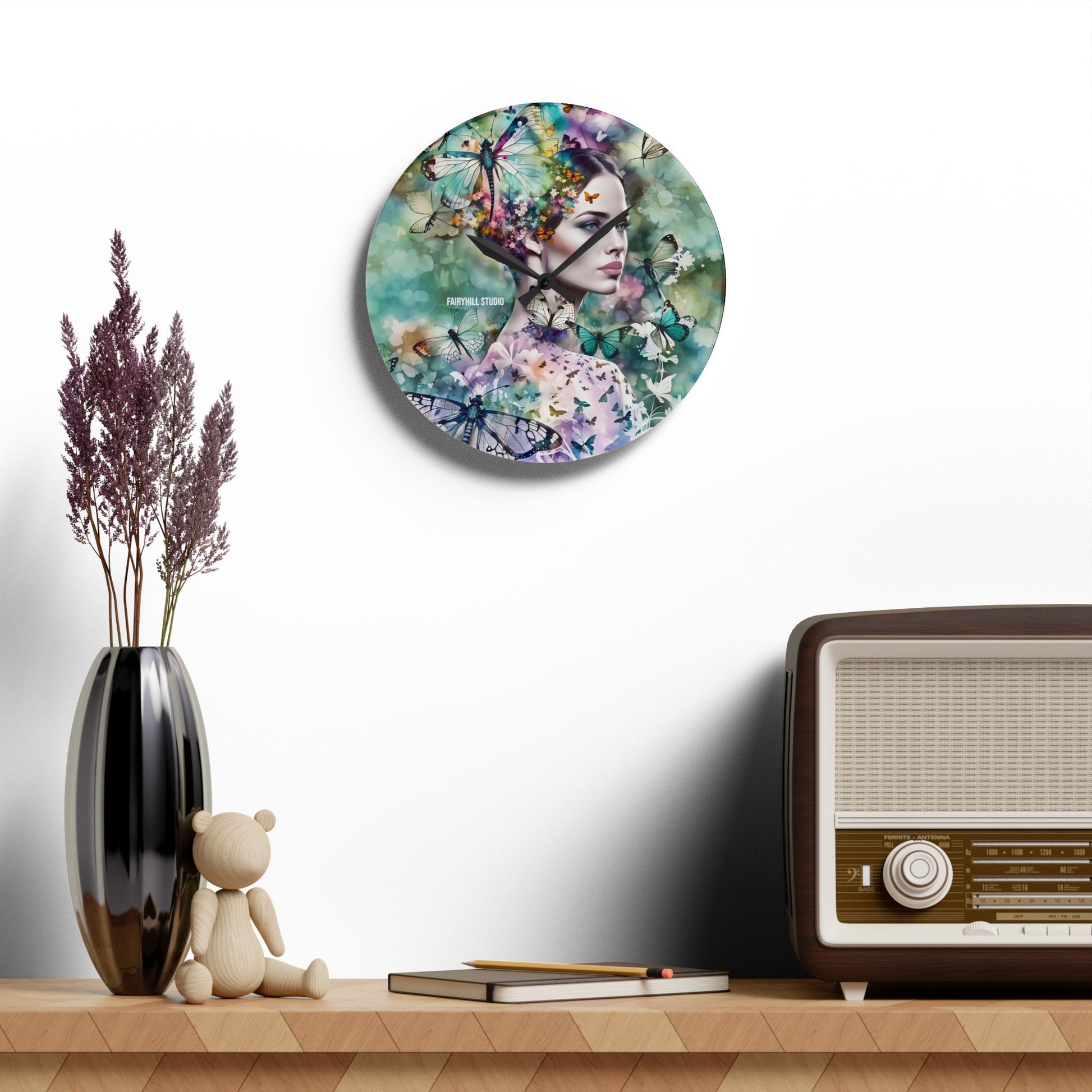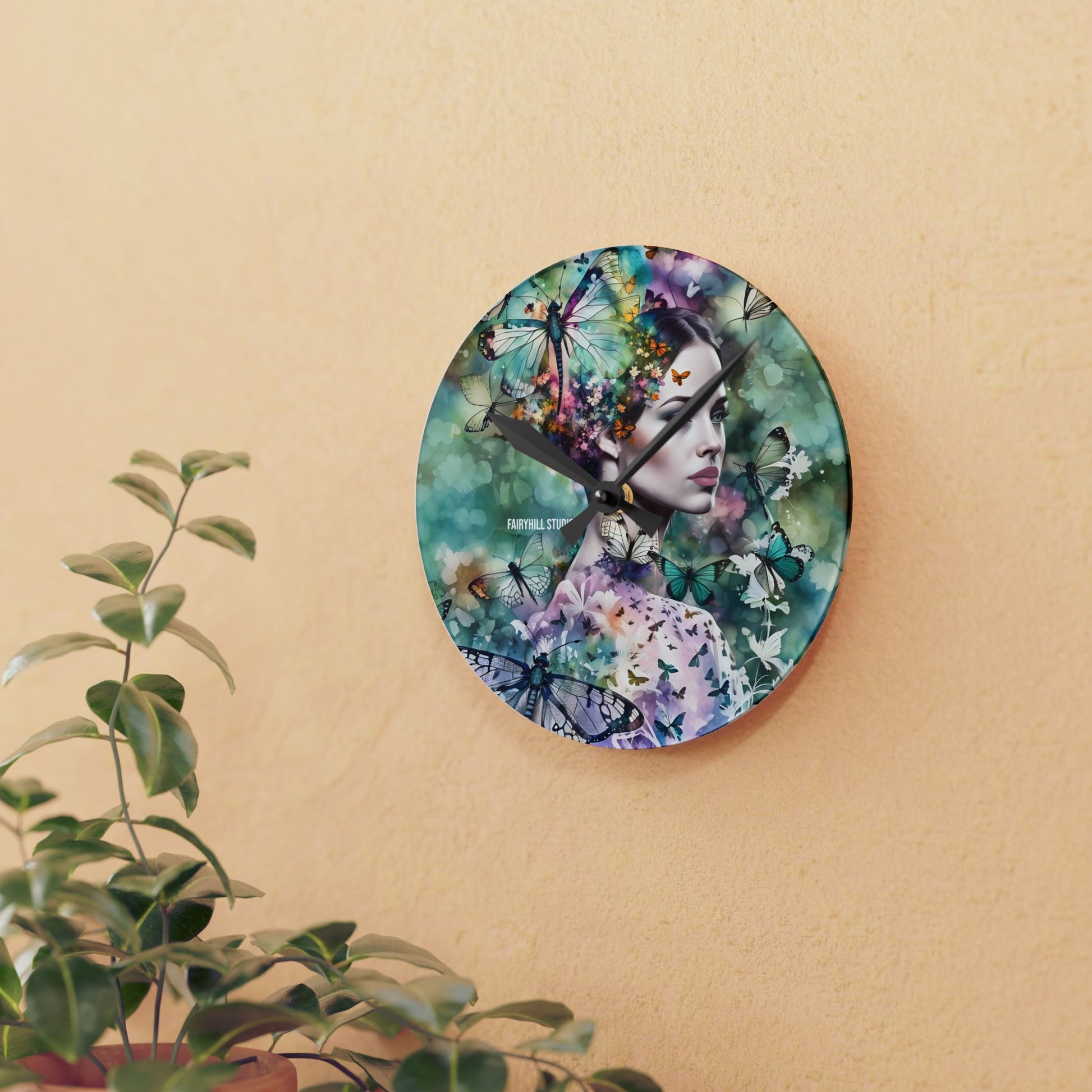Add a touch of elegance to your home with this Acrylic Wall Clock featuring a beautiful lady with large butterflies in Butterfly Sanctuary. Perfect for nature lovers and those who appreciate art, this wall clock brings a peaceful and serene vibe to any room. Ideal for gifting on birthdays, Mother's Day, and housewarmings.
