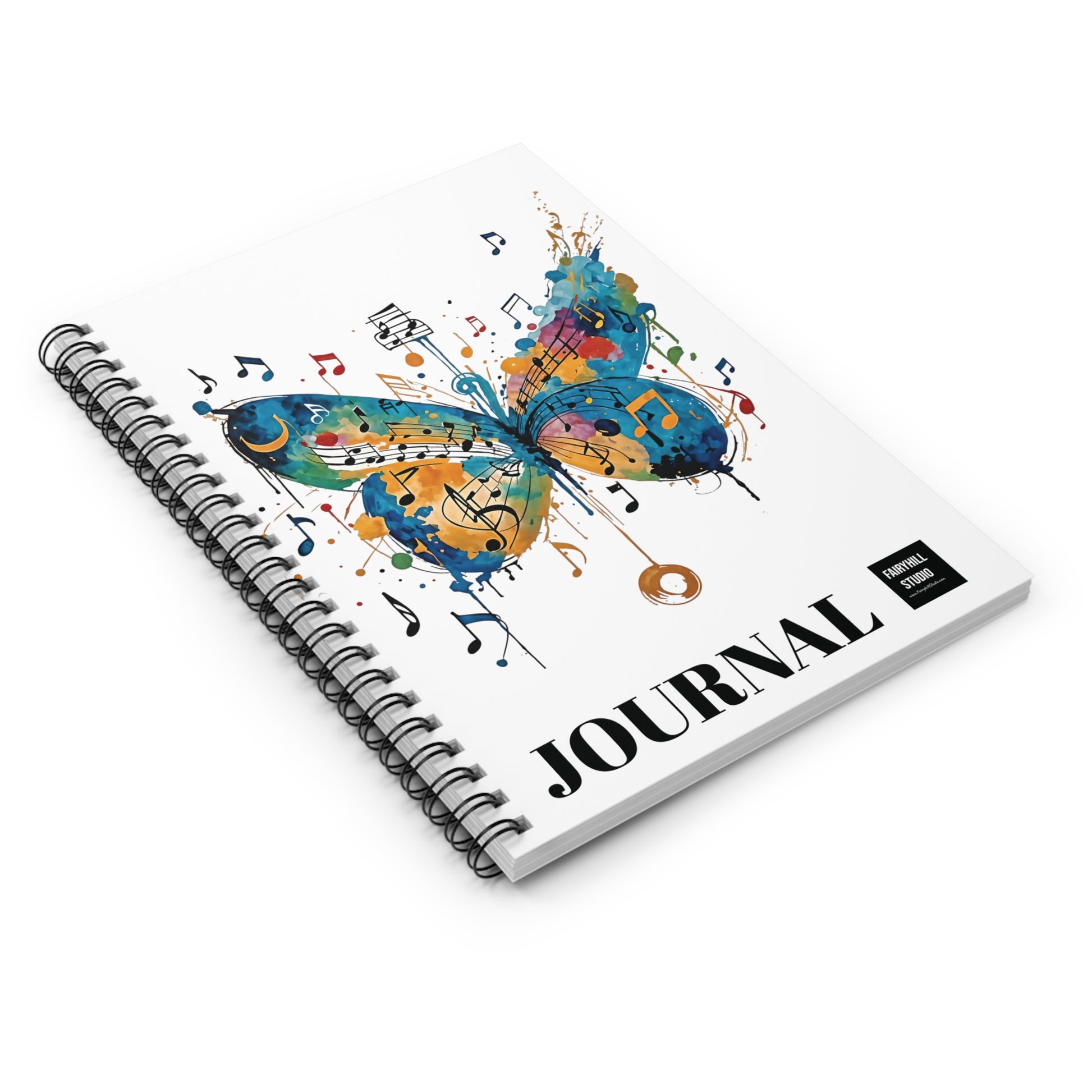 A Spiral Notebook journal featuring beautiful butterfly art with music notes by Fairyhill studio, perfect for writing down thoughts and ideas. The ruled line pages provide structure while the metal spiral binding adds a fancy touch. This notebook is ideal for creative individuals looking to add a touch of whimsy to their everyday life. Perfect for students, artists, and music lovers. Great for back to school, birthdays, or as a thoughtful gift for any occasion.
