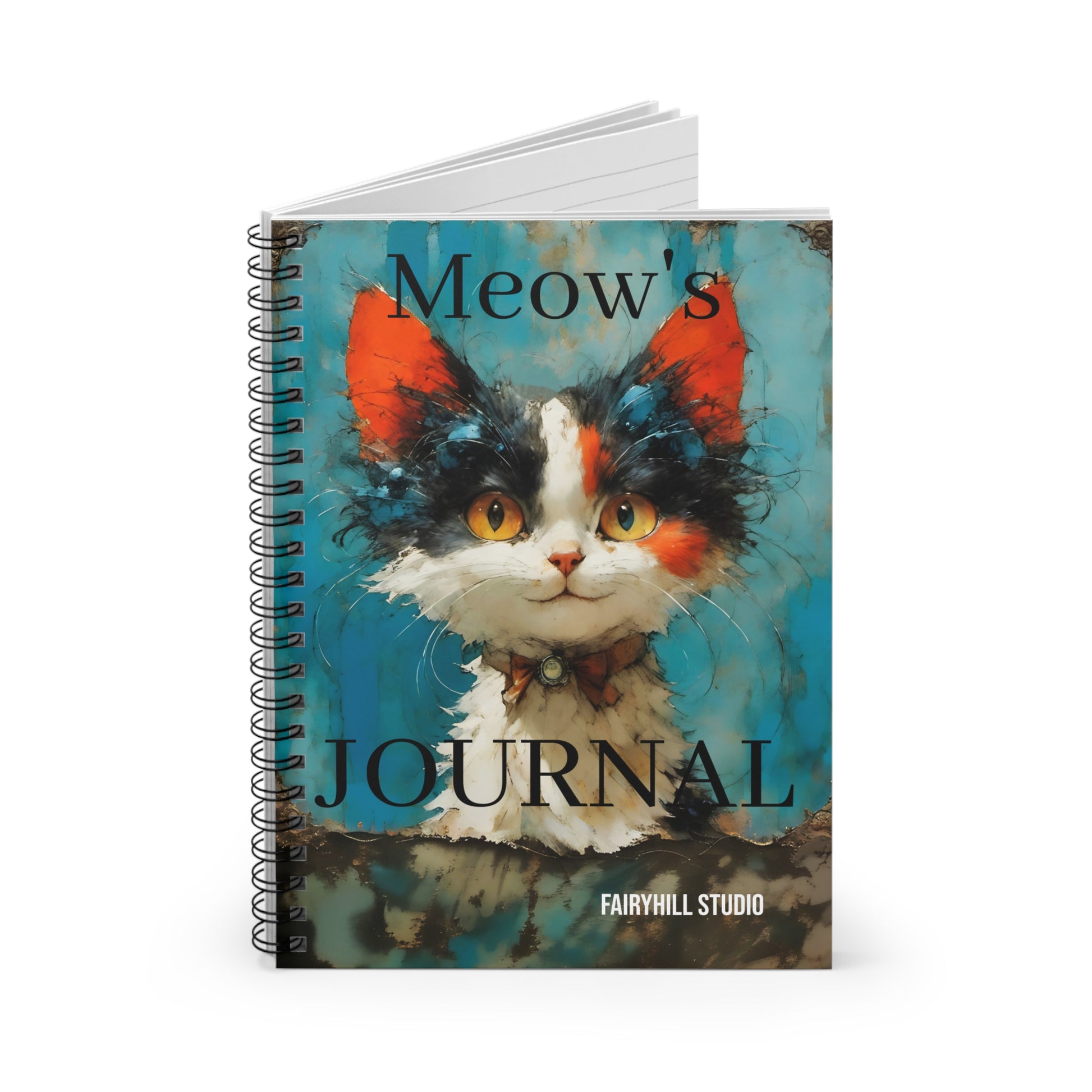 This Meow's Journal Spiral Notebook - Ruled Line features an adorable colorful cat art by fairyhill studio, perfect for cat lovers and art enthusiasts. It gives off a whimsical and creative vibe, fitting seamlessly into a buyer's daily life. Ideal for note-taking, journaling, or sketching, this notebook is relevant to cat-related holidays and occasions.