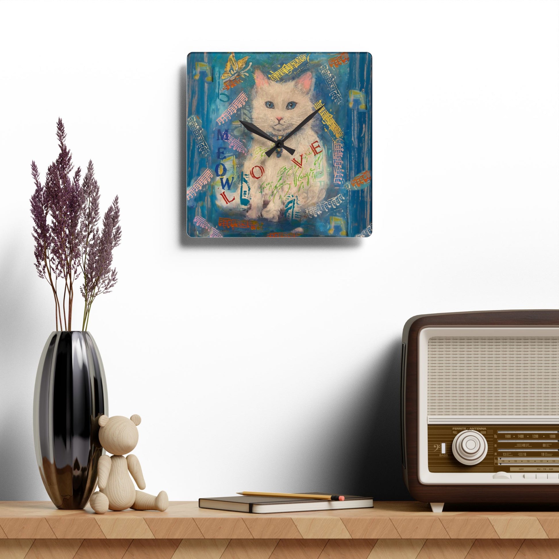 This Wall Clock features a lovely white cat with blue eyes sitting on a blue background, adding a touch of whimsy and elegance to any room. It's perfect for cat lovers and those who appreciate unique and charming decorations. Ideal for gifting on birthdays, holidays, and housewarmings.