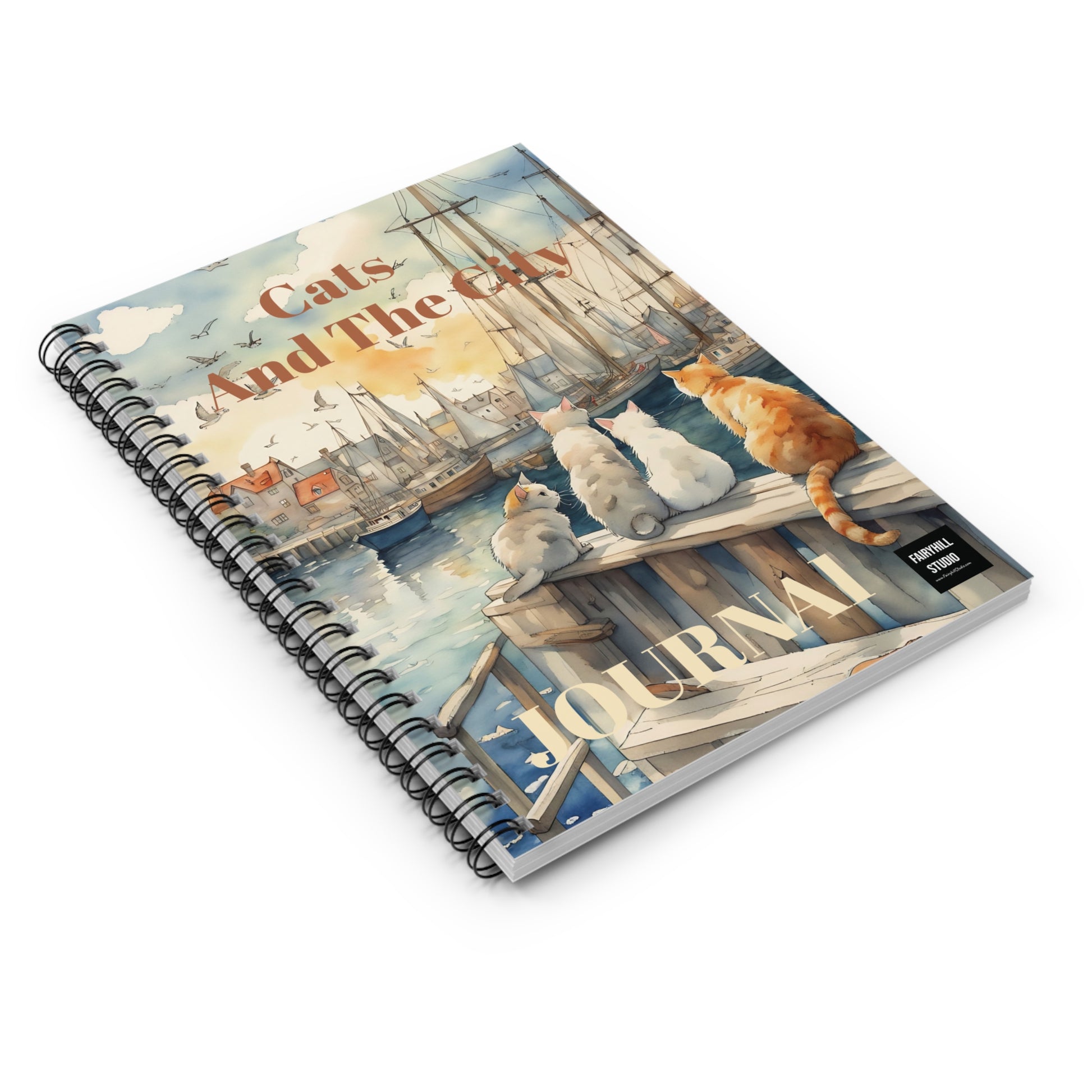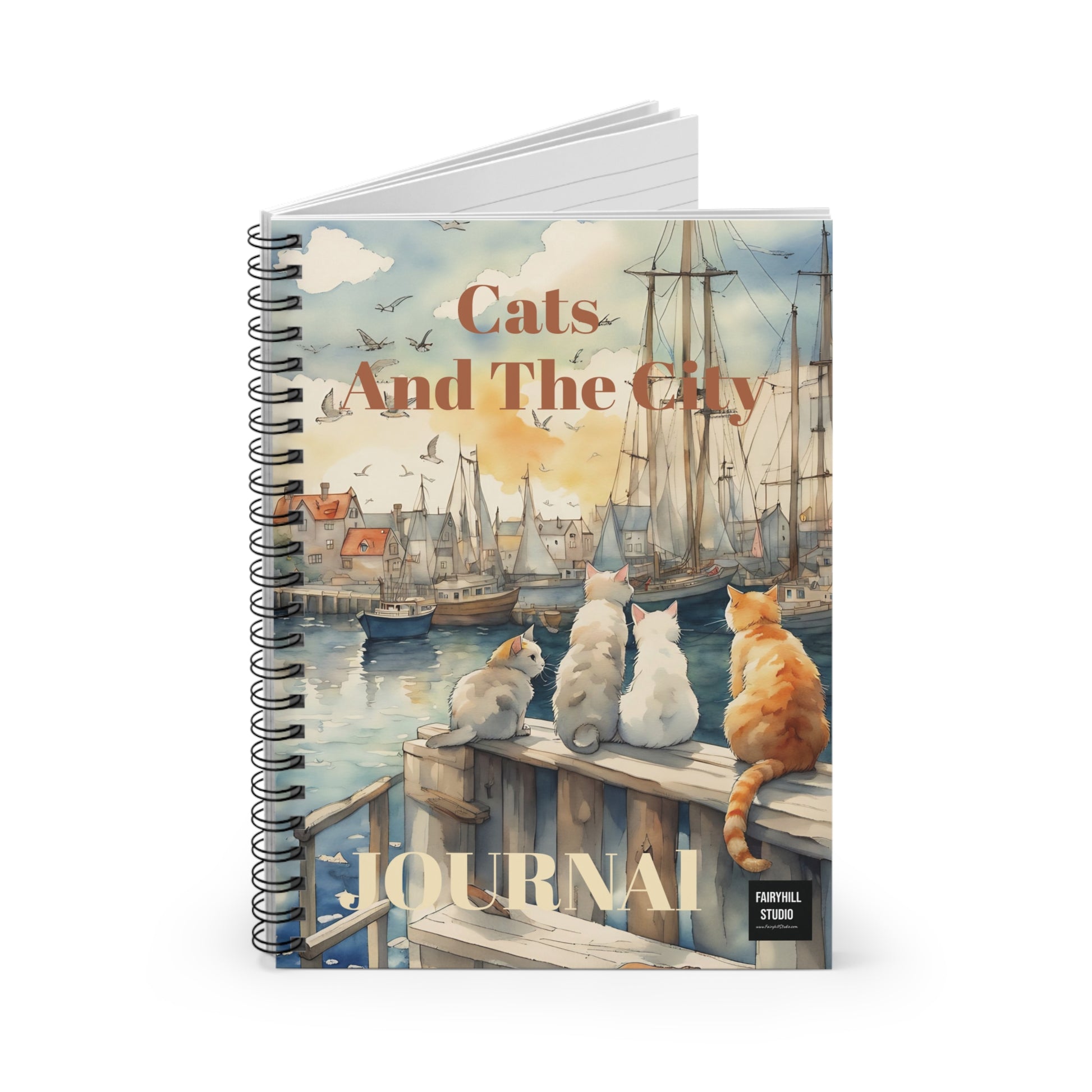 A Spiral Notebook journal featuring  Cats and the City  by Fairyhill studio, perfect for writing down thoughts and ideas. The ruled line pages provide structure while the metal spiral binding adds a fancy touch. This notebook is ideal for creative individuals looking to add a touch of whimsy to their everyday life. Perfect for students, artists, and music lovers. Great for back to school, birthdays, or as a thoughtful gift for any occasion.