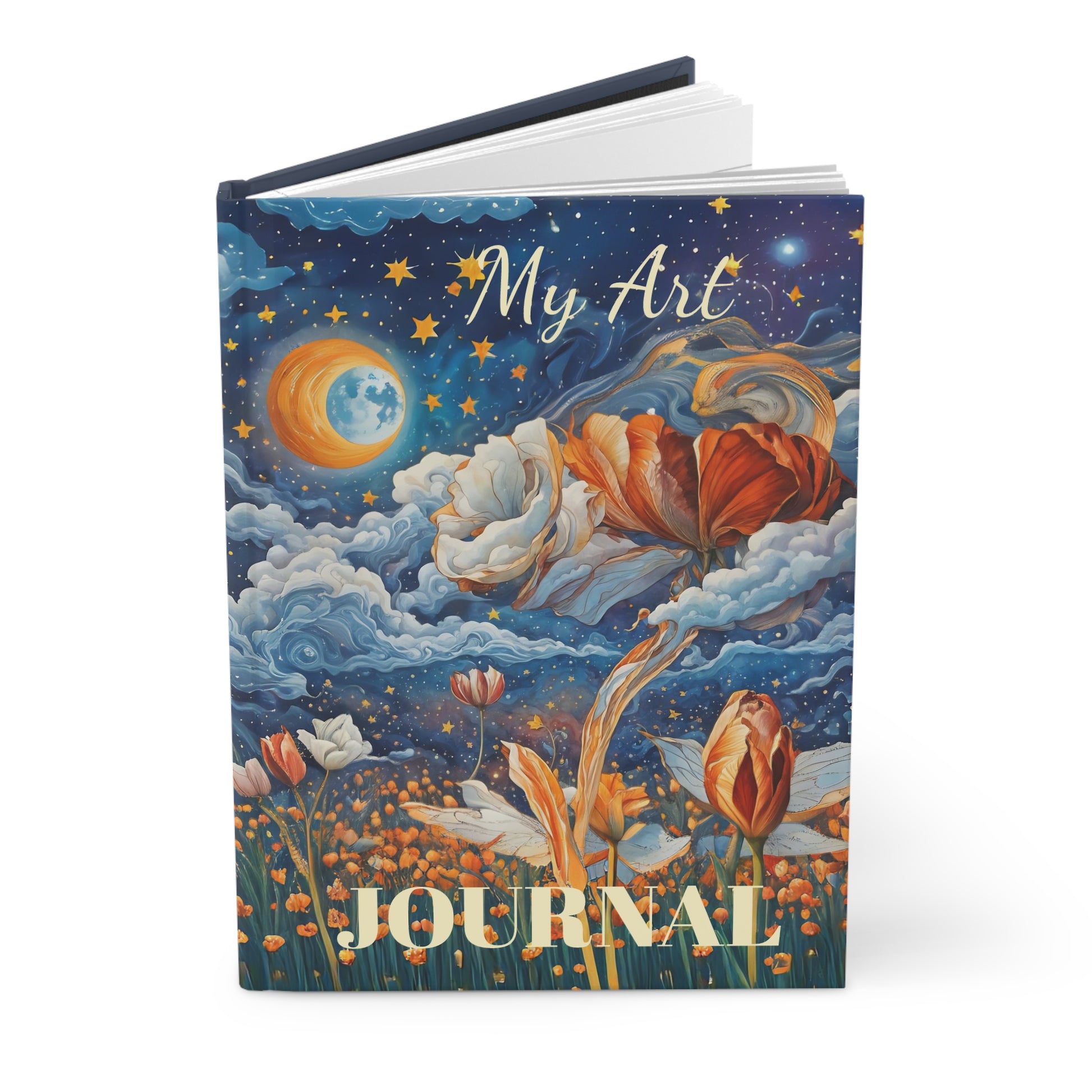 Hardcover Customized Celestial Tulips Art Journal  art Mindful  Journal Hardcover by Fairyhill Studio. This journal gives a whimsical and nature-inspired vibe, perfect for nature lovers, gardeners, and ocean,sea  enthusiasts. Ideal for journaling, note-taking, or sketching. Great for gifting on birthdays, Mother's Day, or as a back-to-school gift.