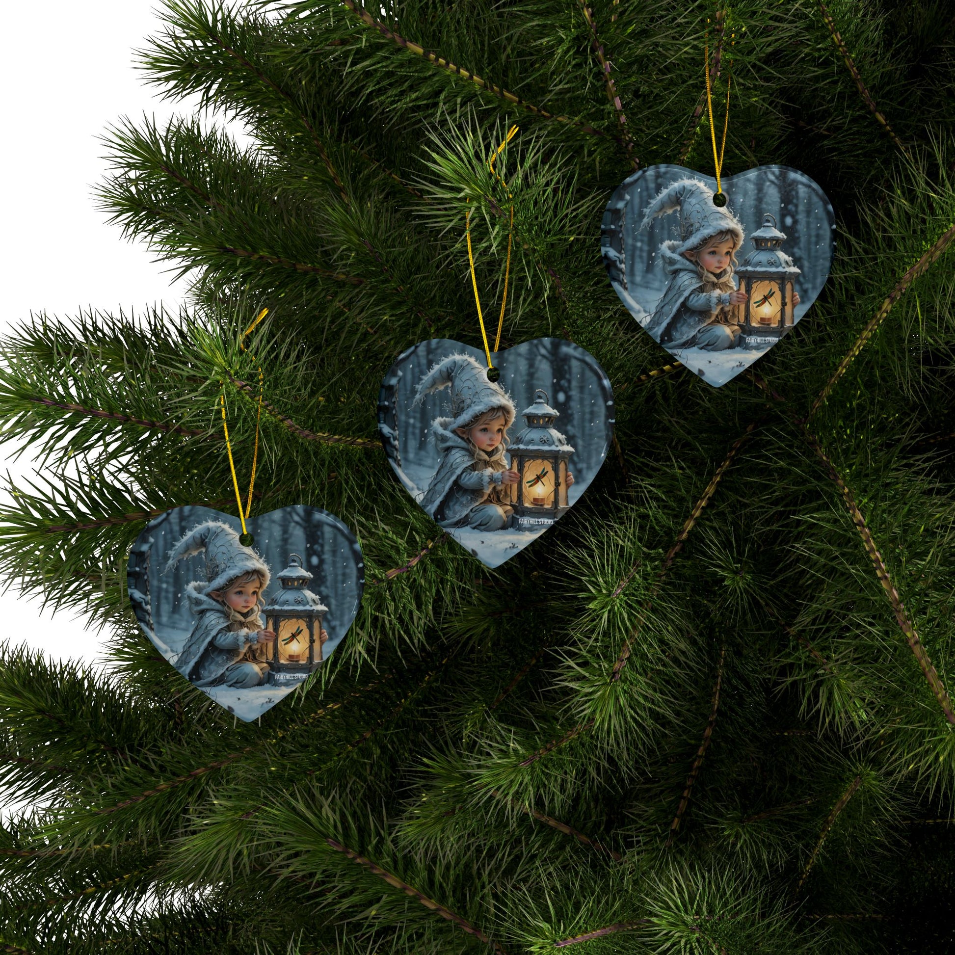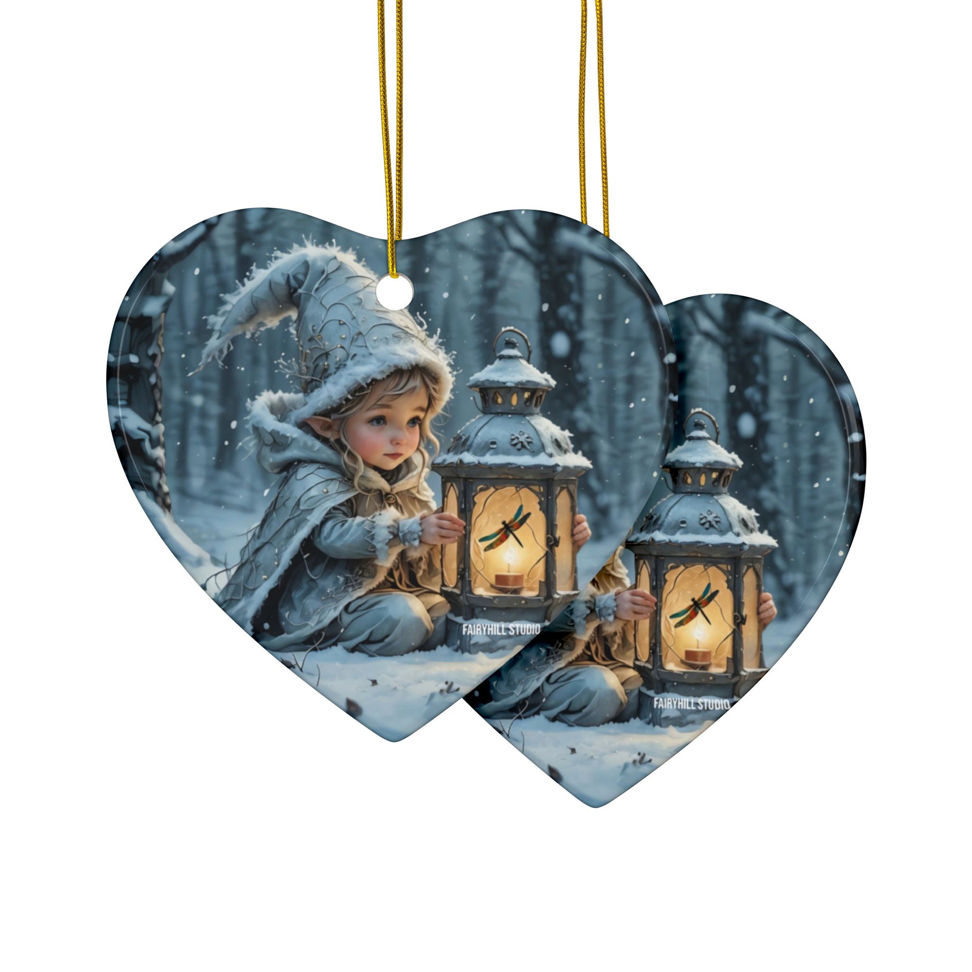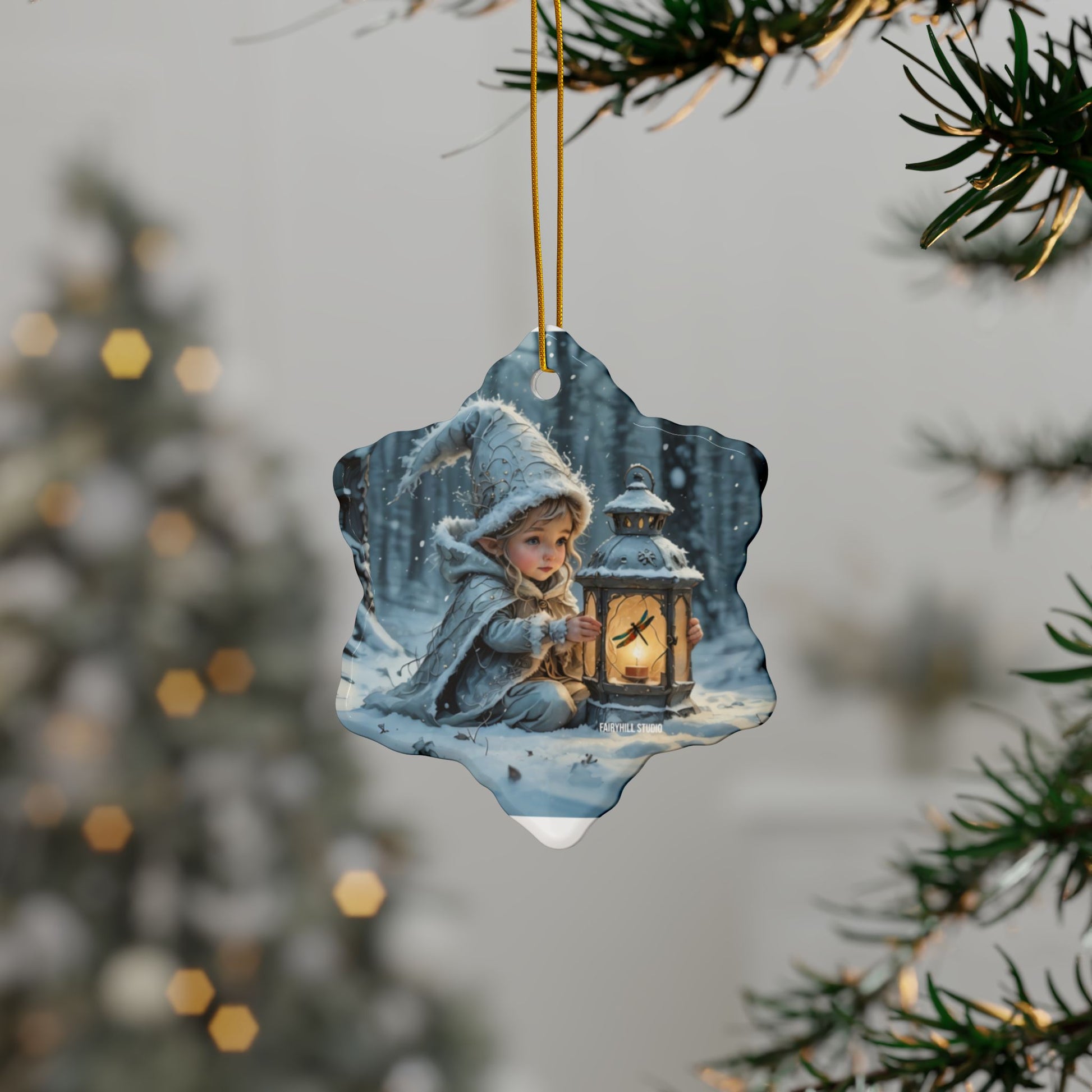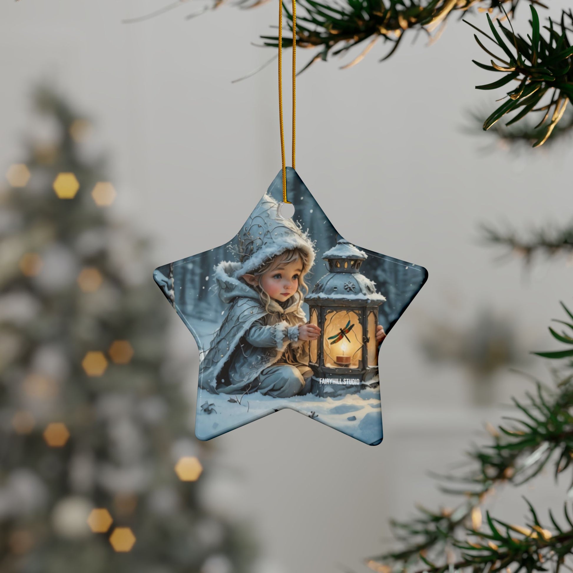 Add a touch of magic to your holiday decor with these ceramic ornaments featuring a Lovely Elf with Dragonfly lantern in winter snow. Perfect for those who love whimsical and enchanting decorations, these ornaments can be displayed on your Christmas tree or around the house. Ideal for the holiday season, Christmas celebrations, and winter-themed decor.