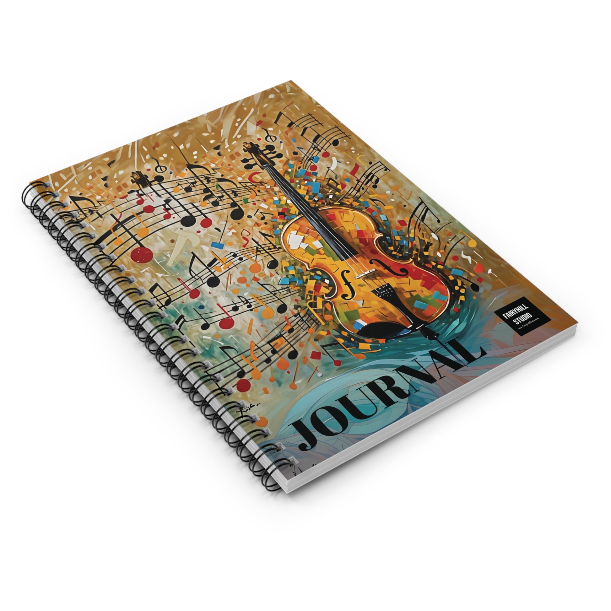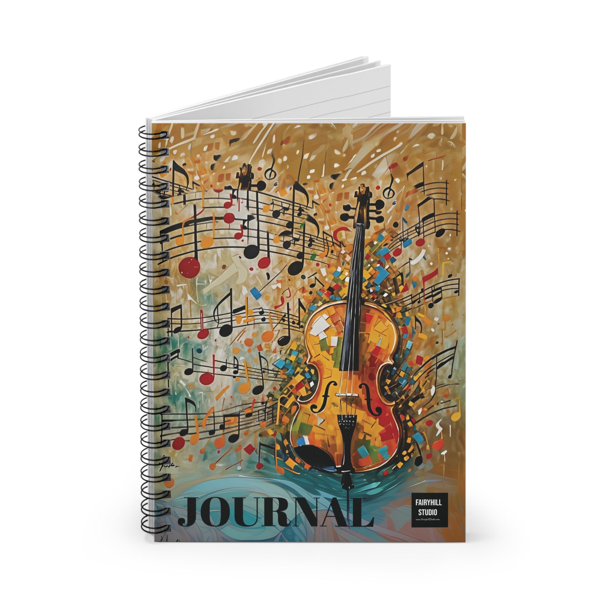 Spiral Notebook Christmas holiday journal with violin and music notes art by fairyhill studio. Perfect for writing, with a fancy look from the metal spiral binding. Features a document pocket for added storage. Relevant for music lovers and those who enjoy journaling during the holiday season.