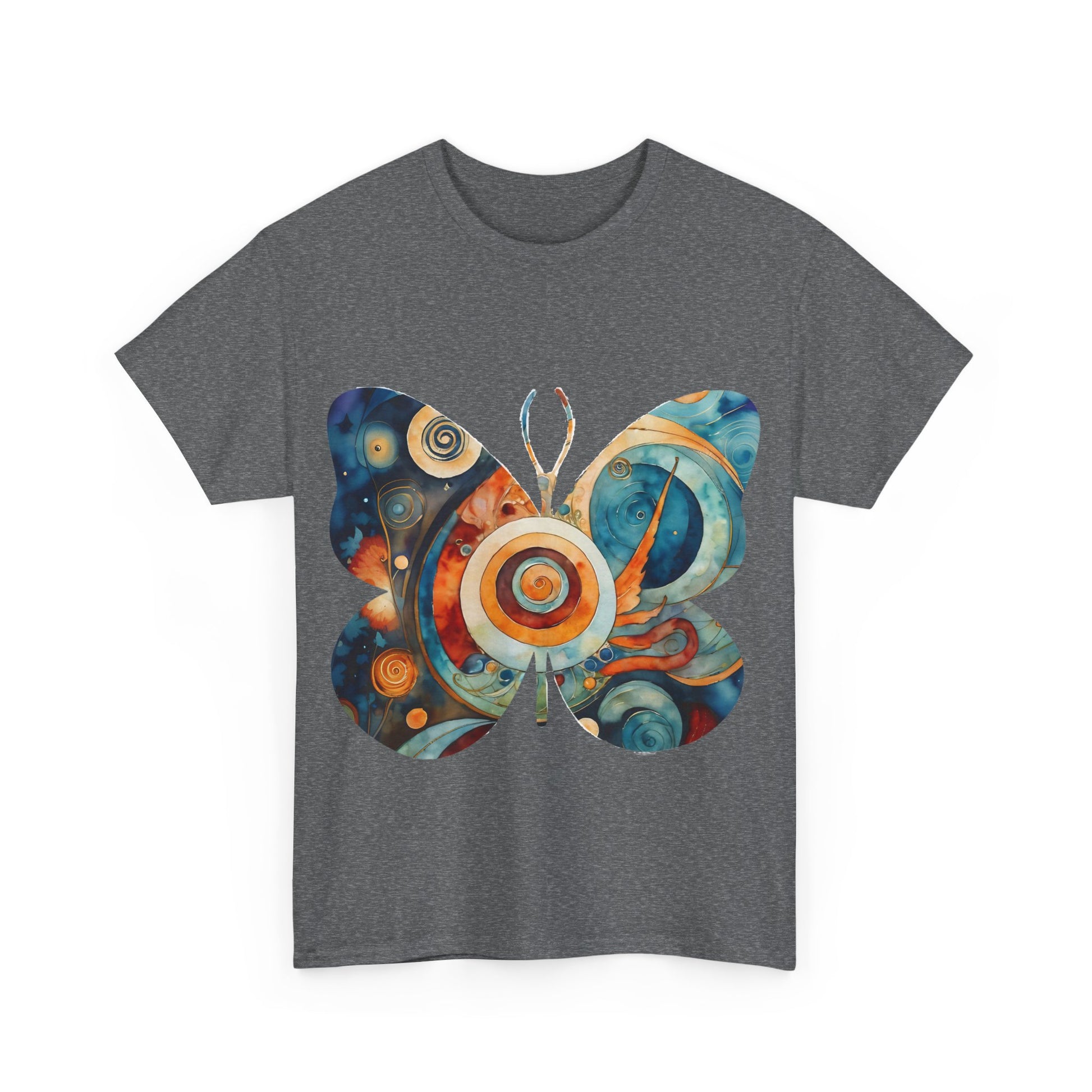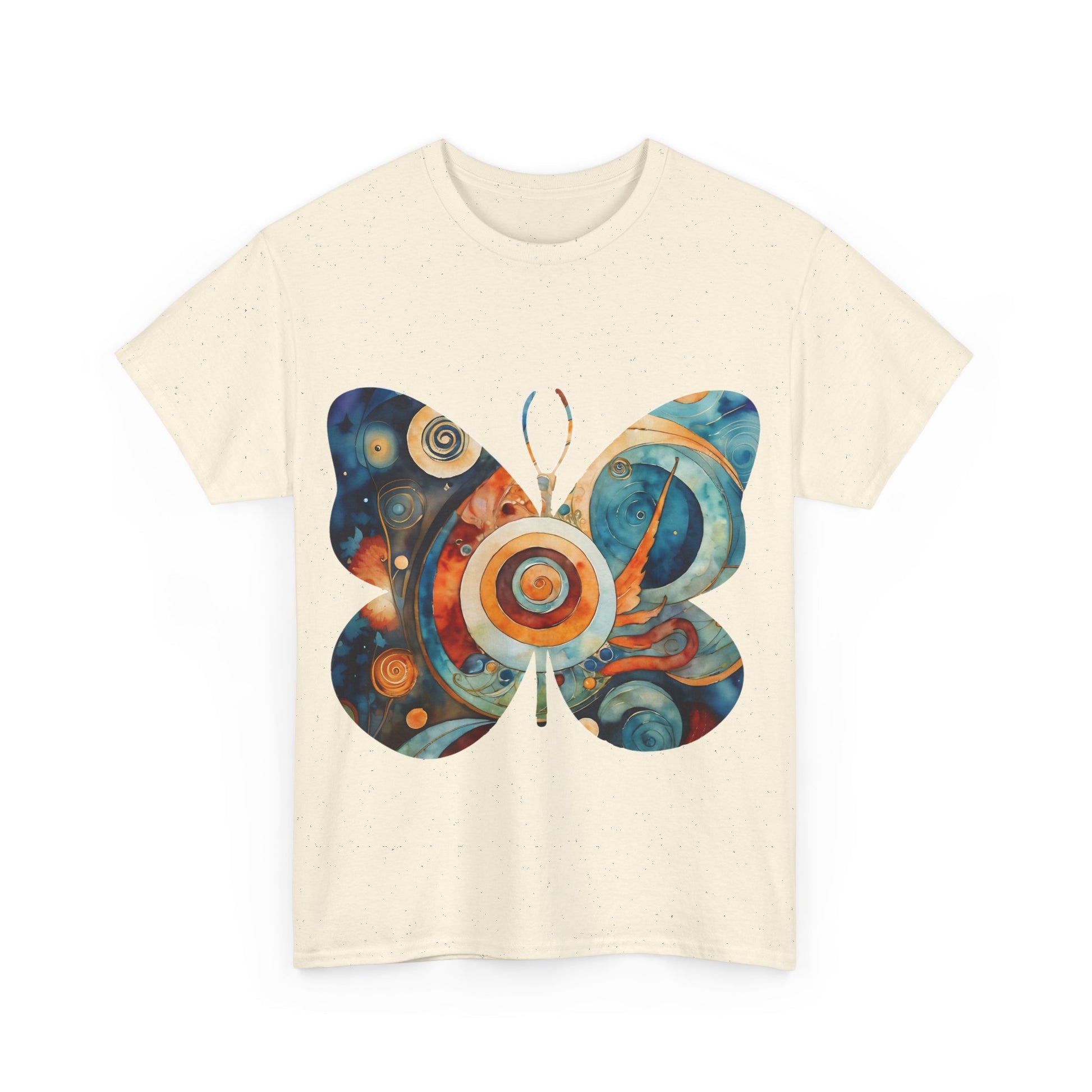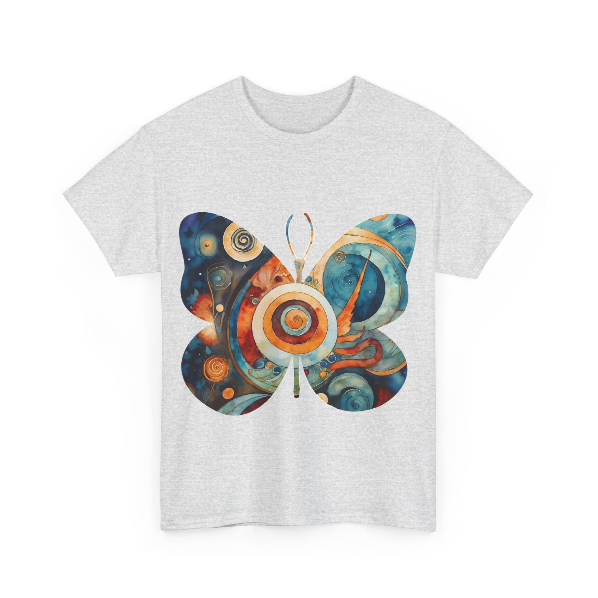 Colorful Abstract Butterfly Swirl Tee - Perfect for Art Lovers. This unisex heavy cotton tee offers a vibrant and artistic vibe, making it a great addition to any art enthusiast's wardrobe. Perfect for casual wear or art-related events, this tee is made with durable and sustainable fabric for year-round comfort.
