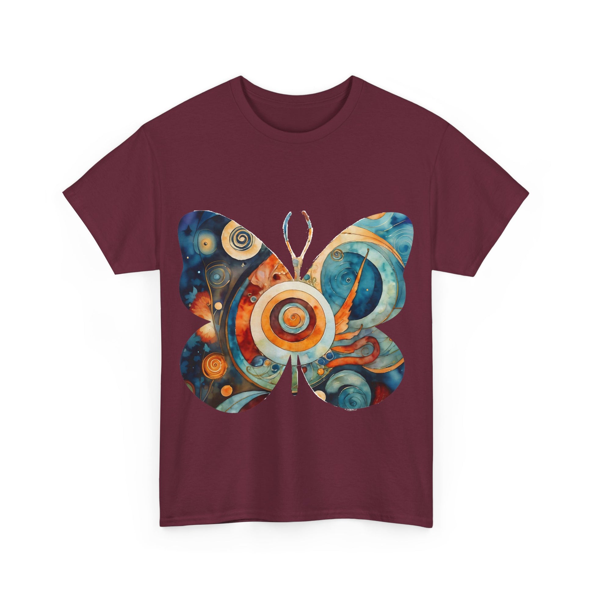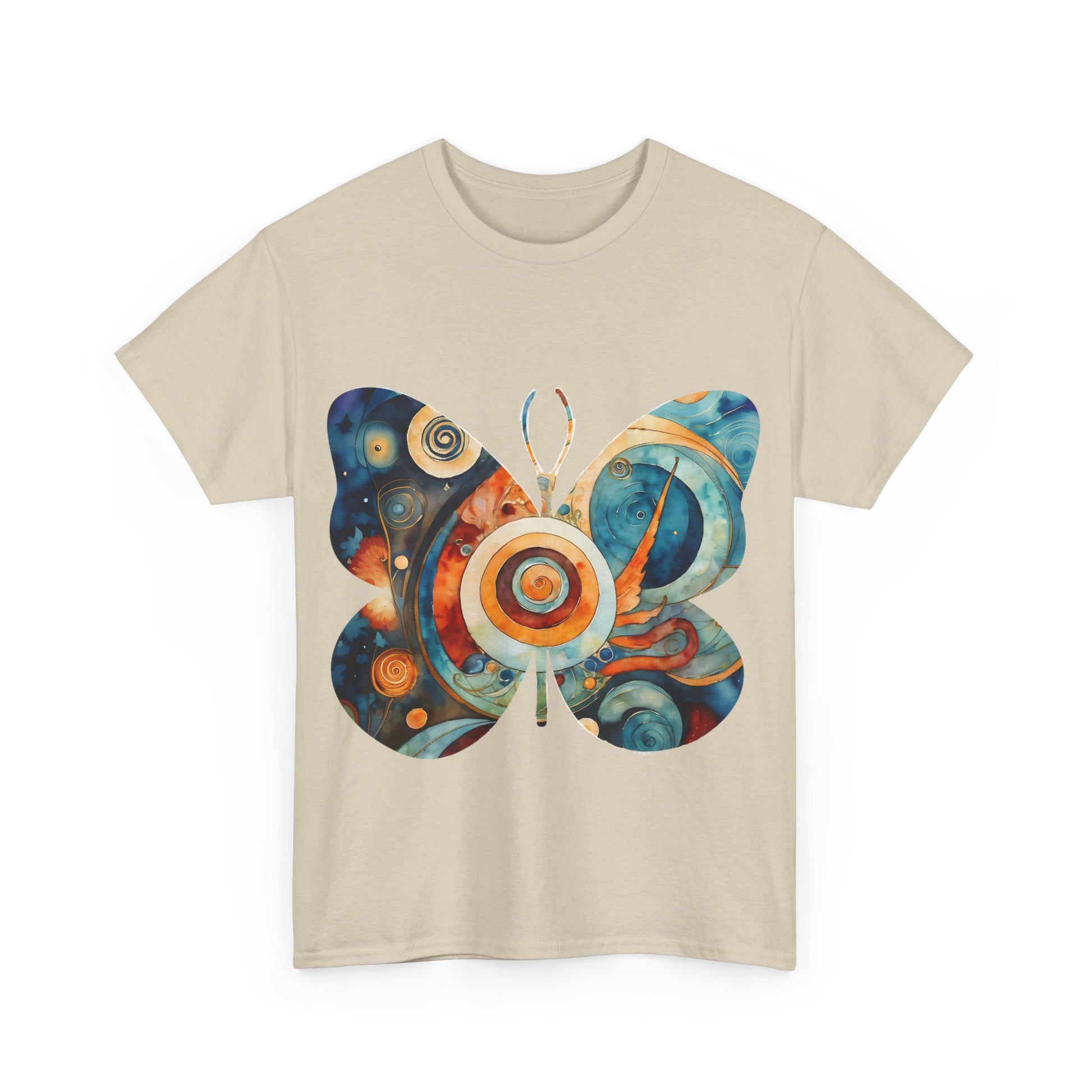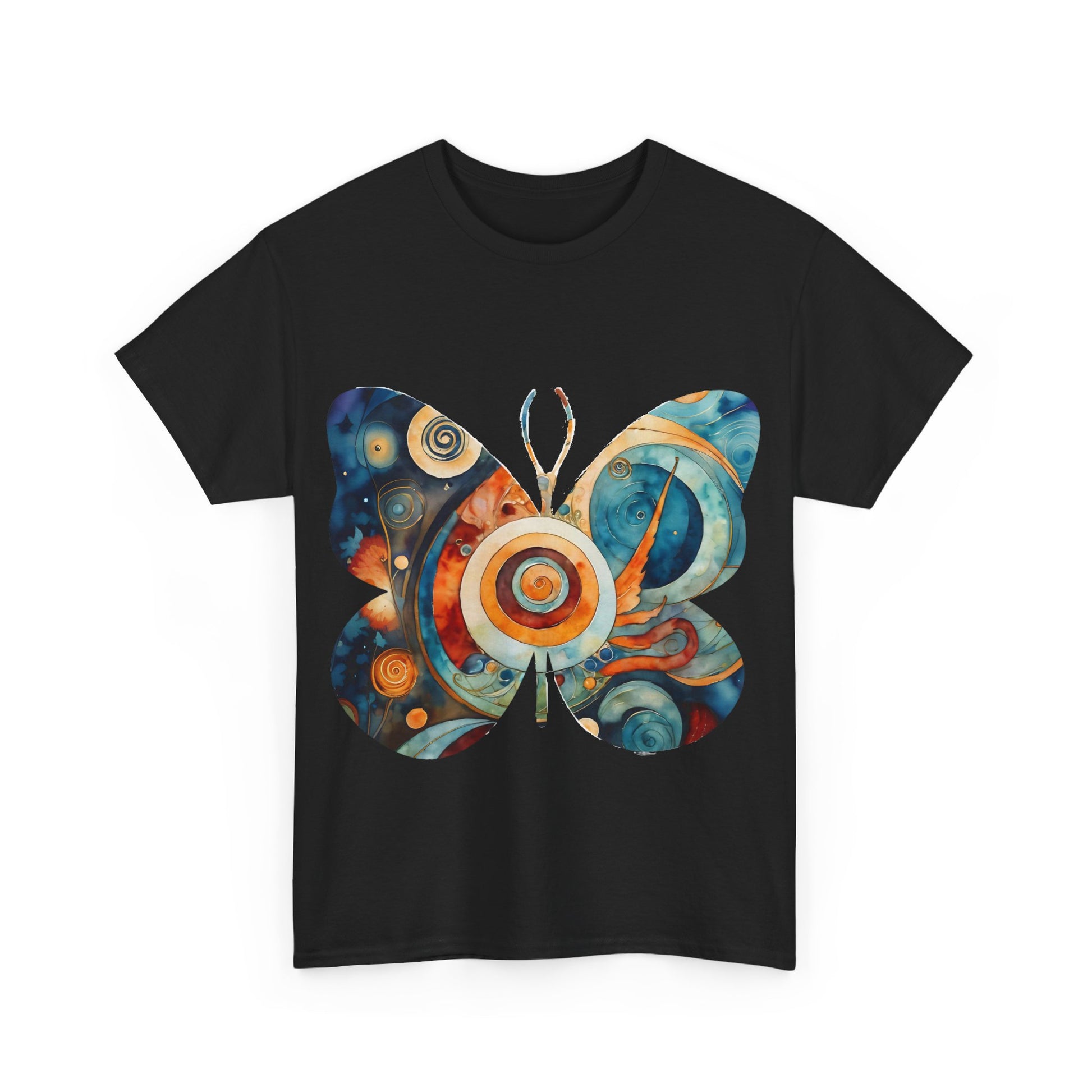 Colorful Abstract Butterfly Swirl Tee - Perfect for Art Lovers. This unisex heavy cotton tee offers a vibrant and artistic vibe, making it a great addition to any art enthusiast's wardrobe. Perfect for casual wear or art-related events, this tee is made with durable and sustainable fabric for year-round comfort.