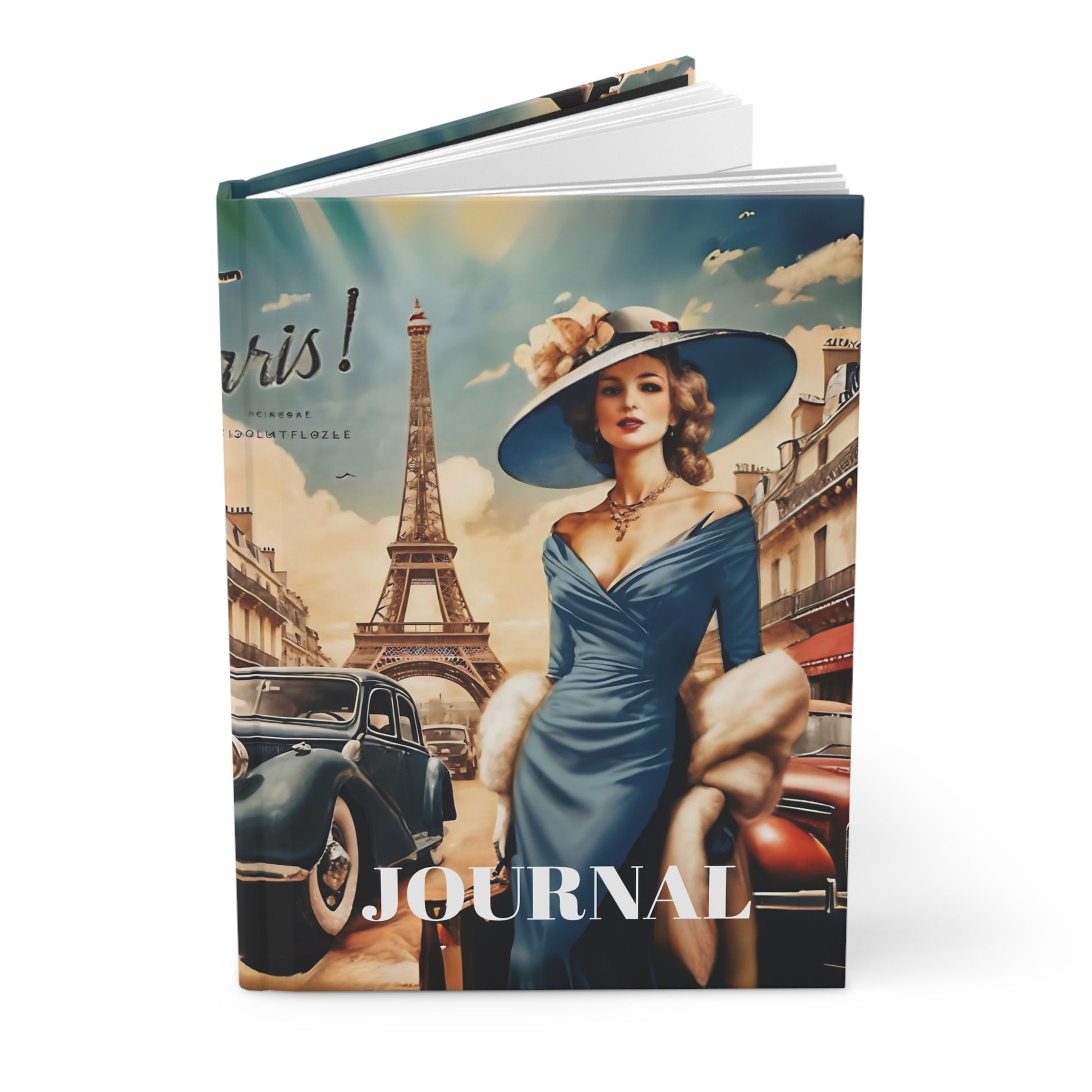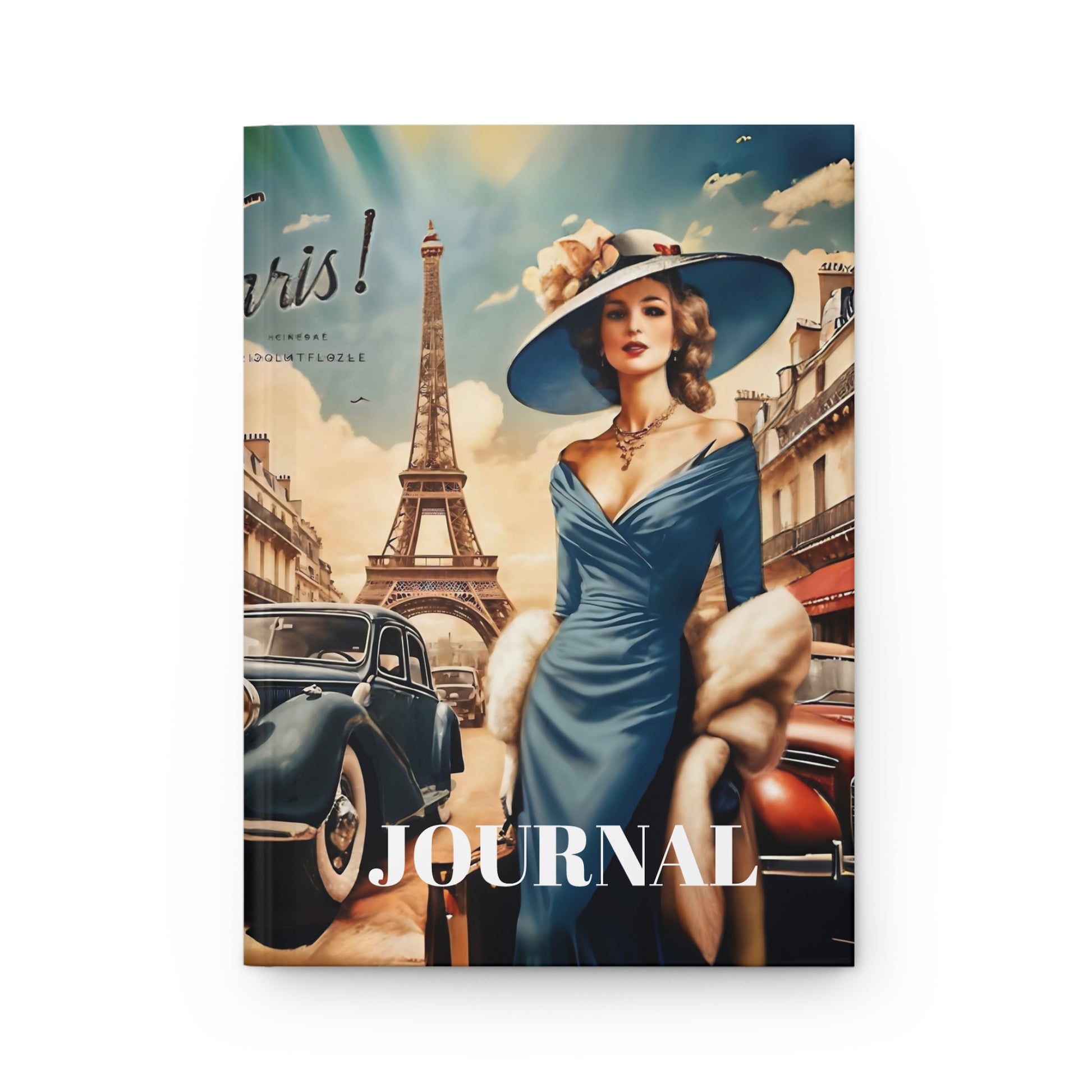 This vintage art journal features an elegant model in France/Paris on a busy street with deluxe vintage cars. Perfect for those who appreciate classic style and sophistication in their everyday life. Ideal for journaling, sketching, or note-taking. Great for Paris enthusiasts, vintage lovers, and those who enjoy a touch of nostalgia.