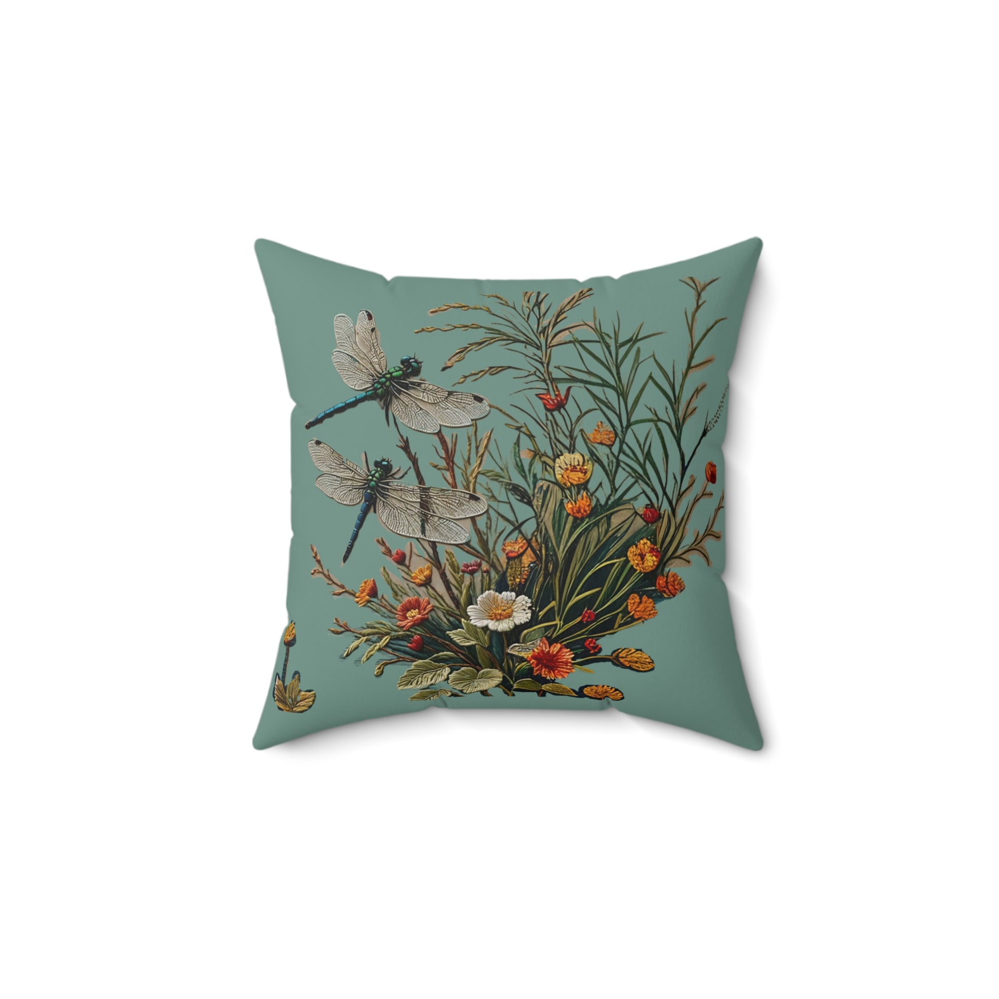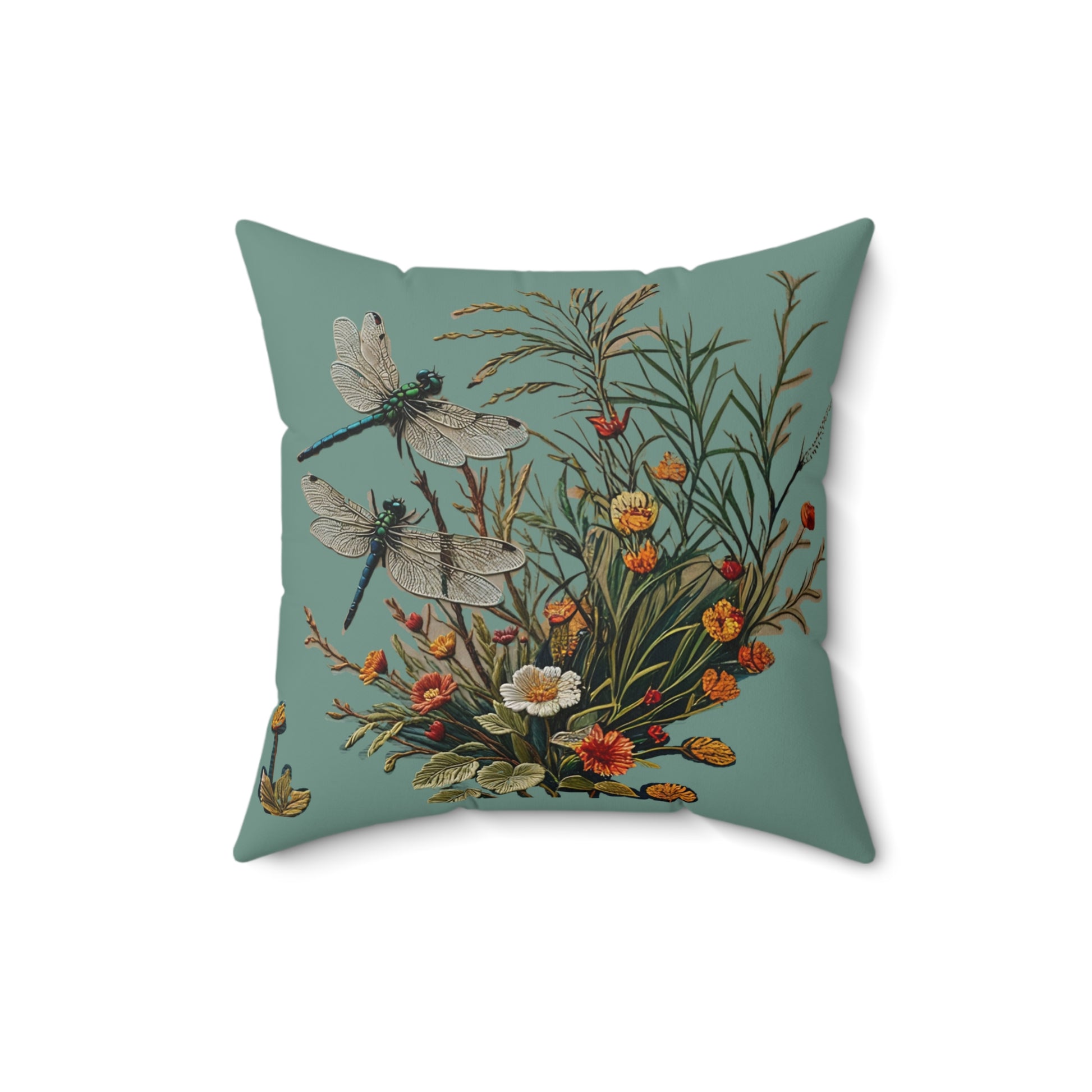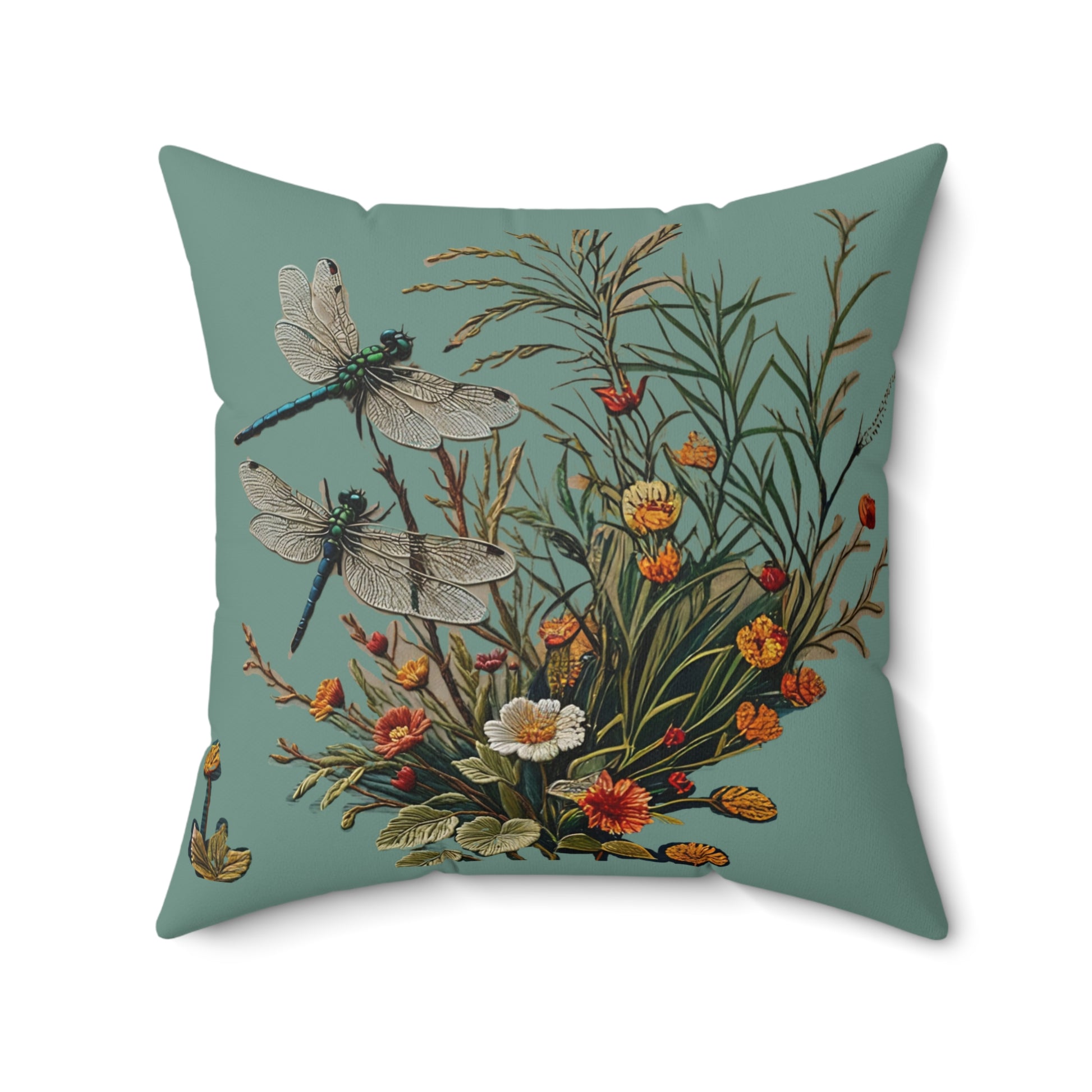 A charming pillow featuring a lovely art of dragonflies with flowers on a pond, giving a whimsical and nature-inspired vibe. Perfect for nature lovers looking to add a touch of enchantment to their home decor. Ideal for gifting during birthdays, housewarmings, or Mother's Day.