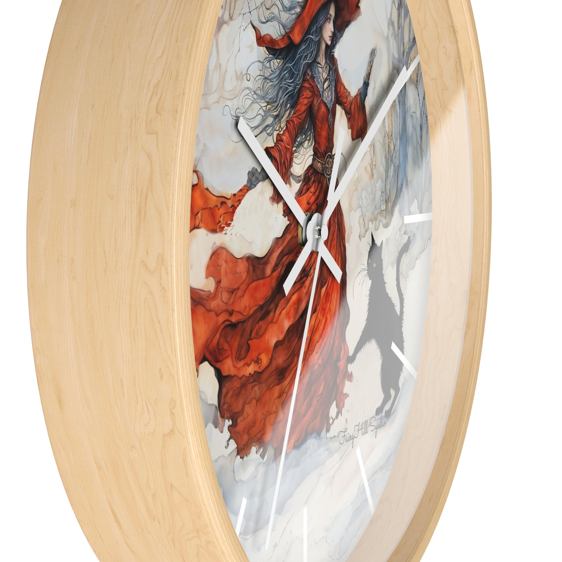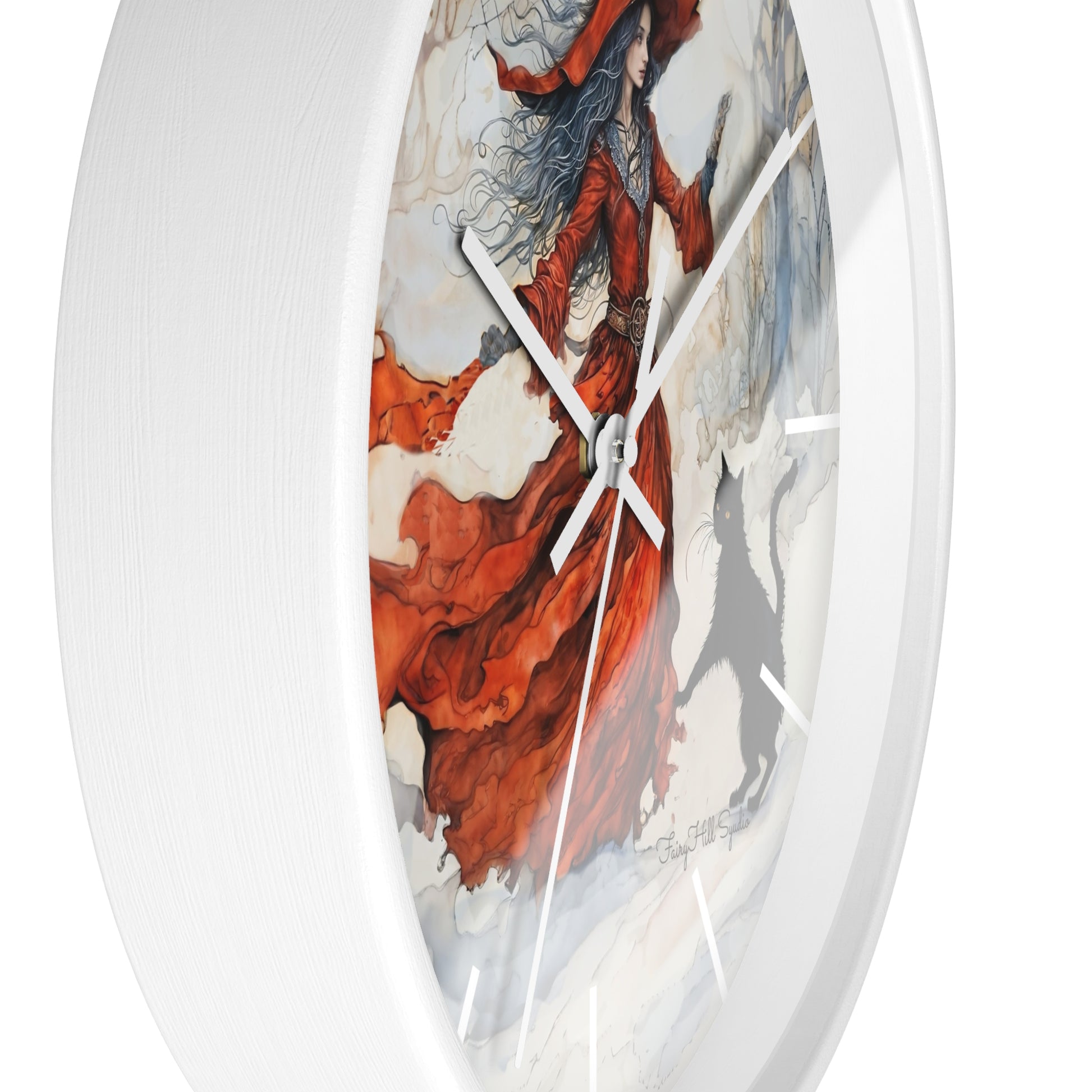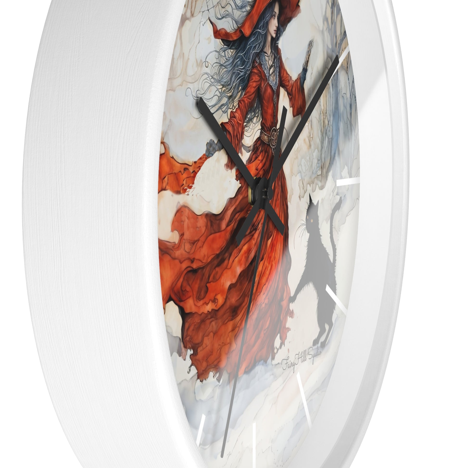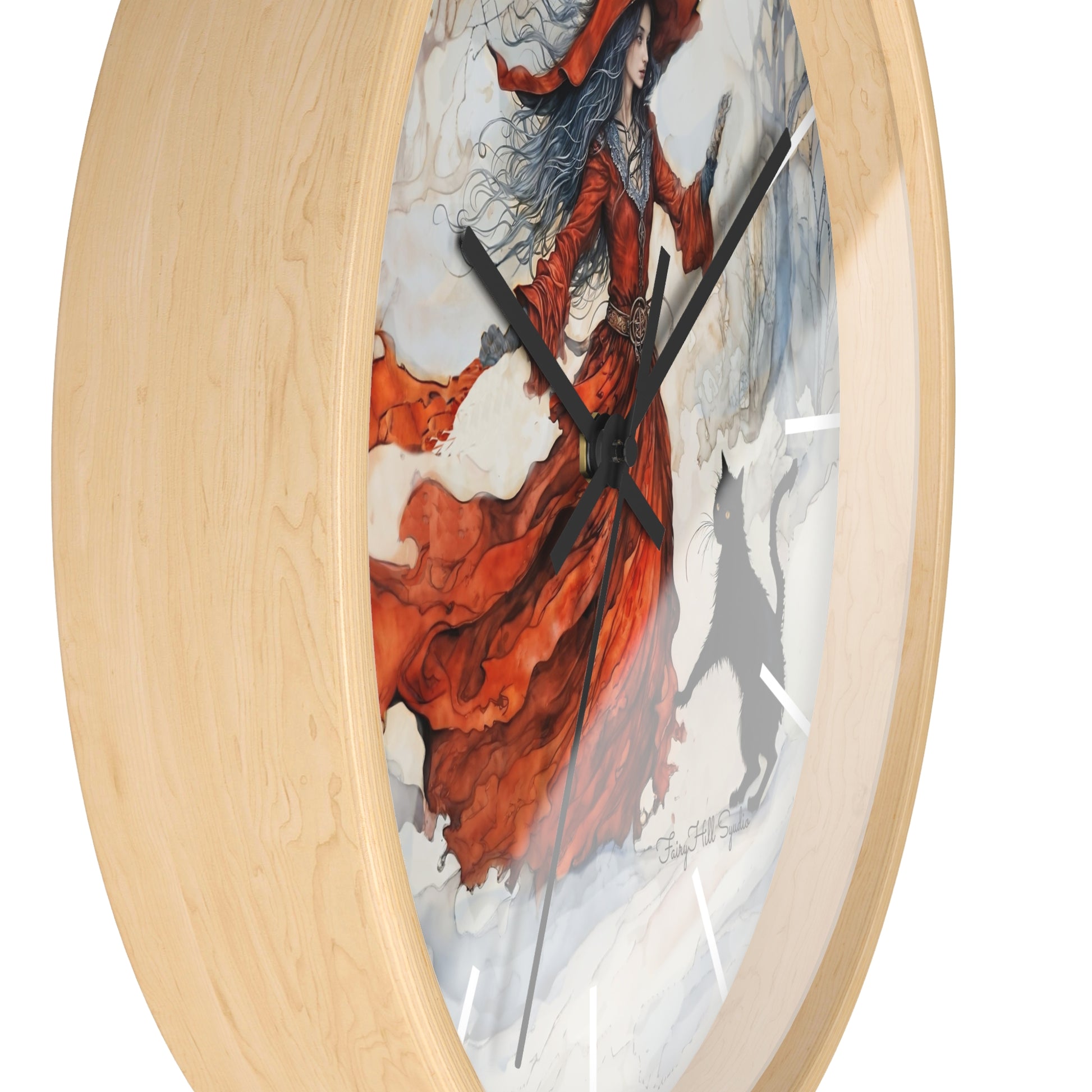 Crimson Witch with black cat Wall Clock, Boho Home Decor, Cat Lover Gift, Cozy Living Room Accessory, Unique Cat Artwork