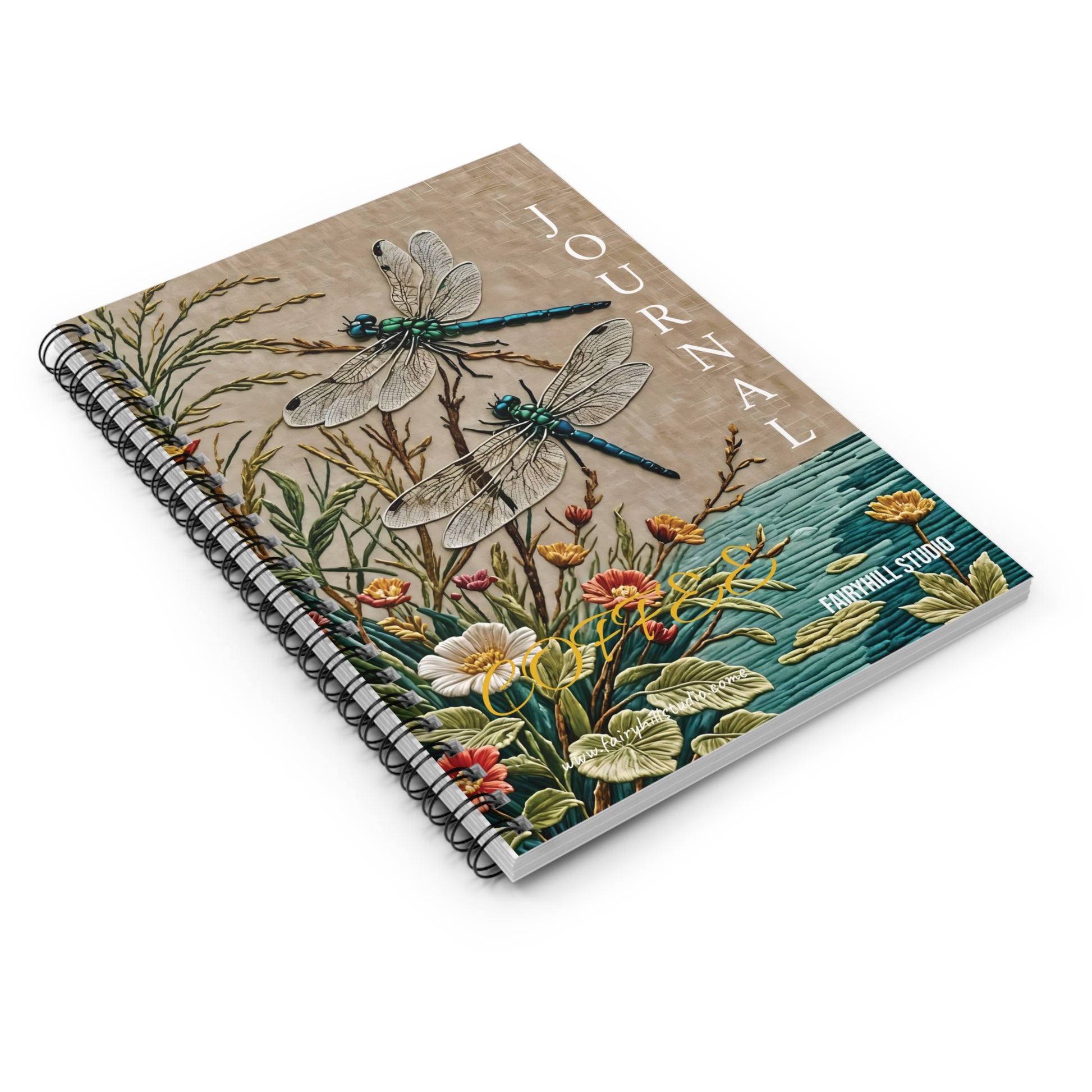 This Spiral Journal features a personalized embroidery style art of dragonflies on a pond with flowers, perfect for nature lovers and those who appreciate intricate designs. The fancy metal spiral binding adds a touch of elegance, while the ruled line pages are ideal for writing down thoughts, notes, and creative ideas. The document pocket provides added storage for loose papers or cards. This Spiral Journal is great for journaling, note-taking, or doodling, and makes a thoughtful gift for birthdays or special occasions.