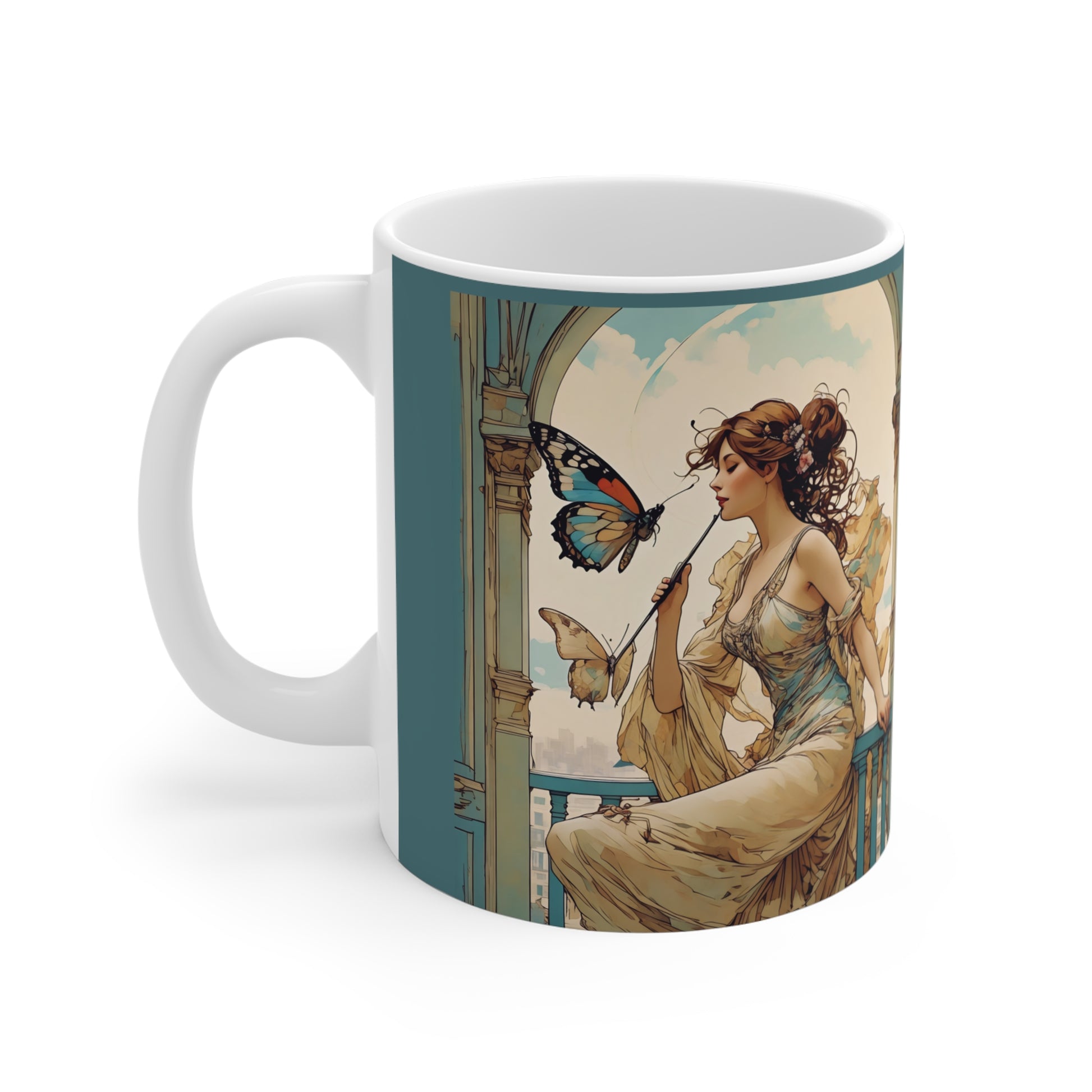 Elegant Butterfly Fairy Art 11oz Coffee Mug featuring a girl playing flute to a large butterfly by Voices/Nazan Saatc. Perfect for art lovers, this mug gives a whimsical and elegant vibe and is suitable for everyday use. Ideal for those who appreciate art and beautiful designs. Relevant for gifting on birthdays, holidays, or special occasions.