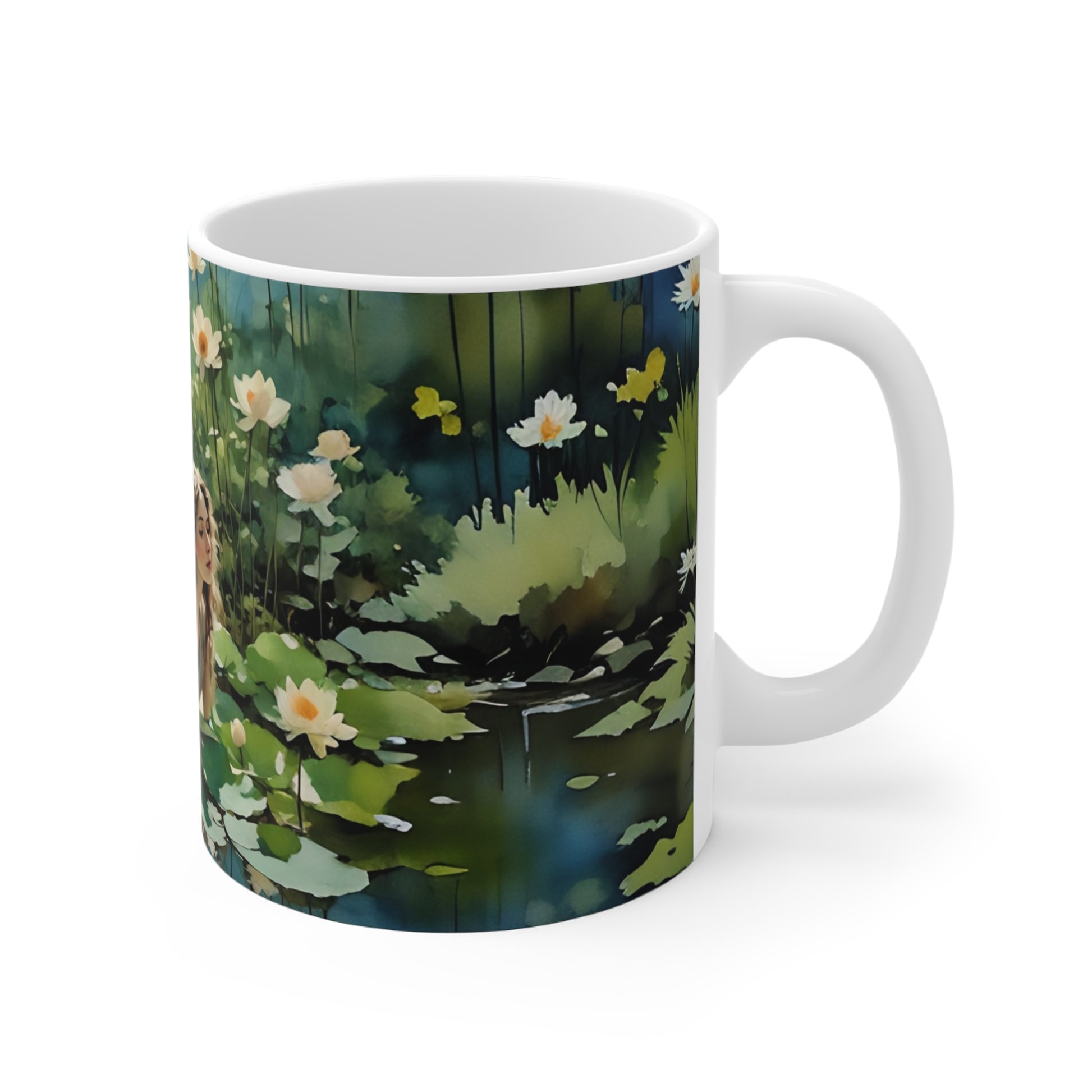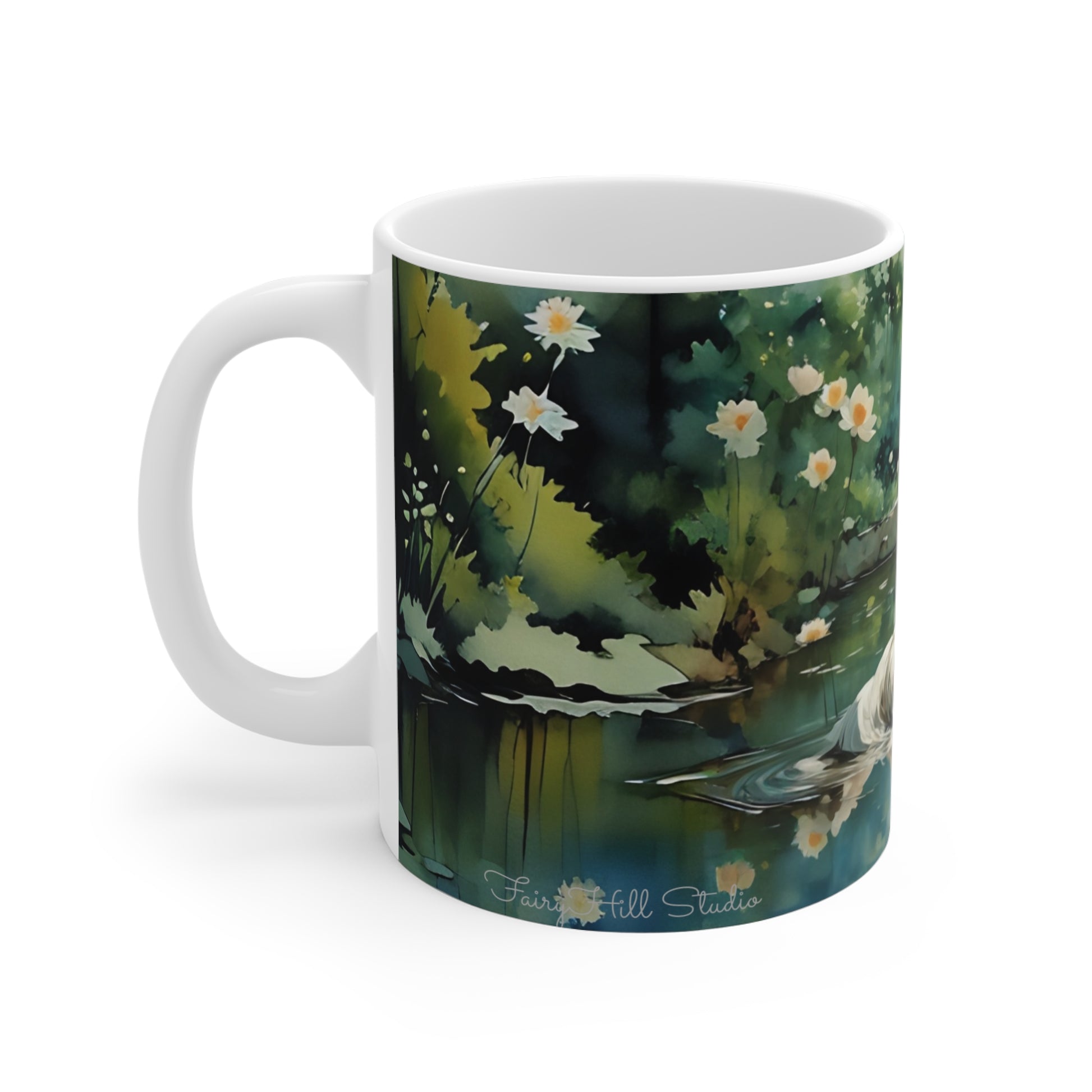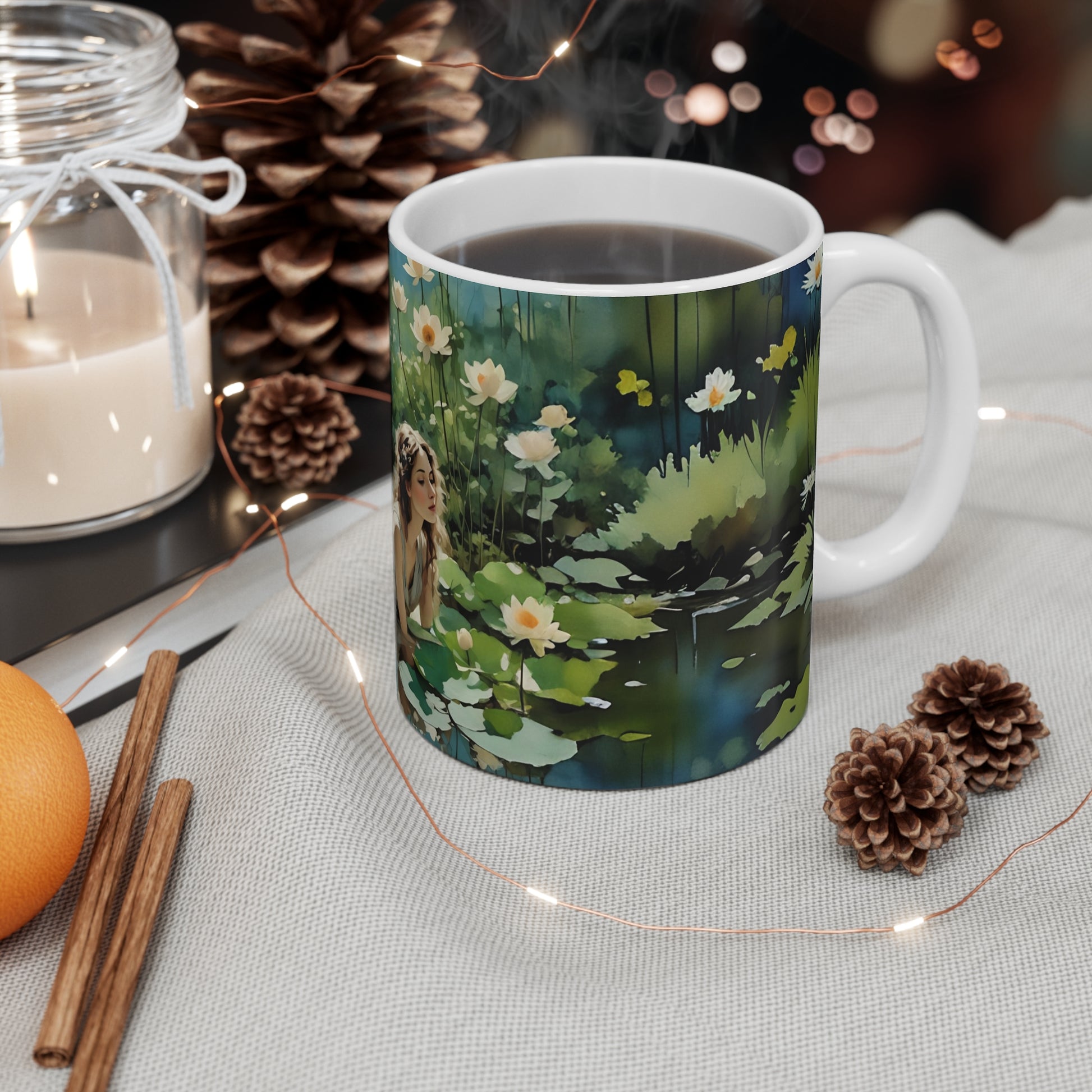 This mug features a beautiful girl in a lily pond surrounded by lotus flowers, creating a serene and tranquil atmosphere. Perfect for nature lovers and those seeking a calming start to their day. Ideal for gifting on birthdays, Mother's Day, or as a thoughtful gesture for someone who enjoys serene imagery.