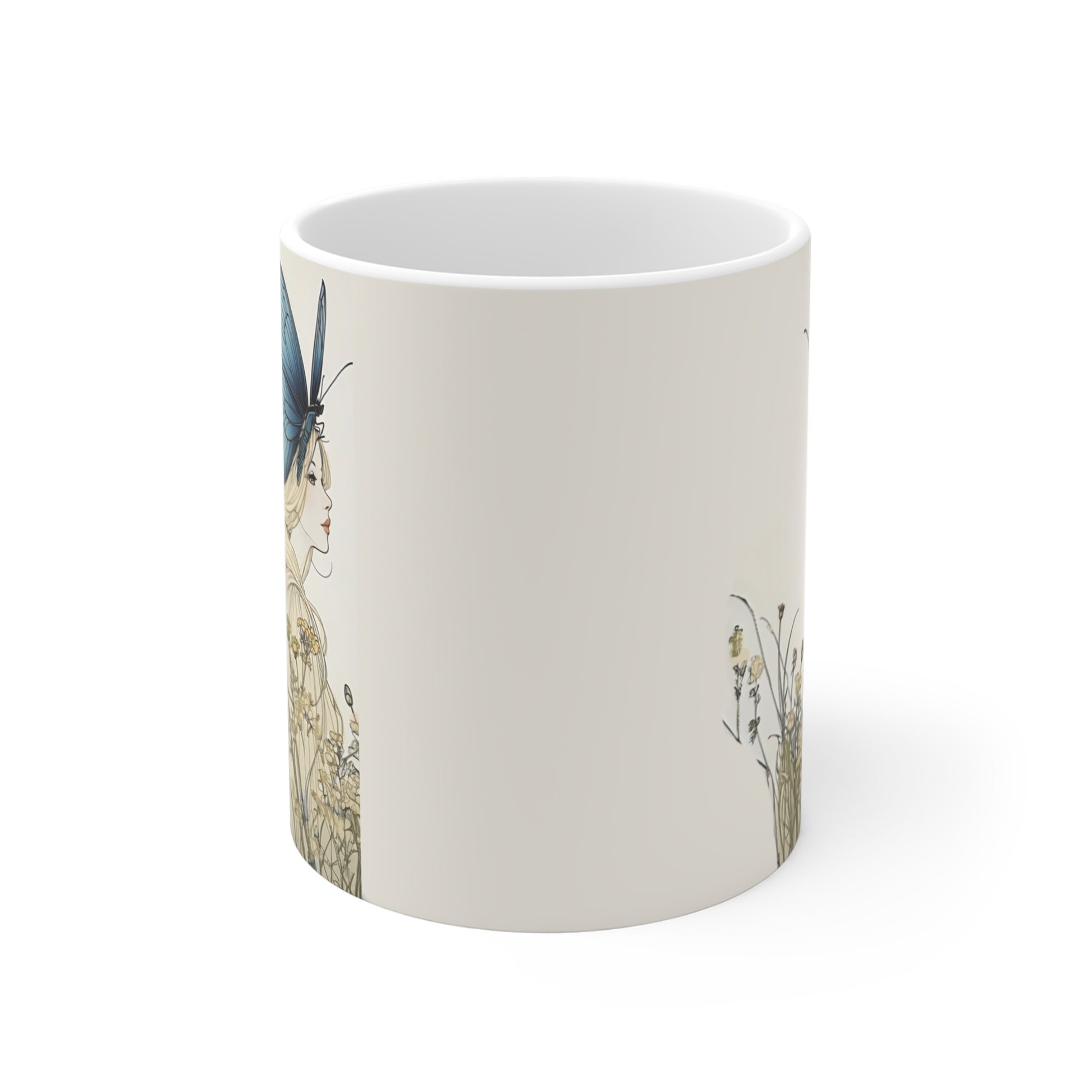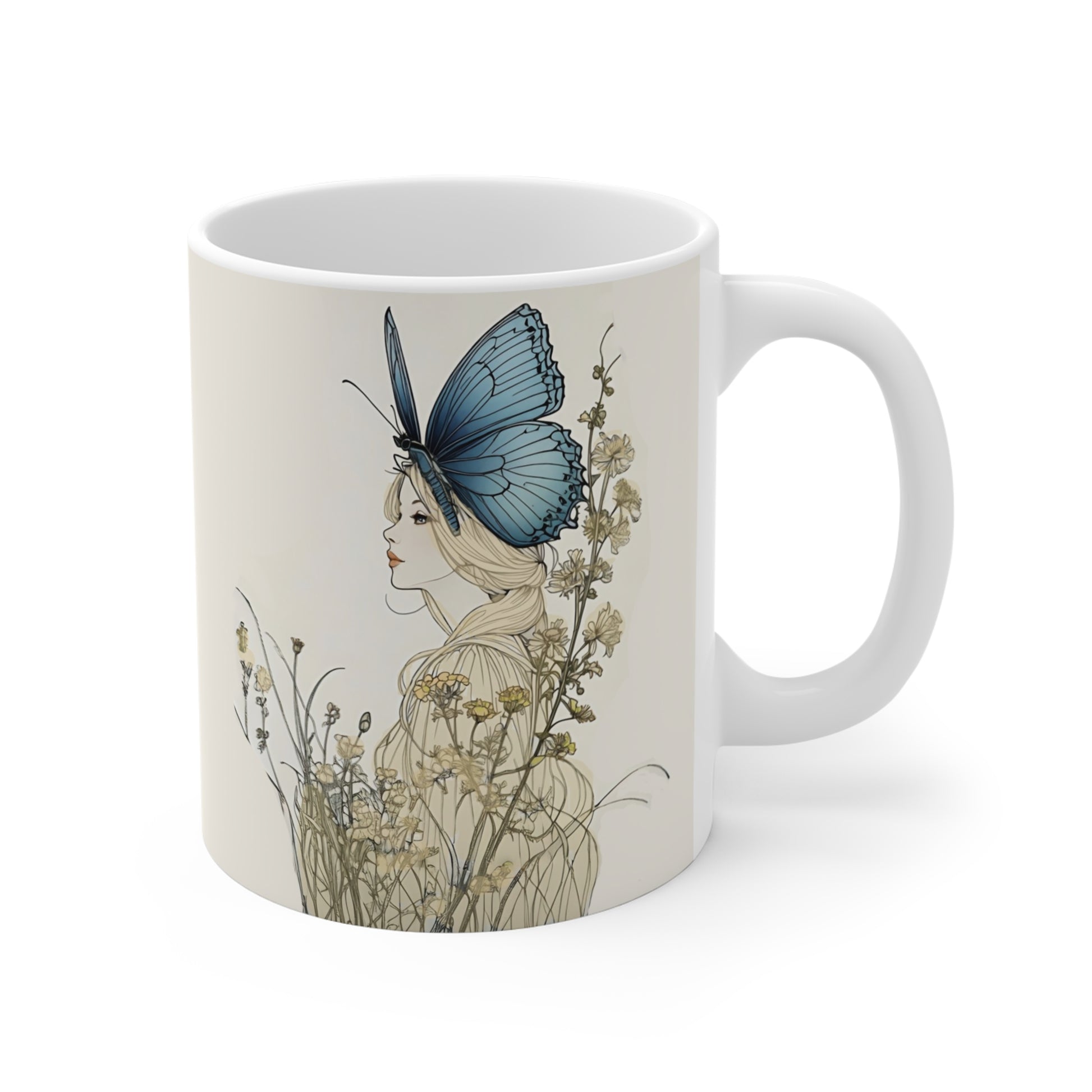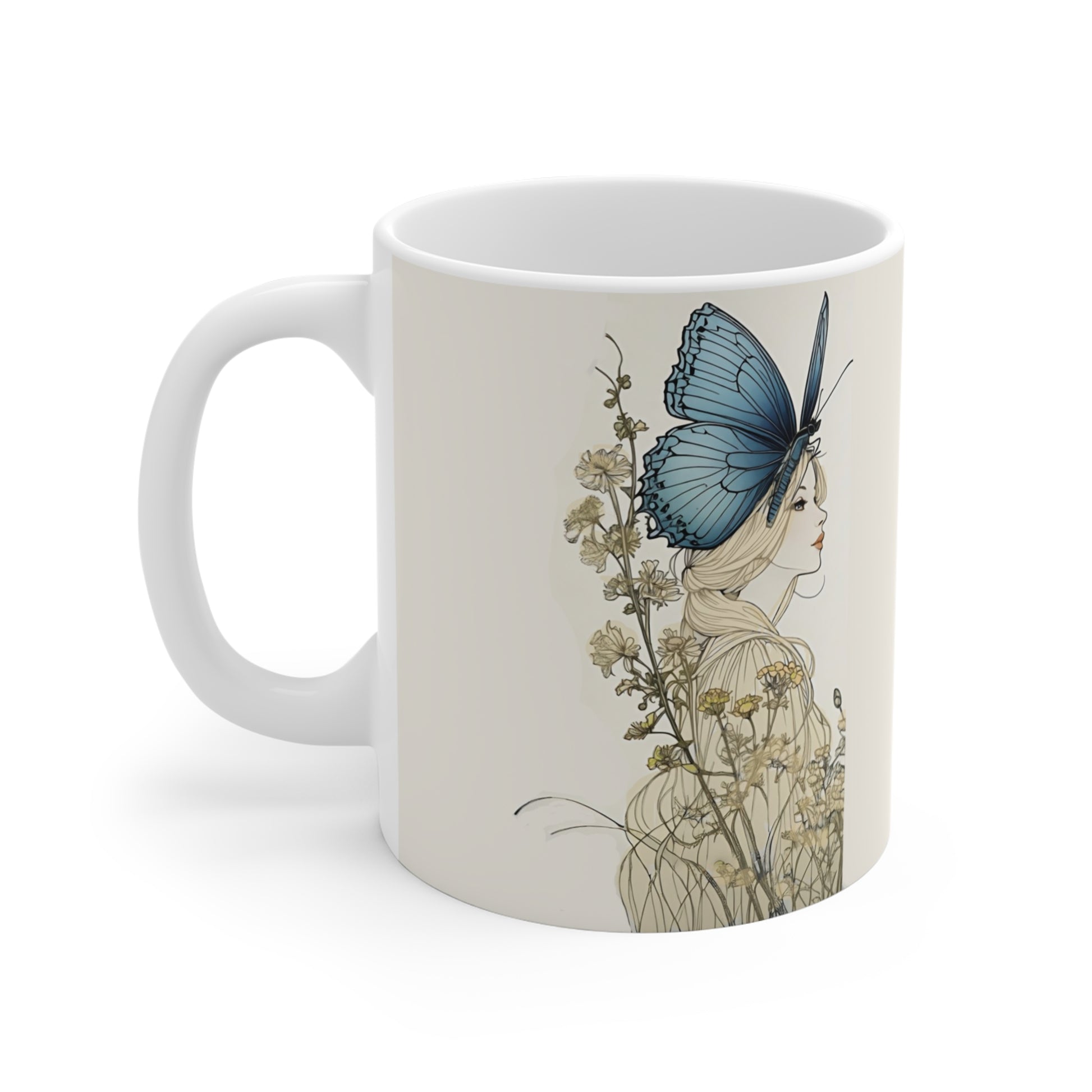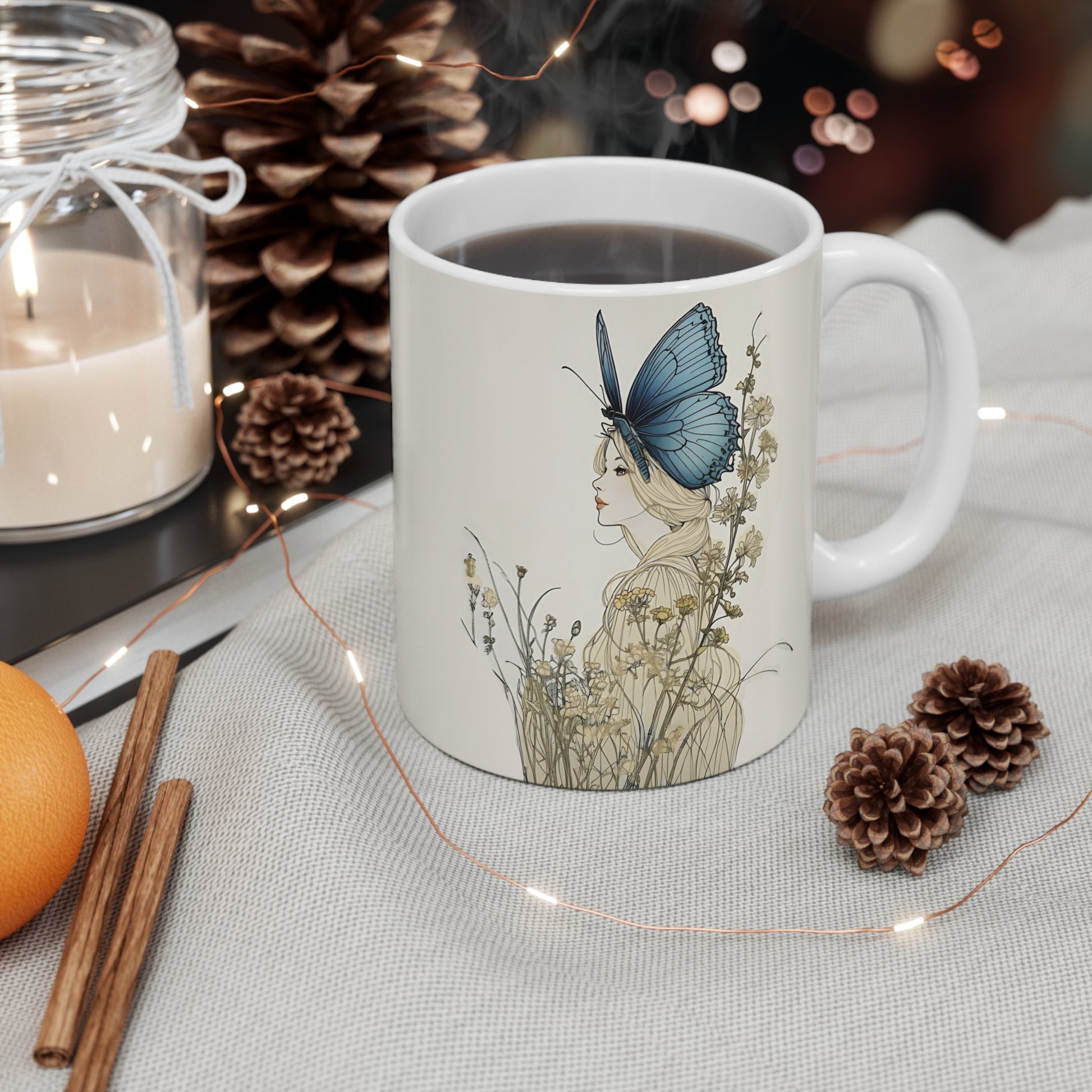 An elegant 11oz ceramic mug featuring a floral art design with a girl and a blue butterfly line illustration. Perfect for cozy mornings and tea time, adding a touch of sophistication to your kitchen or office. Ideal for those who appreciate nature-inspired artwork and enjoy sipping beverages in style. Great for gifting on birthdays, Mother's Day, or as a thank you present.