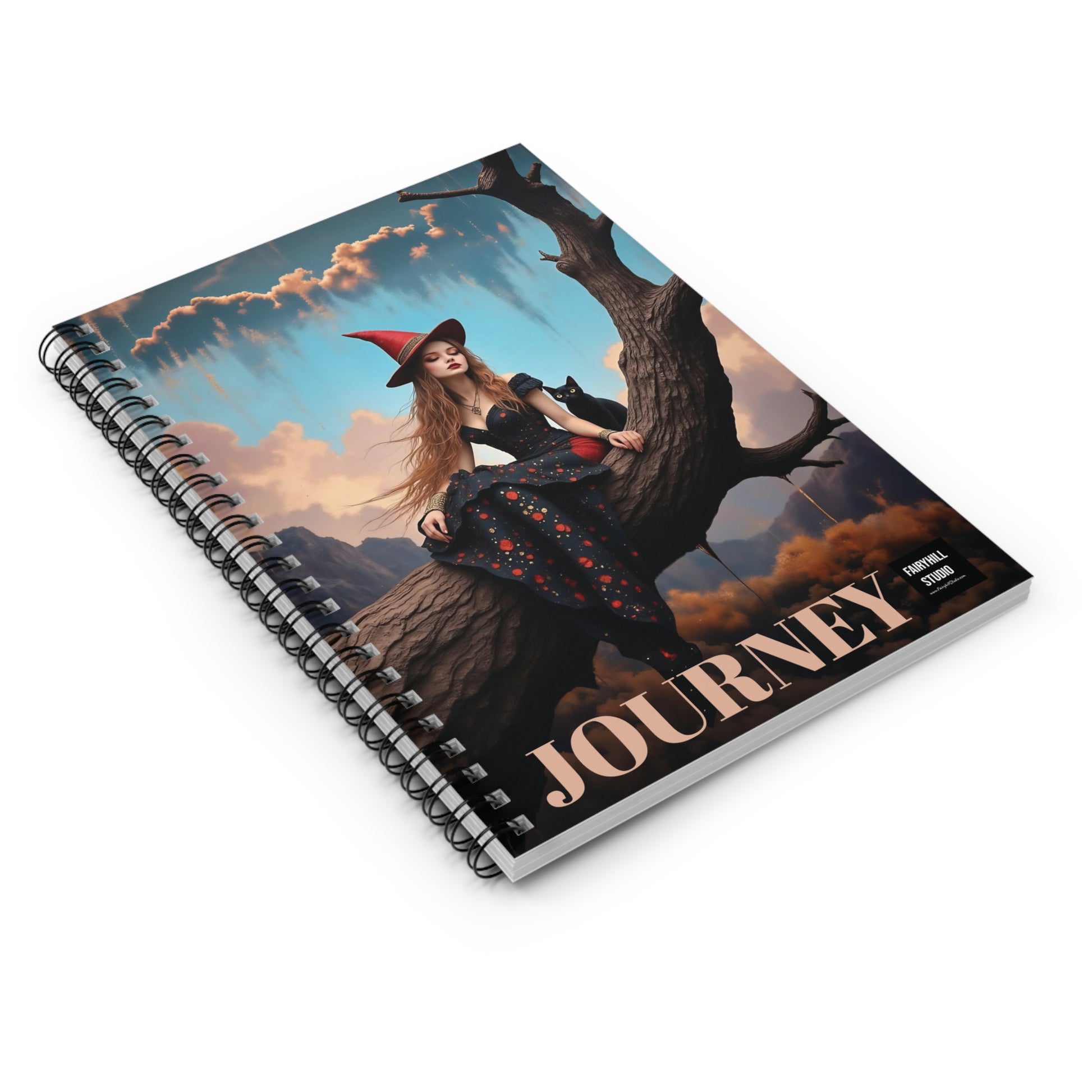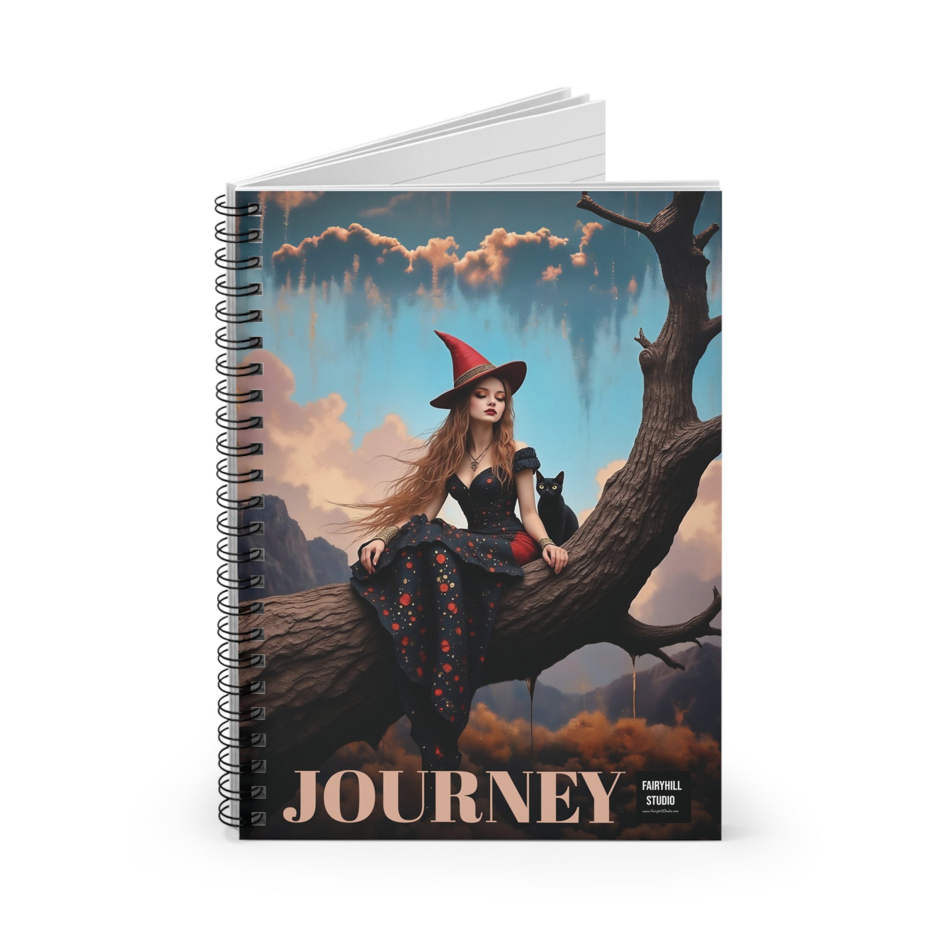 A Spiral Notebook journal featuring elegant witch wit black cat by Fairyhill studio, perfect for writing down thoughts and ideas. The ruled line pages provide structure while the metal spiral binding adds a fancy touch. This notebook is ideal for creative individuals looking to add a touch of whimsy to their everyday life. Perfect for students, artists, and music lovers. Great for back to school, birthdays, or as a thoughtful gift for any occasion.