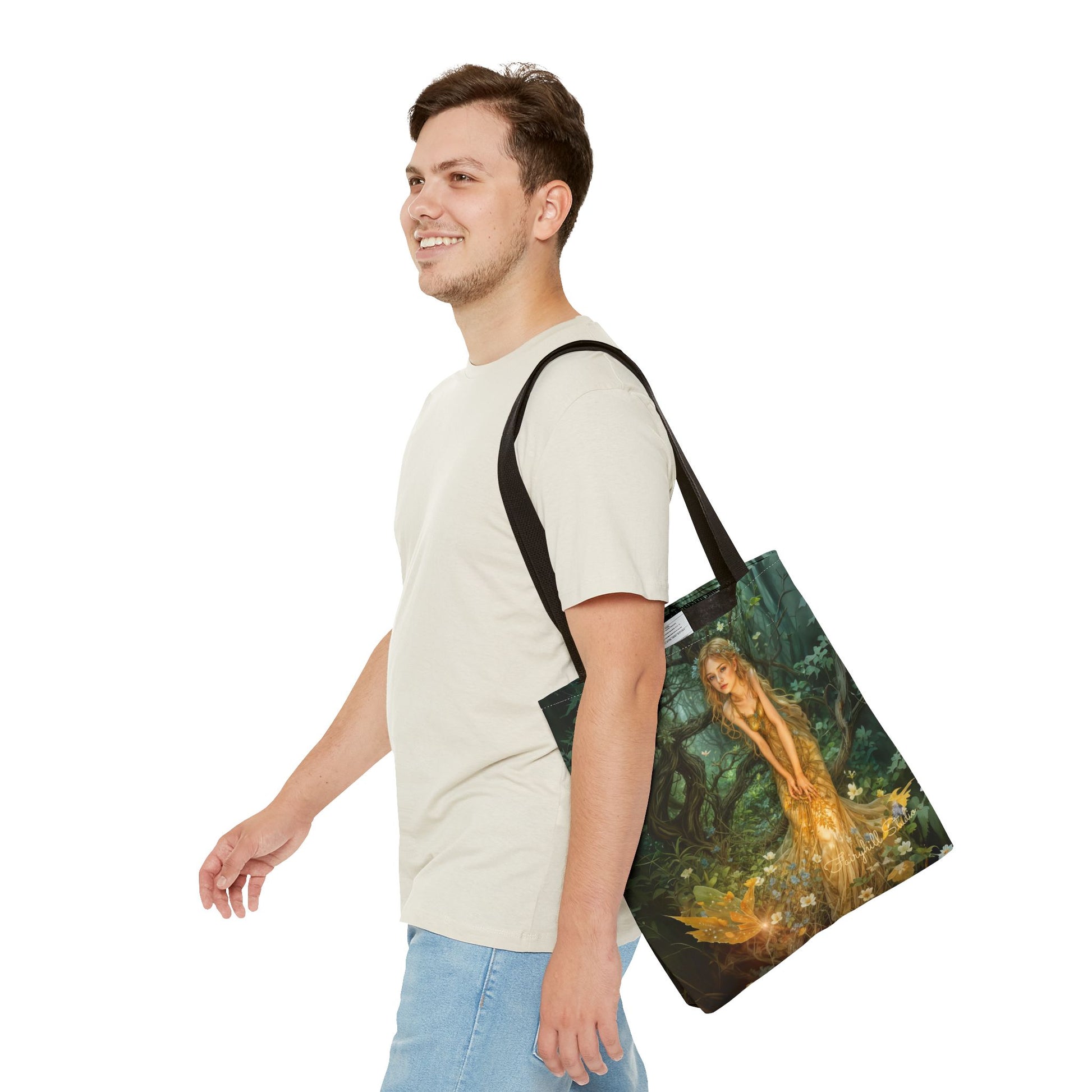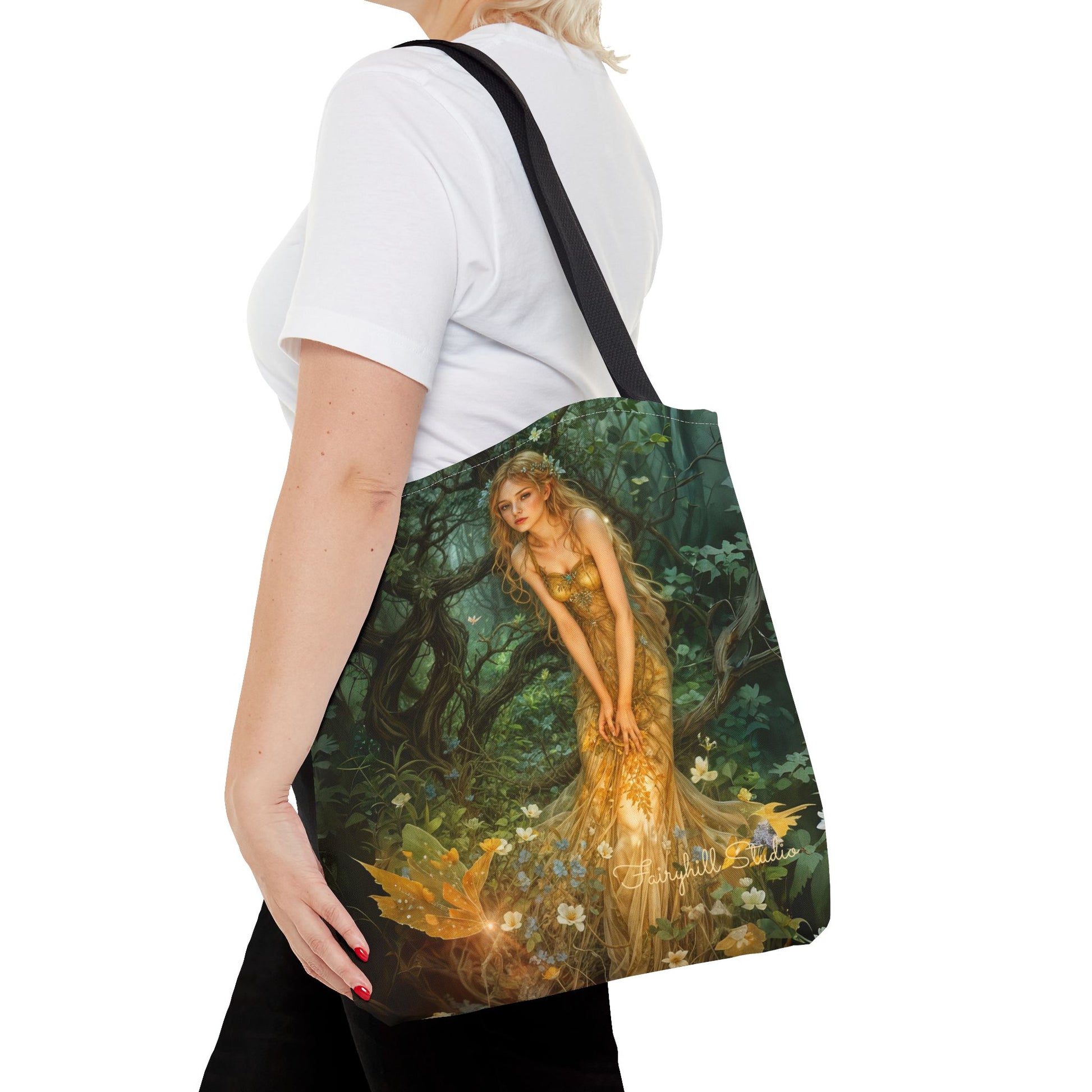 This Tote Bag features a beautiful girl in a magical fairy forest art inspired by Edward Robert Hughes' Mid-Summer's Eve painting. It gives off a mystical and enchanting vibe, perfect for those who love fantasy and nature. Ideal for carrying books, groceries, or everyday essentials, this Tote Bag is a must-have for nature lovers and art enthusiasts. It's great for summer outings, picnics, and nature walks.