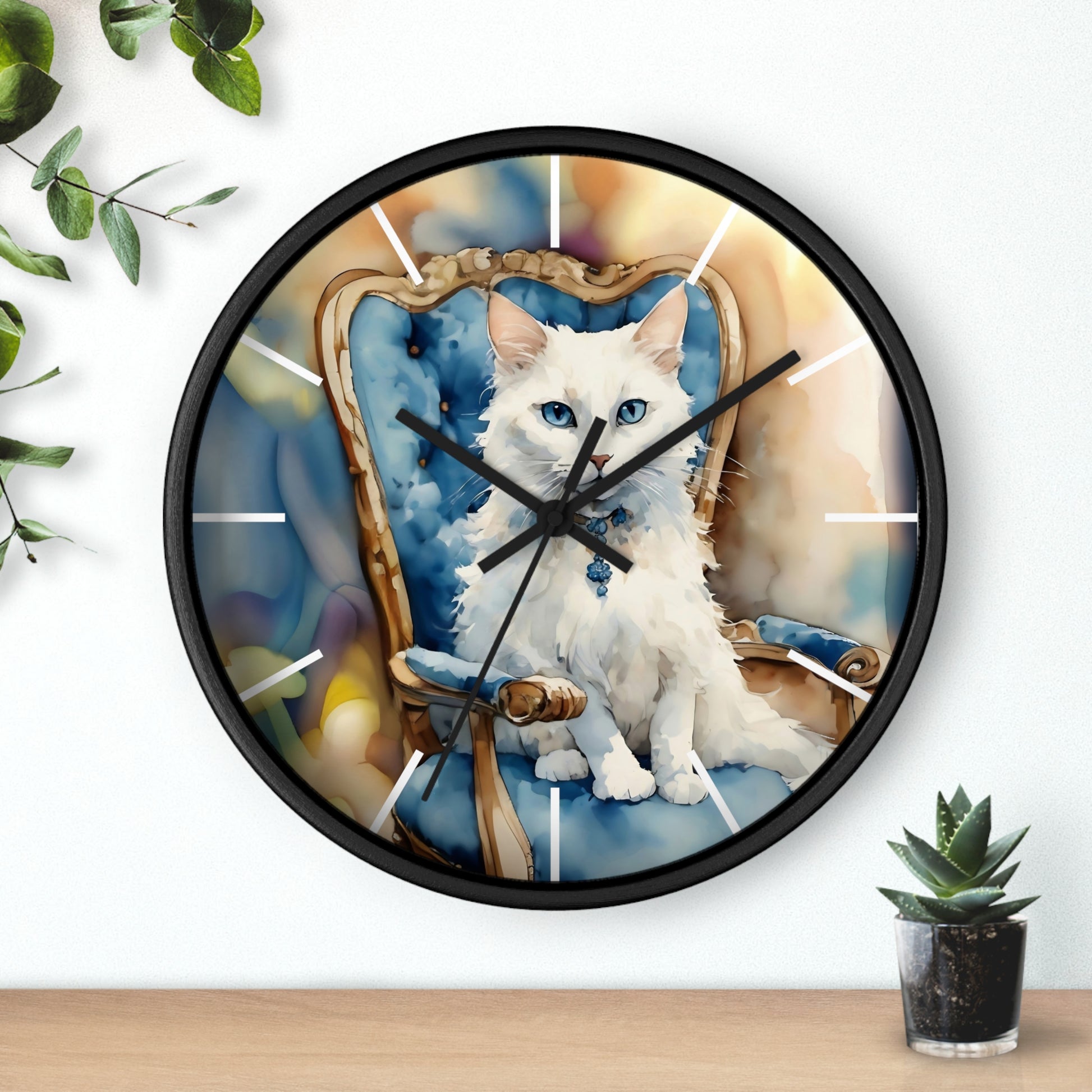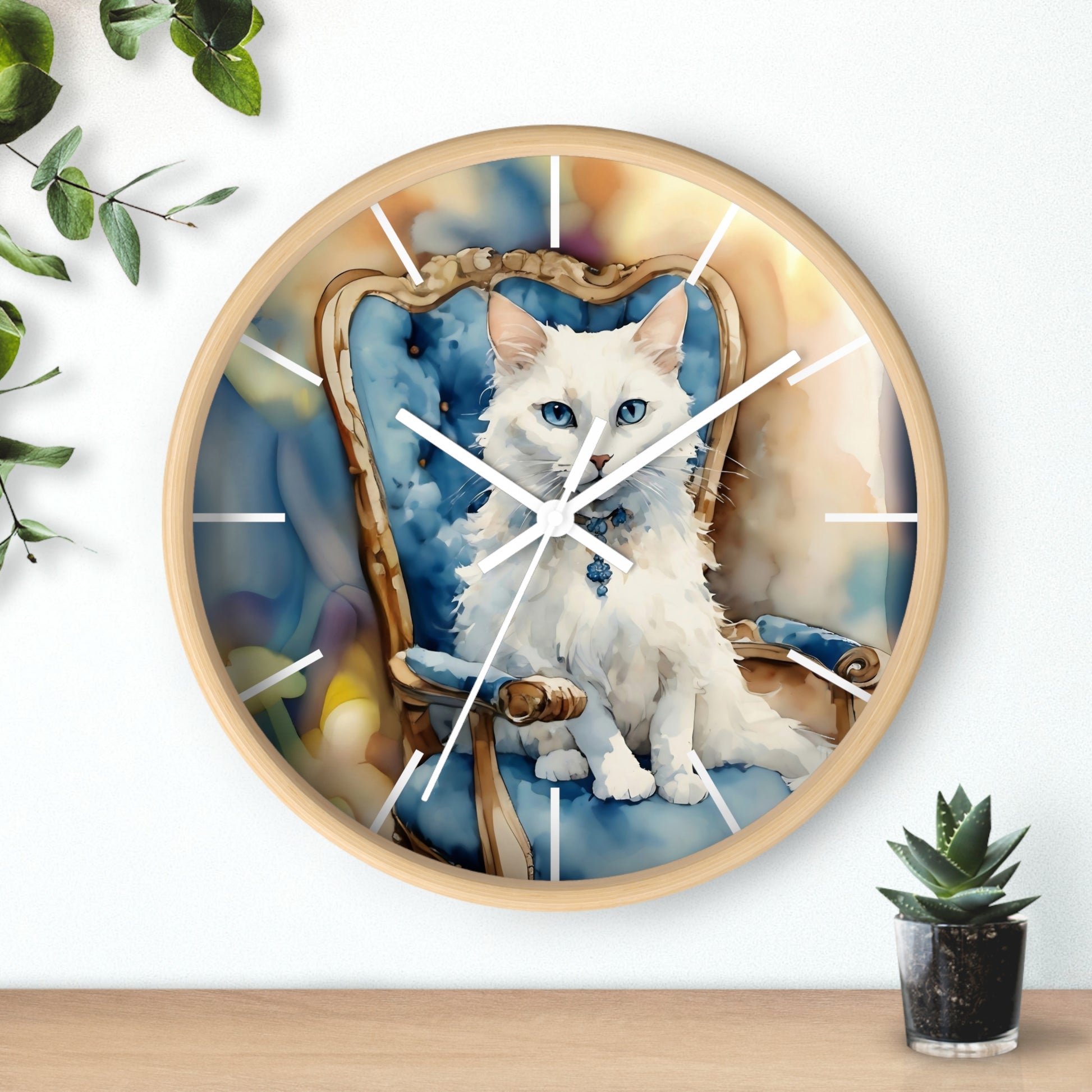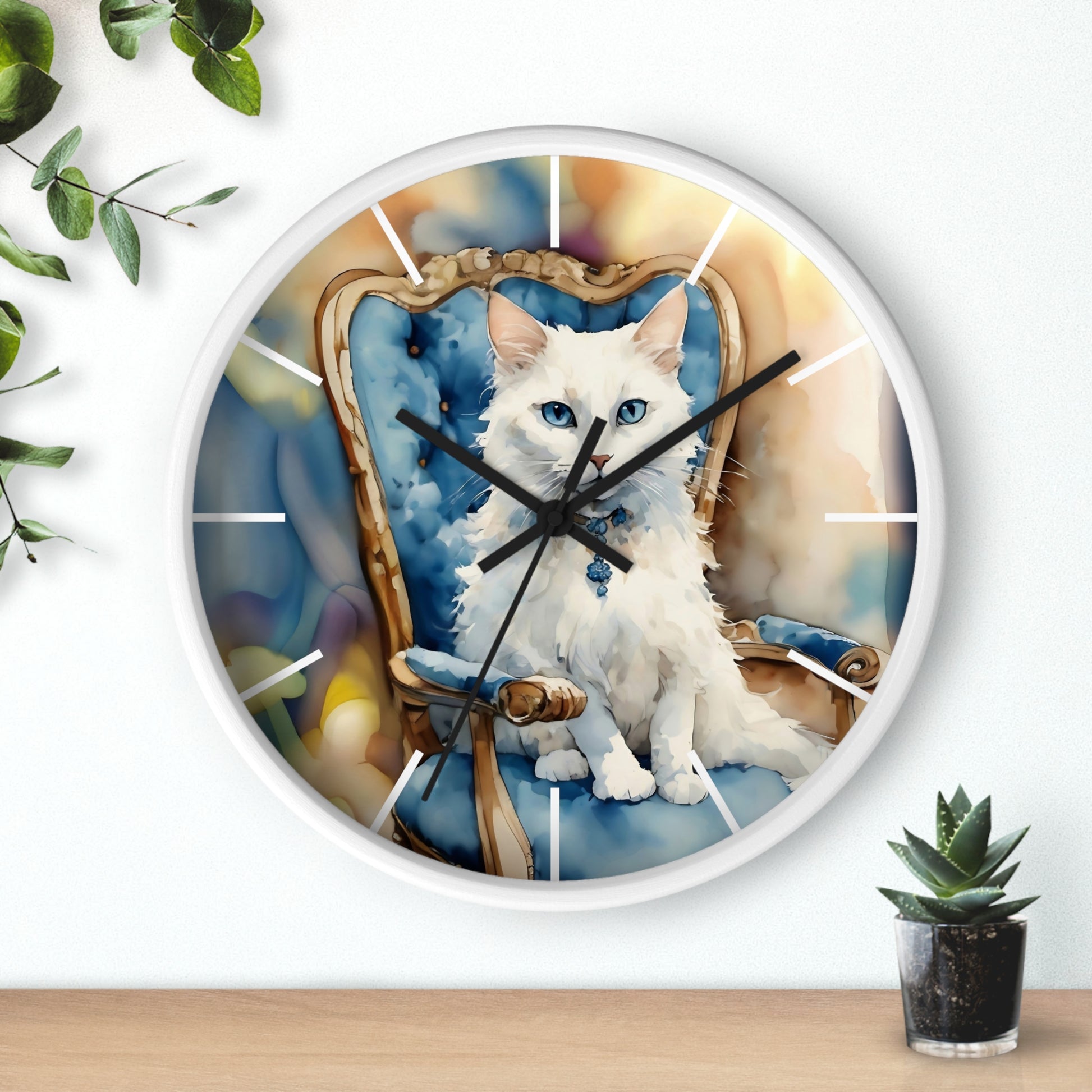This 'White cat with blue eyes' Wall Clock adds a whimsical touch to your home decor. Perfect for cat lovers and those who enjoy a touch of fantasy in their surroundings. Ideal for gifting on birthdays, holidays, or housewarmings.