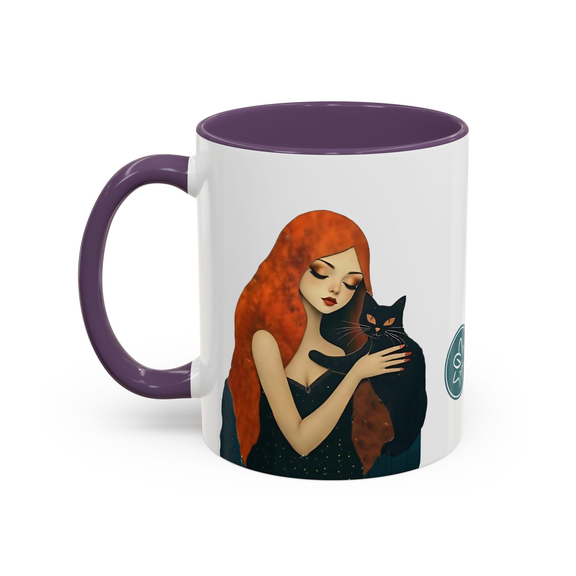 Meet your next favorite morning companion, the accented ceramicCrimson witch and black cat in winter fores . This mug brings the perfect blend of style and functionality to elevate your coffee or tea ritual. Available in two generous sizes, 11oz (0.33 l) and 15oz (0.44 l), this mug offers ample space for your favorite brew. Made with white ceramic and sporting a sleek glossy finish with eye-catching contrast, this mug is a bliss both to use and to look at. The ergonomic C-shaped handle provides a comfortable grip, while the lead and BPA-free construction guarantee peace of mind with every sip.