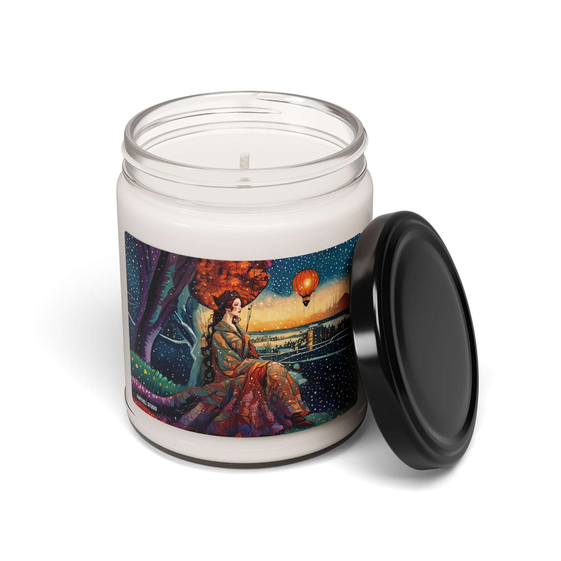 Hand-poured scented candle featuring a beautiful girl in a snowy day with hot air balloons, perfect for relaxation and home decor. Relevant for those who enjoy floral aromatics and a cozy atmosphere. Ideal for holidays like Christmas and everyday use.