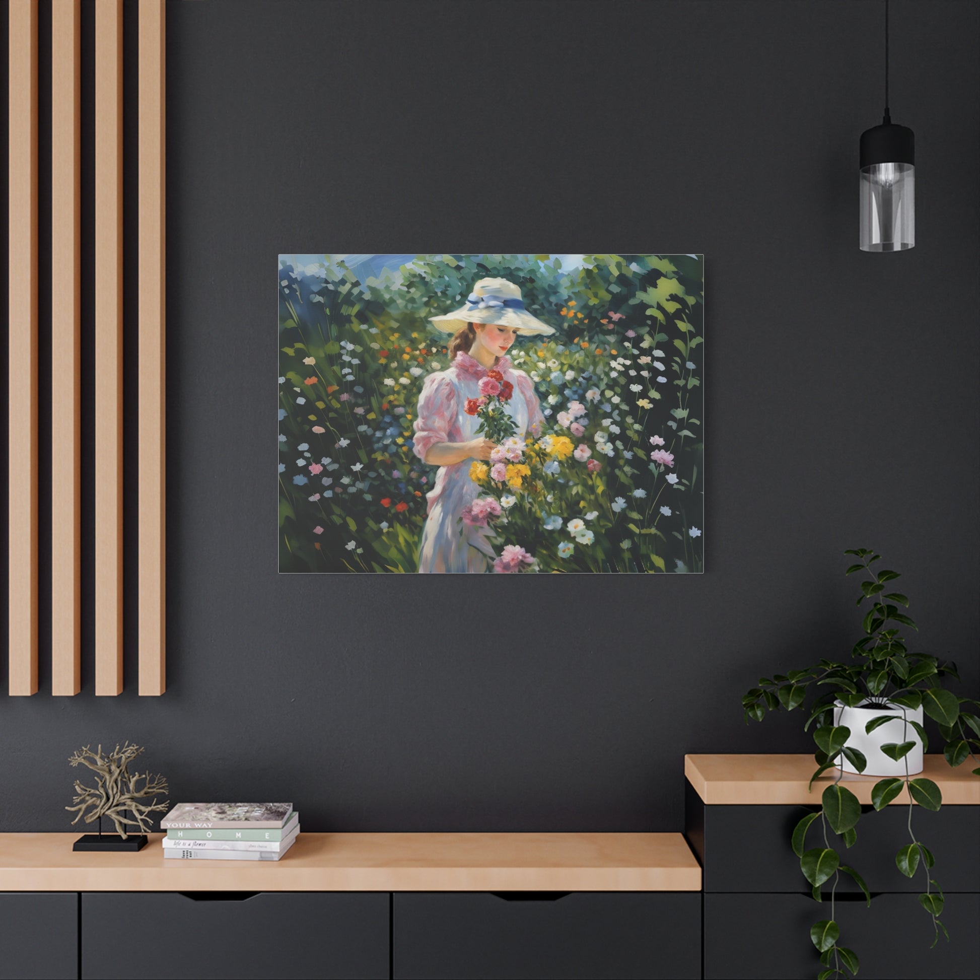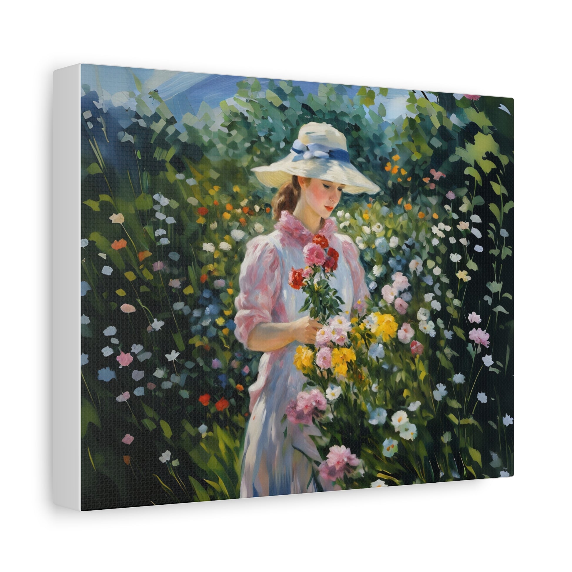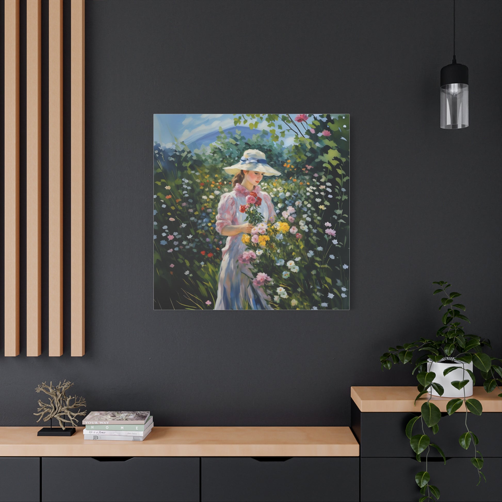 Elevate your space with this Monet Style Floral Serenity Canvas Art featuring an elegant woman with a hat and flower basket in a flower garden. The stretched matte canvas exudes a serene and elegant vibe, perfect for art lovers and those who appreciate classic beauty. Ideal for adding a touch of sophistication to any room, this canvas art is relevant for home decor, special occasions, and gifts.