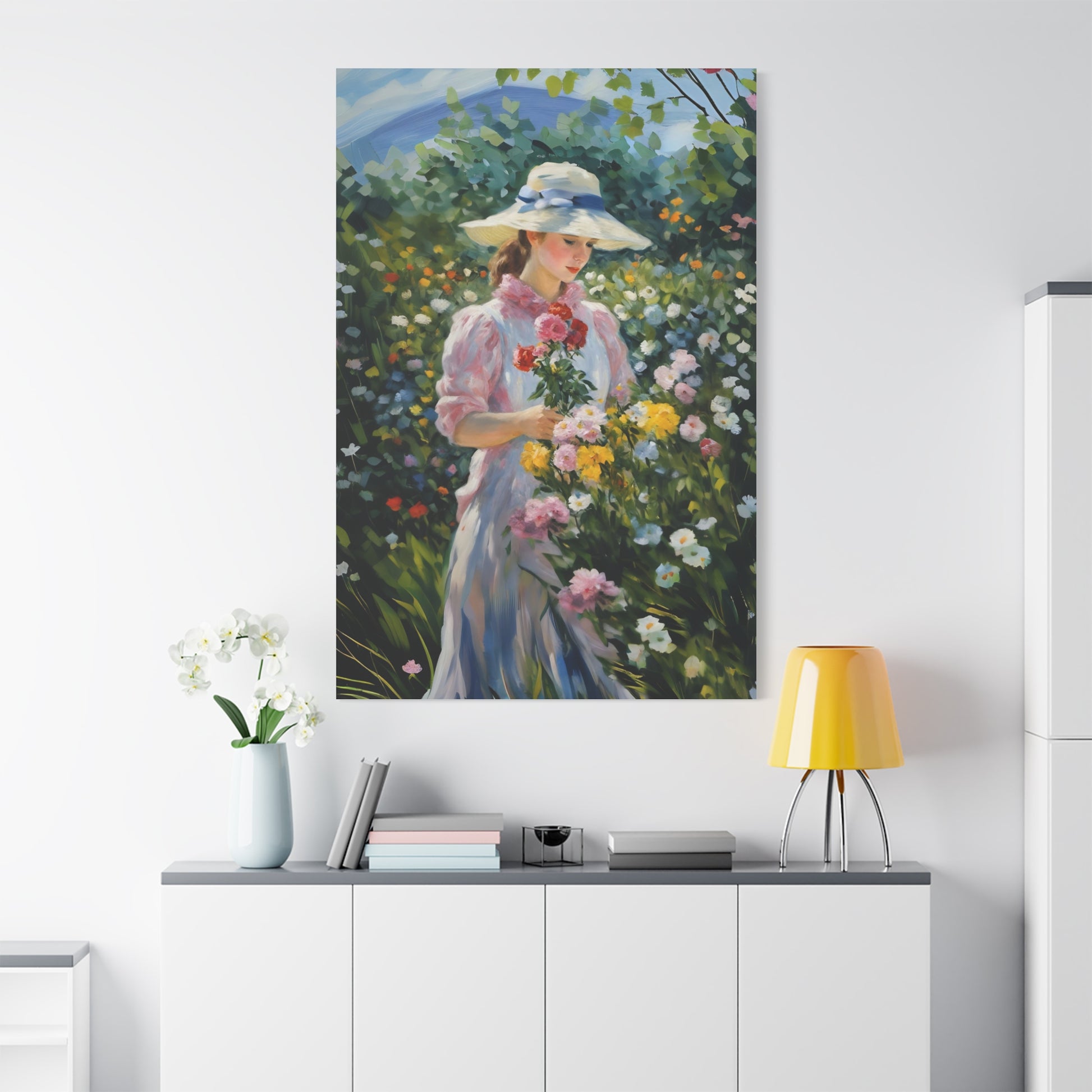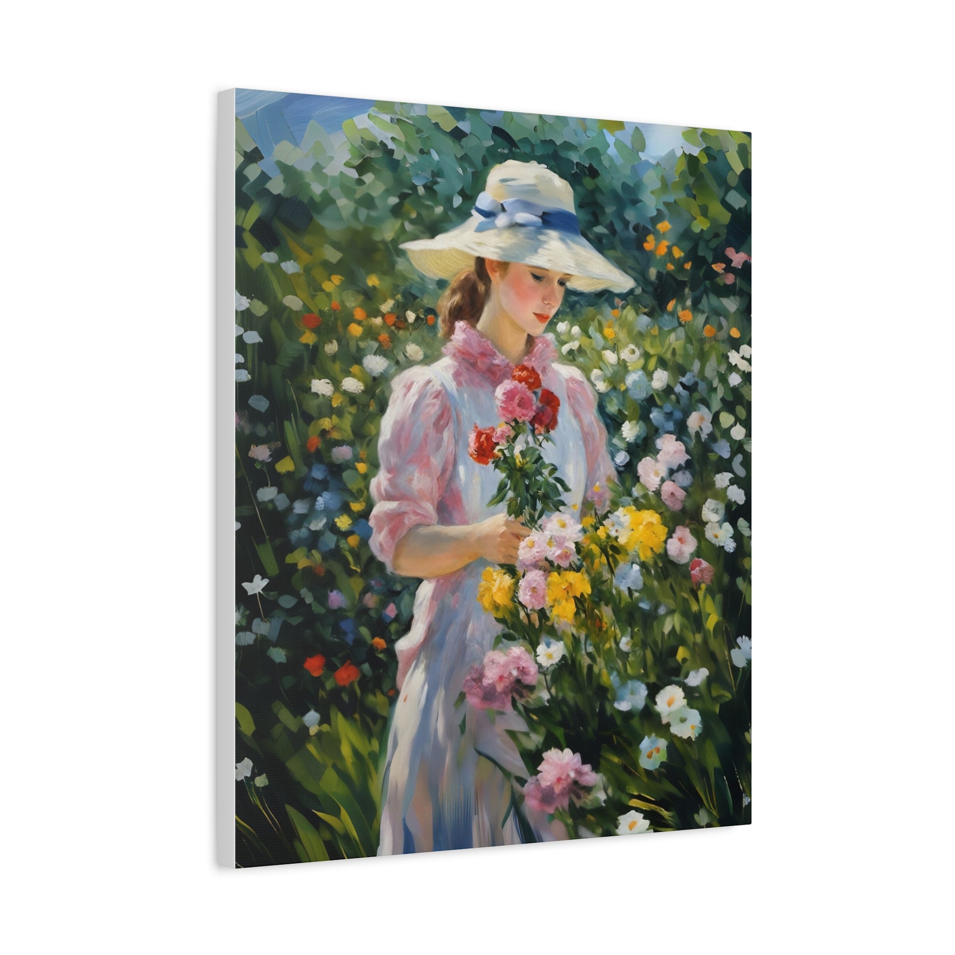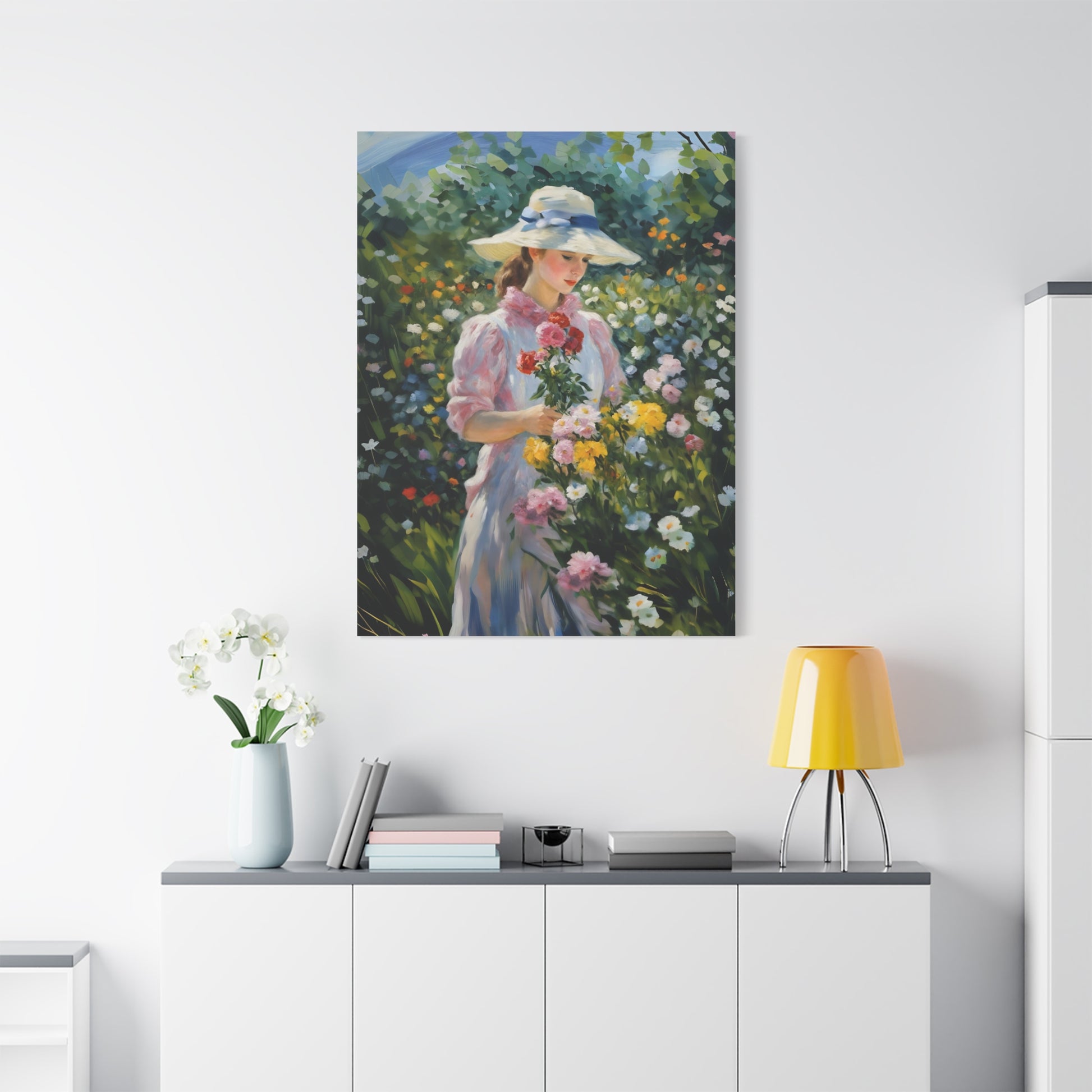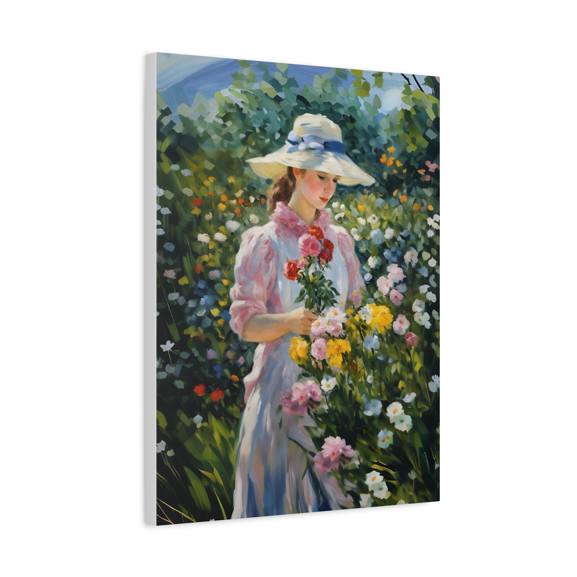 Monet style Art Elegant Woman with hat and flower basket in a Flower Garden by Fairyhill studio Transform your living space with this stunning Matte Canvas! Featuring vibrant floral artwork, this piece adds a touch of elegance and serenity to any room. Perfect for those who appreciate nature and beauty, it creates a calming atmosphere in your home or office. Ideal for gifting on occasions like housewarming parties, birthdays, or holidays, this canvas is a thoughtful touch for loved ones who enjoy art and decor. Whether it’s styled in a cozy reading nook or a cheerful living room, this piece will surely become a conversation starter.