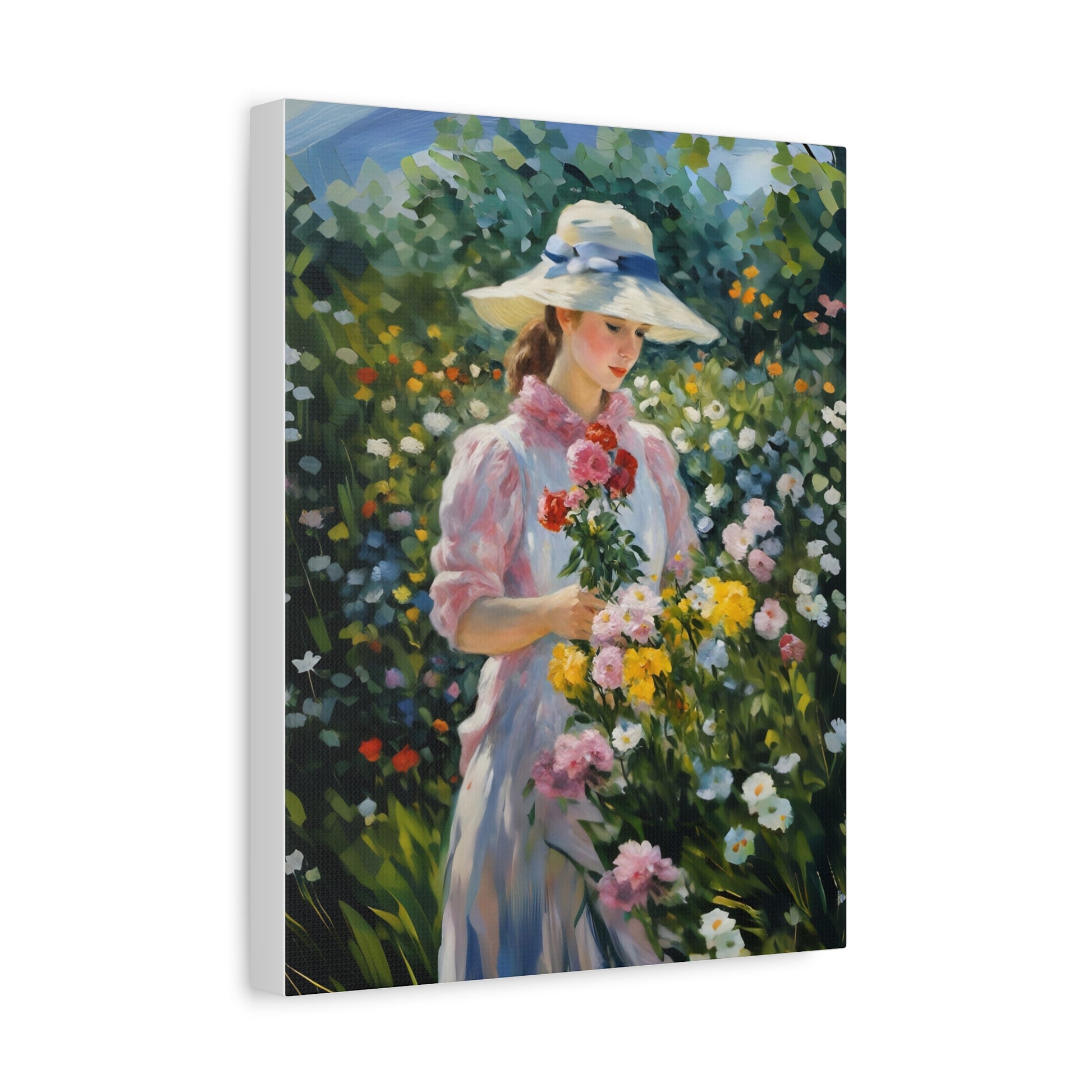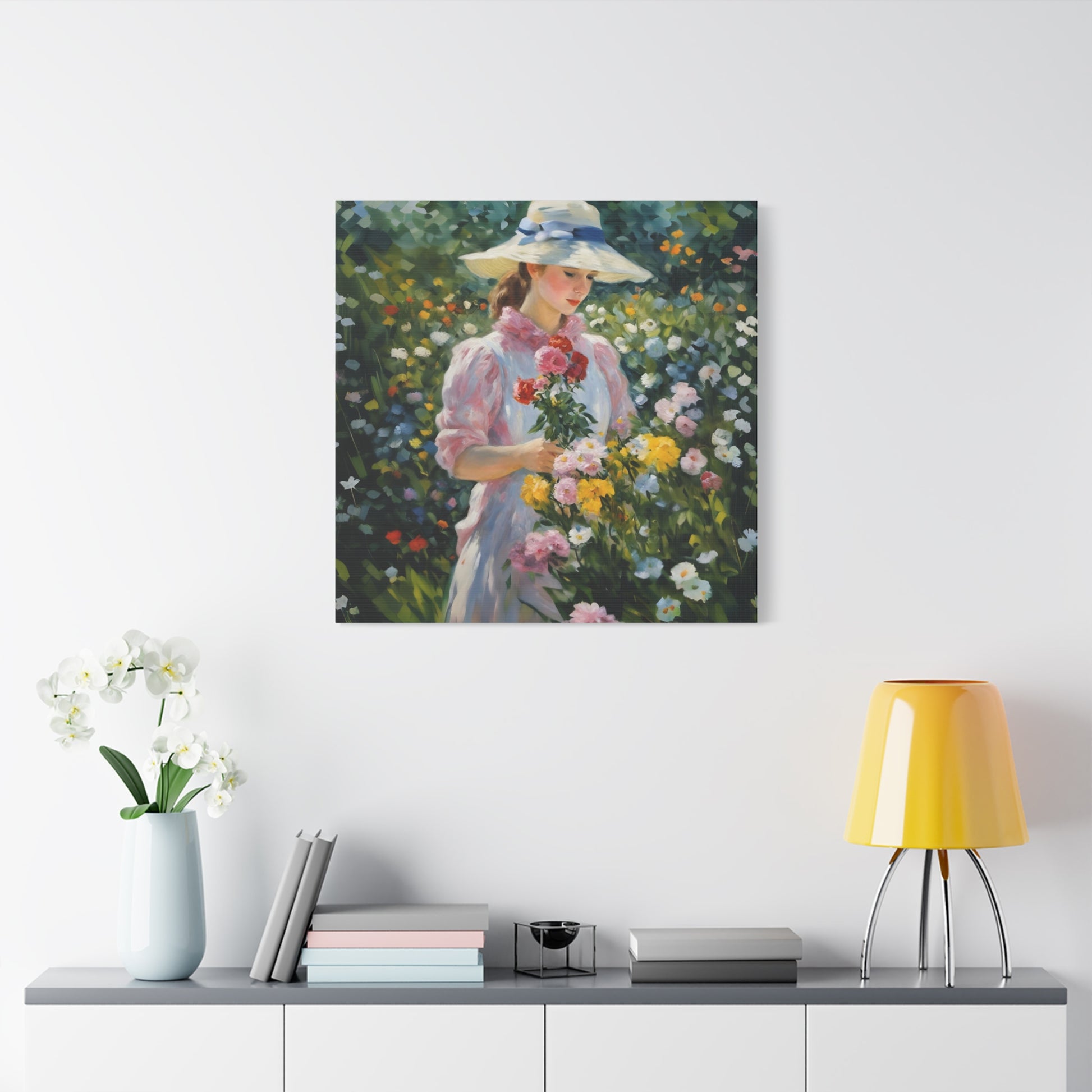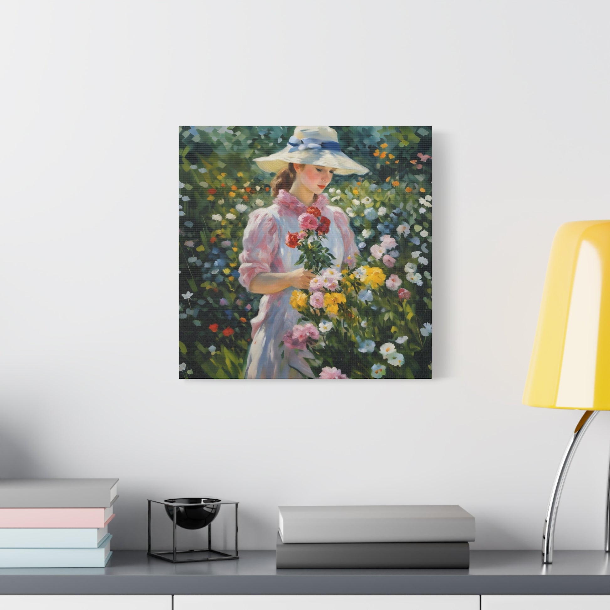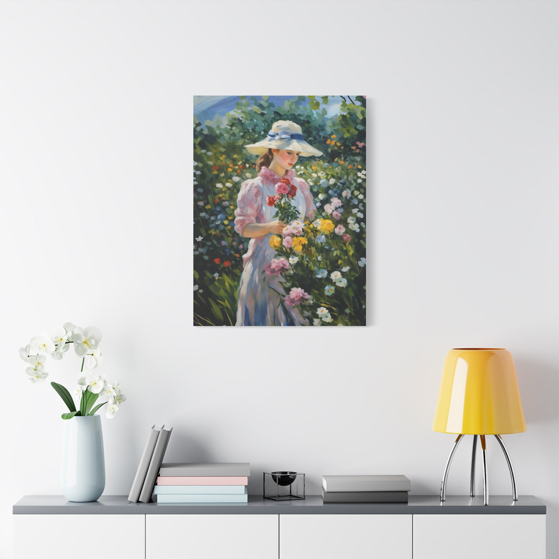 Monet style Art Elegant Woman with hat and flower basket in a Flower Garden by Fairyhill studio Transform your living space with this stunning Matte Canvas! Featuring vibrant floral artwork, this piece adds a touch of elegance and serenity to any room. Perfect for those who appreciate nature and beauty, it creates a calming atmosphere in your home or office. Ideal for gifting on occasions like housewarming parties, birthdays, or holidays, this canvas is a thoughtful touch for loved ones who enjoy art and decor. Whether it’s styled in a cozy reading nook or a cheerful living room, this piece will surely become a conversation starter.