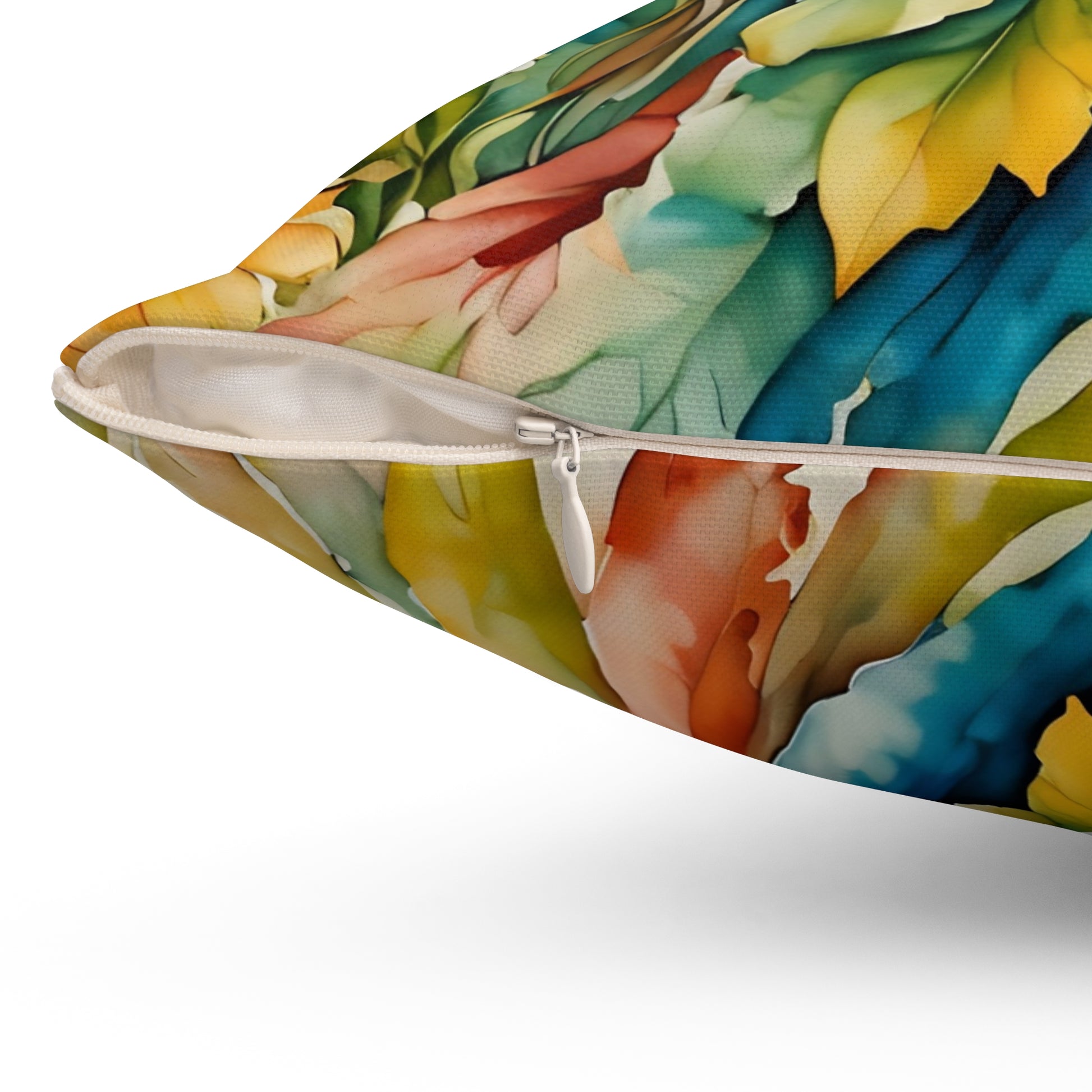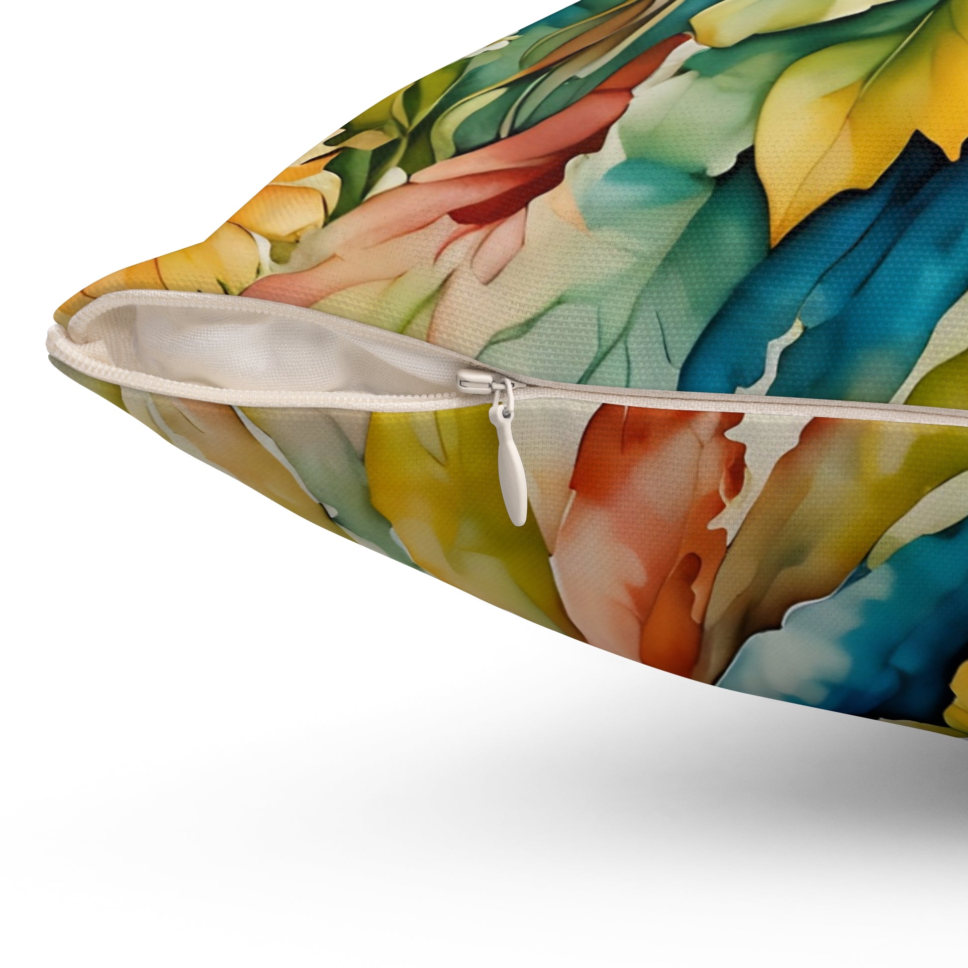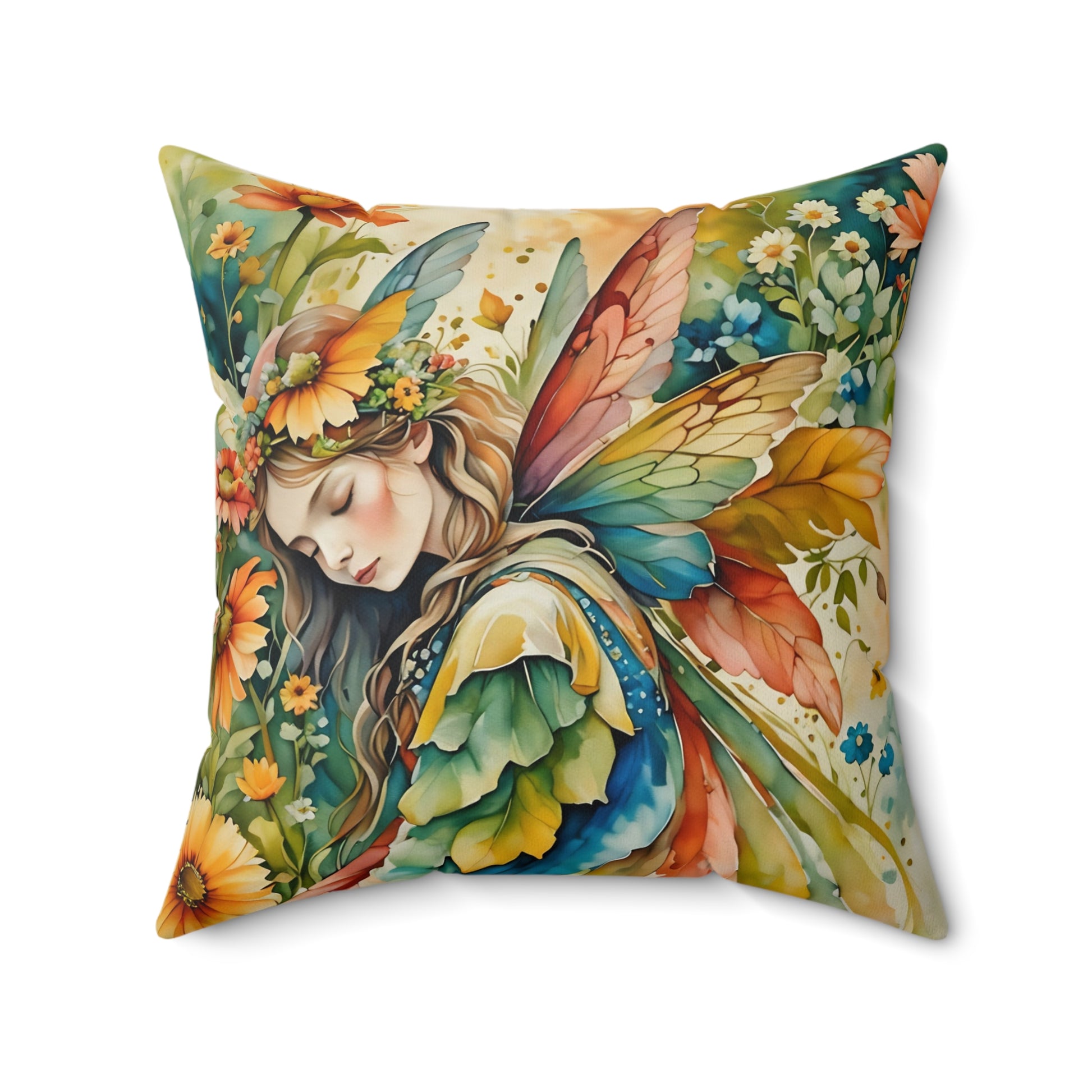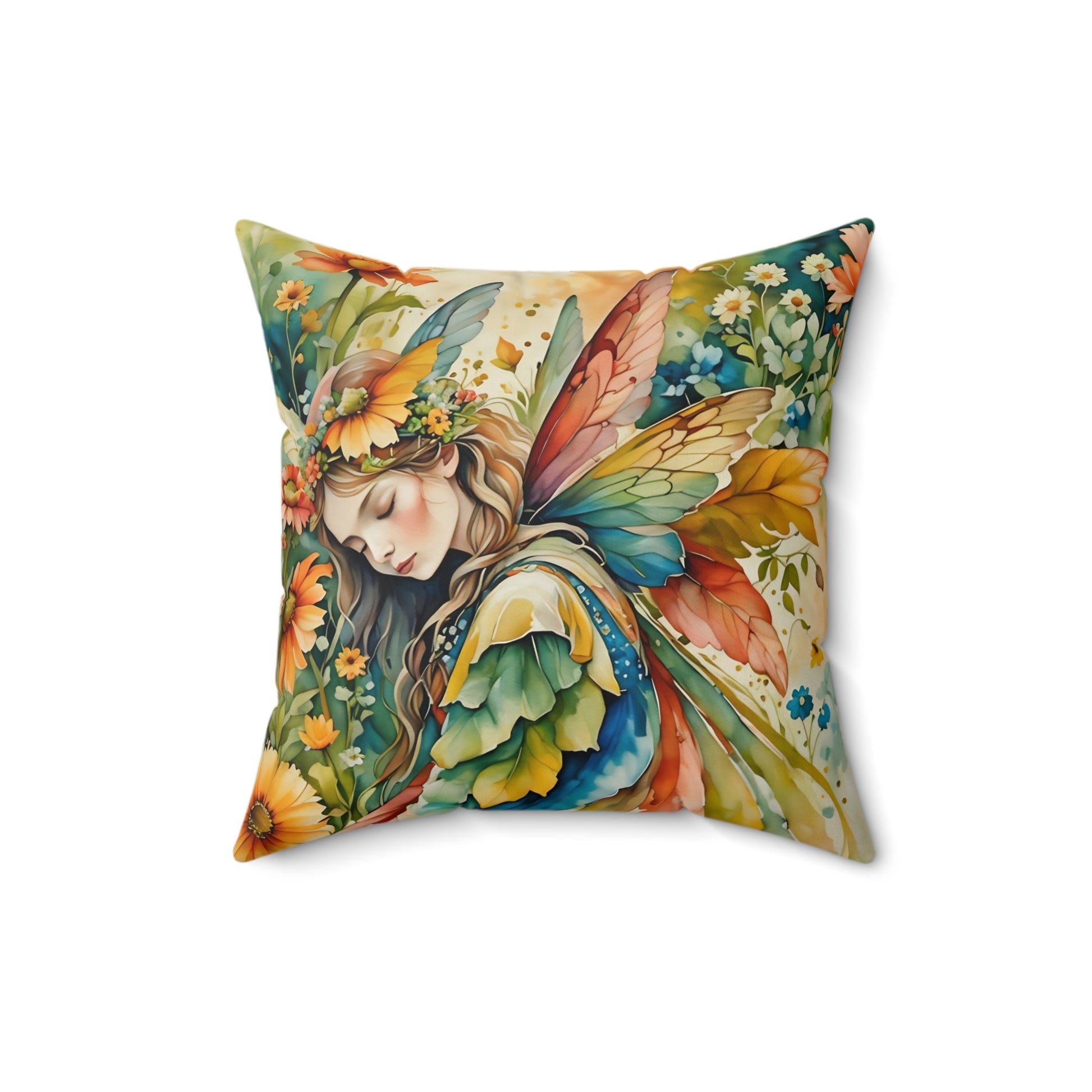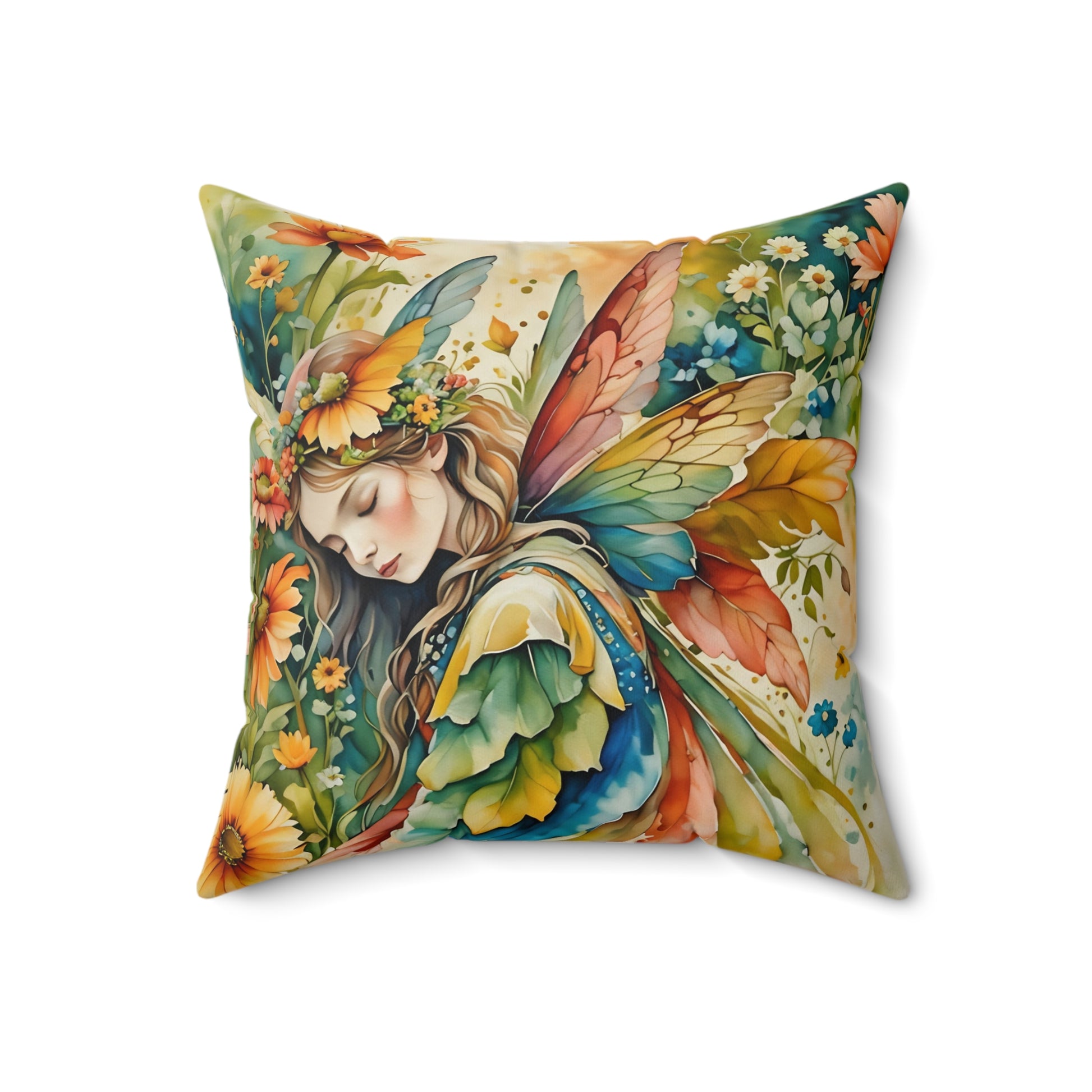 Spun Polyester Square pillow featuring a splash of colors Garden Fairy  art by Fairyhill studio. This vibrant and unique pillow adds a touch of whimsy to any room, perfect for Garden ,Fairy lovers and those who enjoy colorful decor. Ideal for gifting on birthdays, Mother's Day, or as a housewarming present.