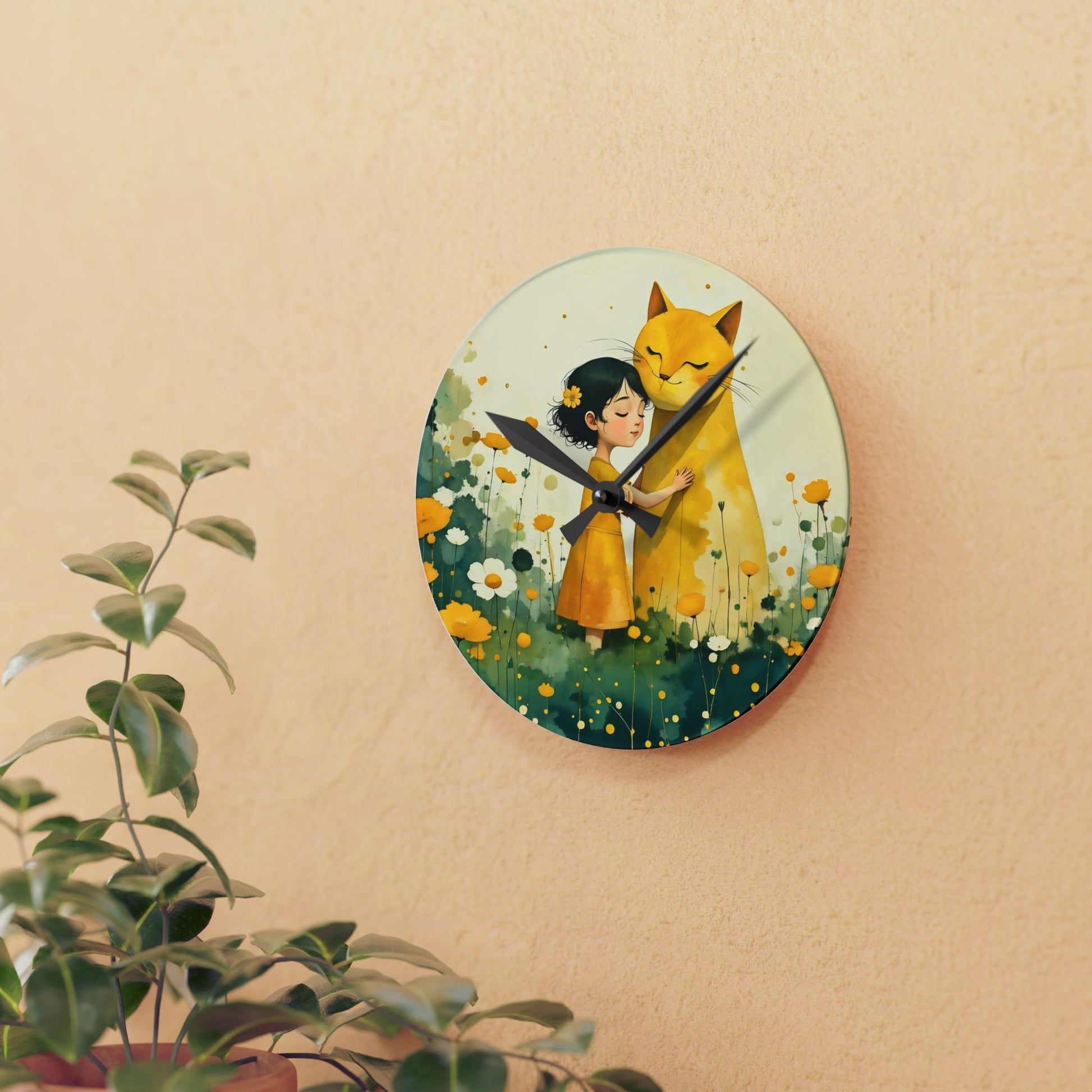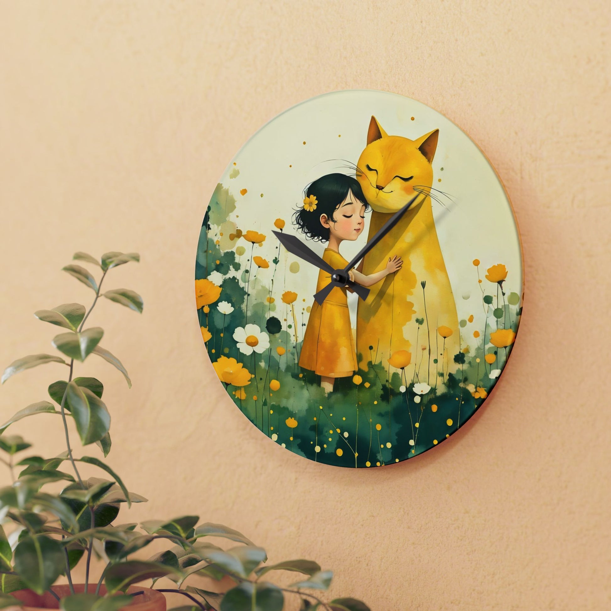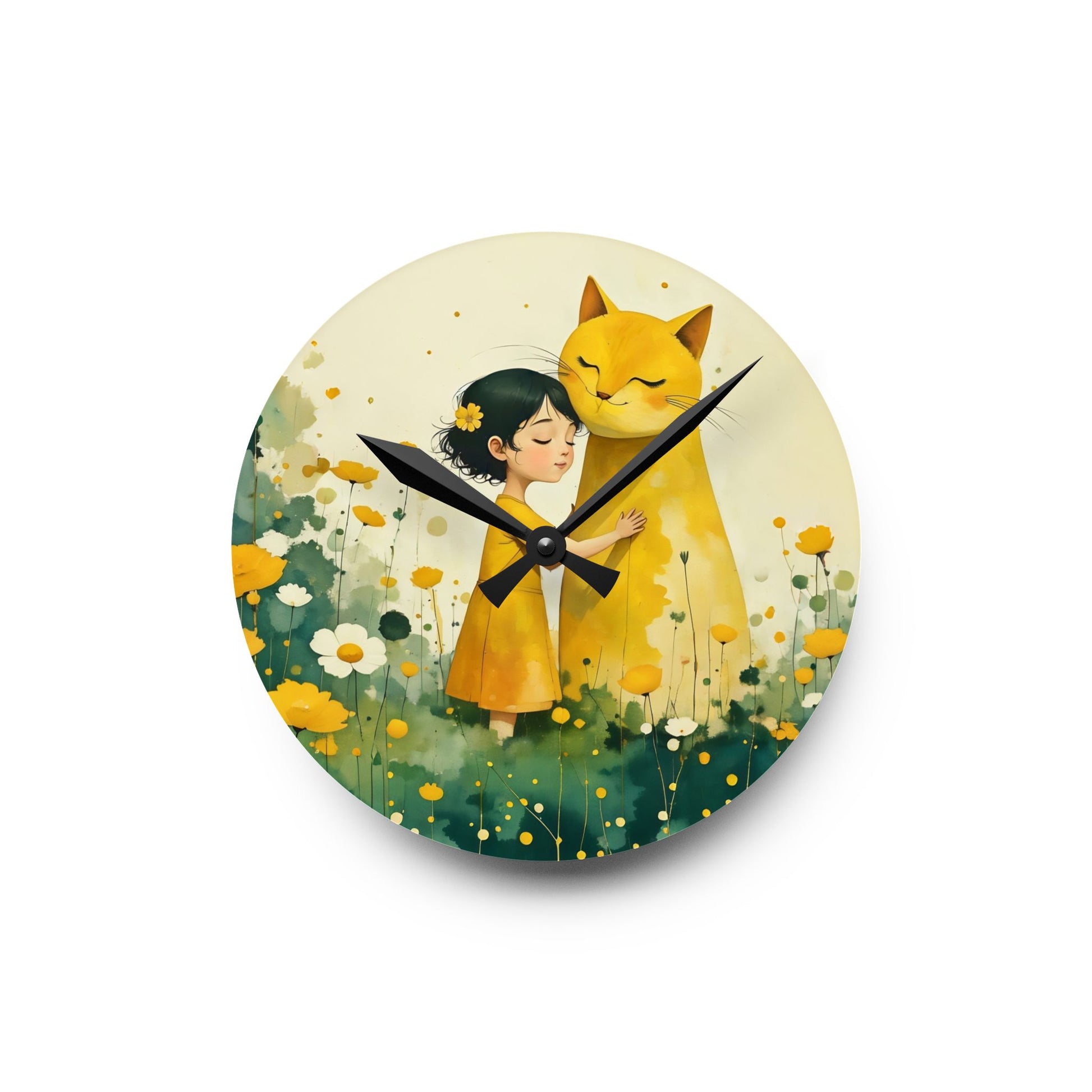 Bring the serene and magical feeling of happiness into your home with this Acrylic Wall Clock featuring A girl with yellow cat Acrylic Wall Clock art by Fairyhill.Studio Perfect for whimsical art lovers owl lovers and holiday enthusiasts, this wall boho clock adds a touch of whimsy and nature to any room.