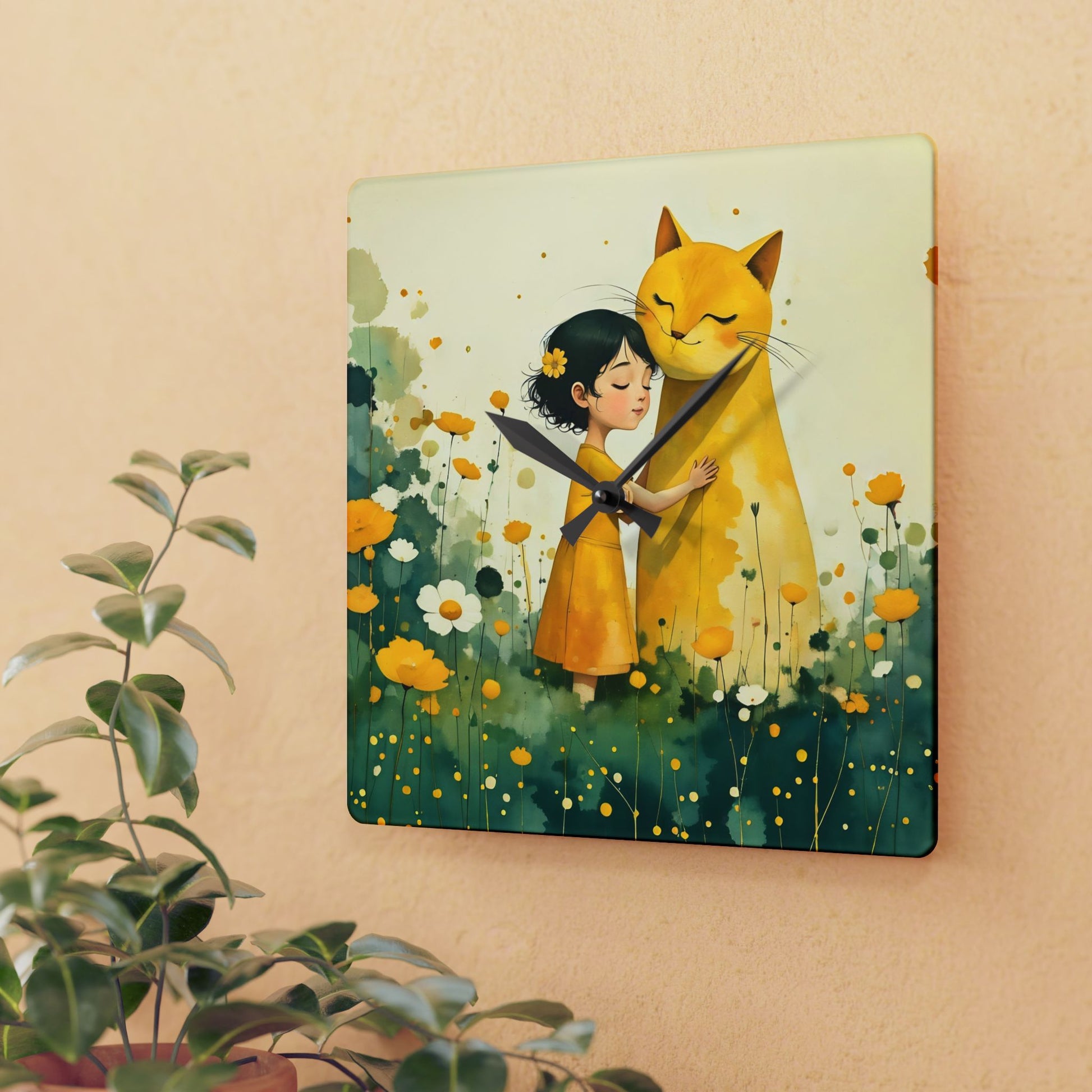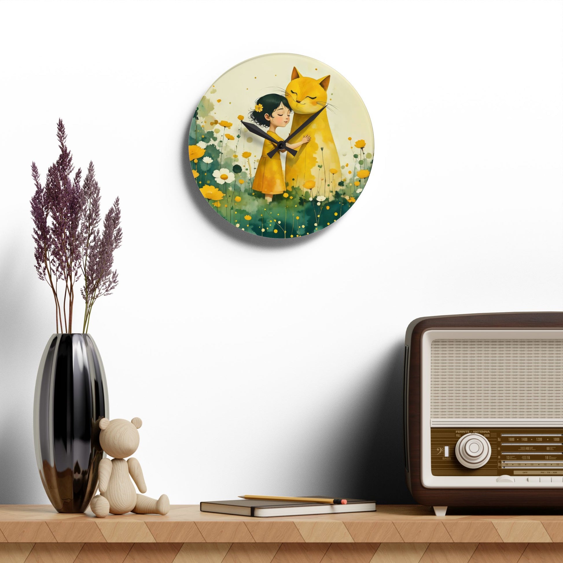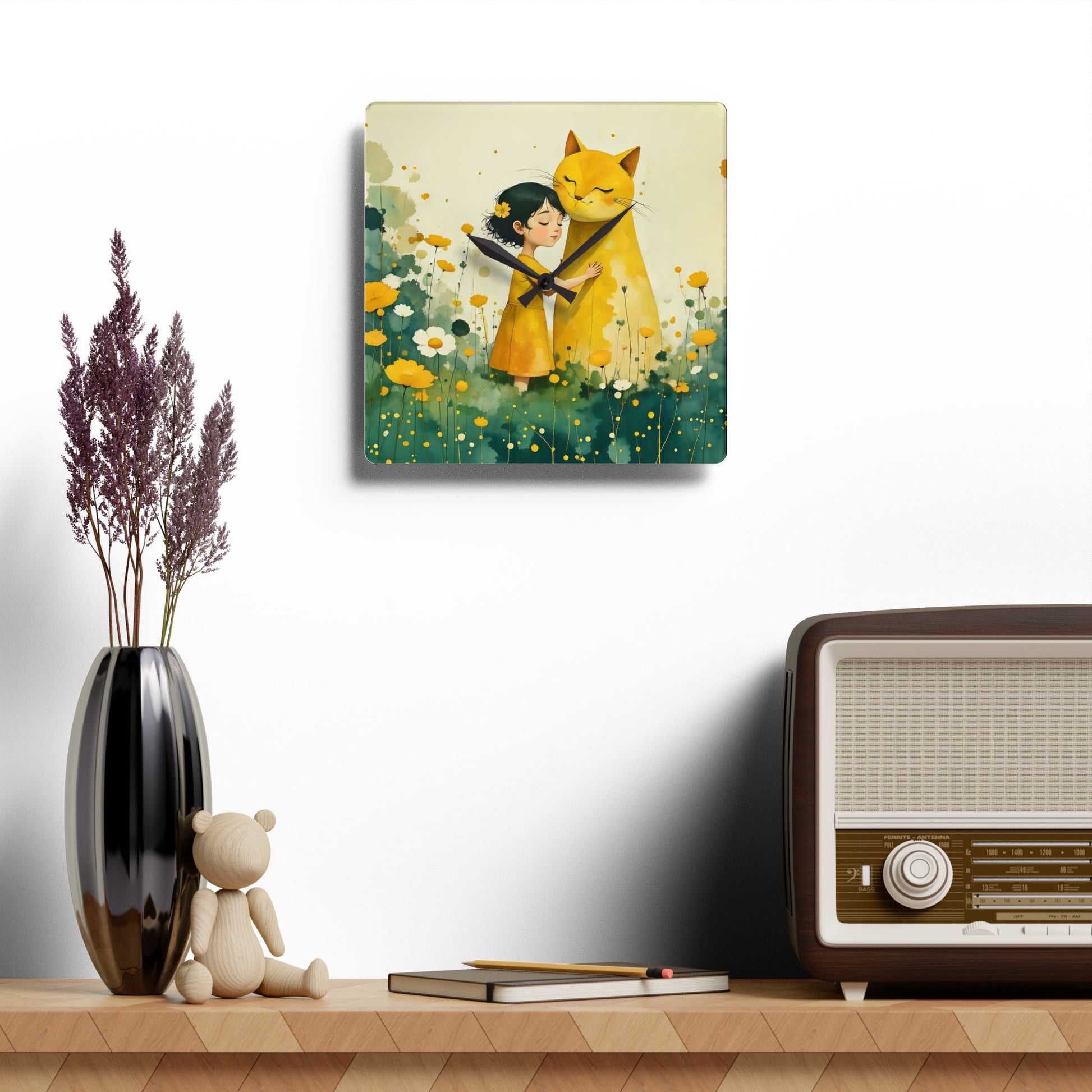 Bring the serene and magical feeling of happiness into your home with this Acrylic Wall Clock featuring A girl with yellow cat Acrylic Wall Clock art by Fairyhill.Studio Perfect for whimsical art lovers owl lovers and holiday enthusiasts, this wall boho clock adds a touch of whimsy and nature to any room.