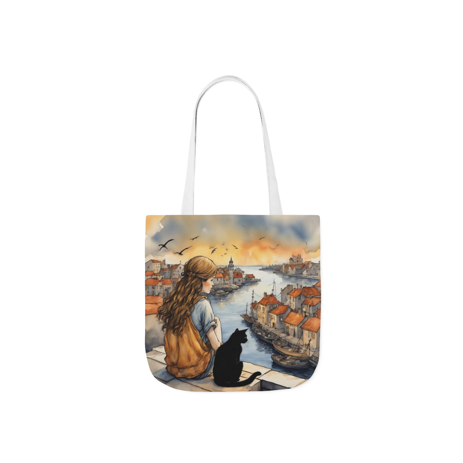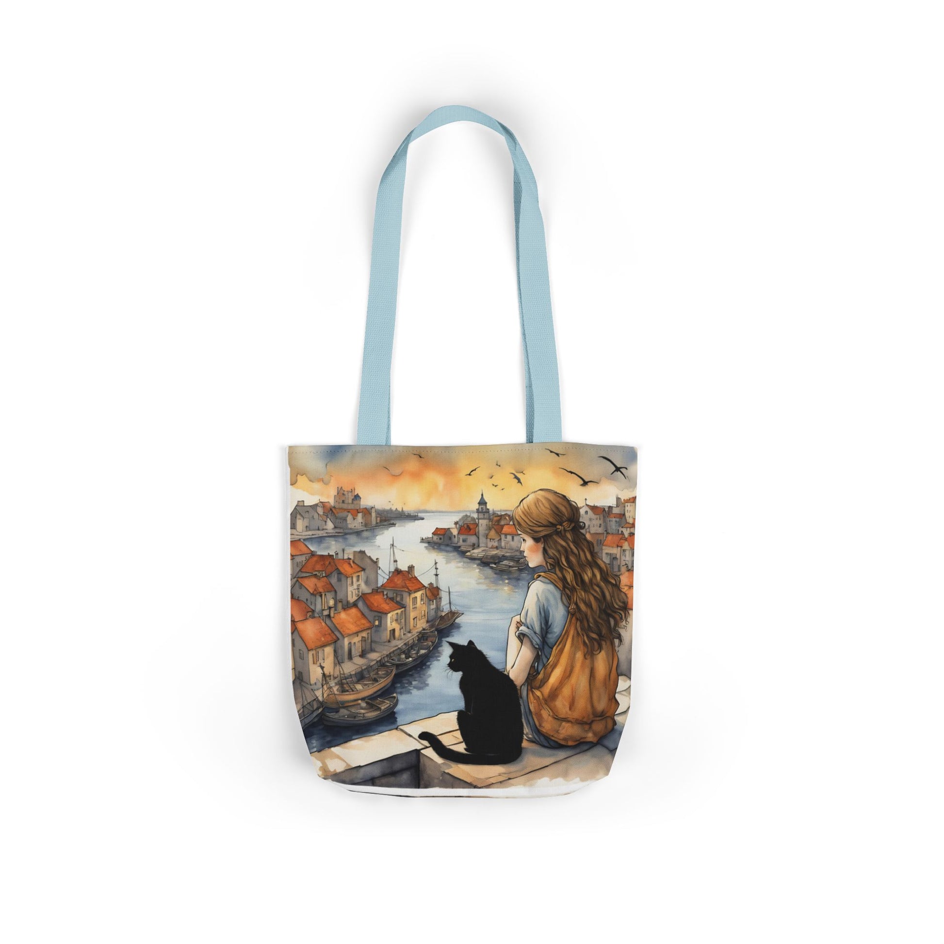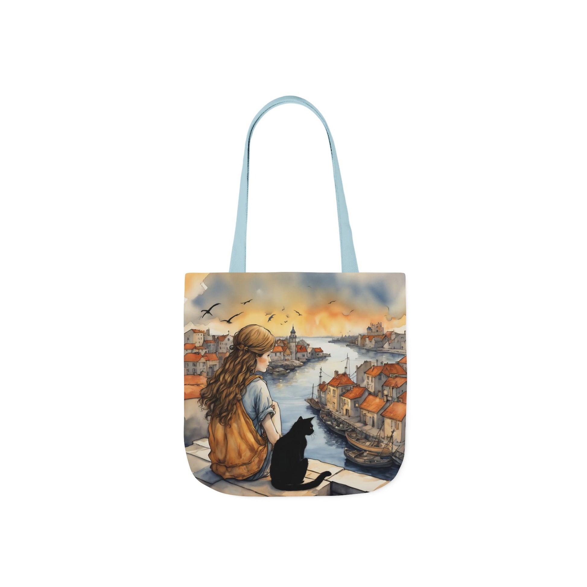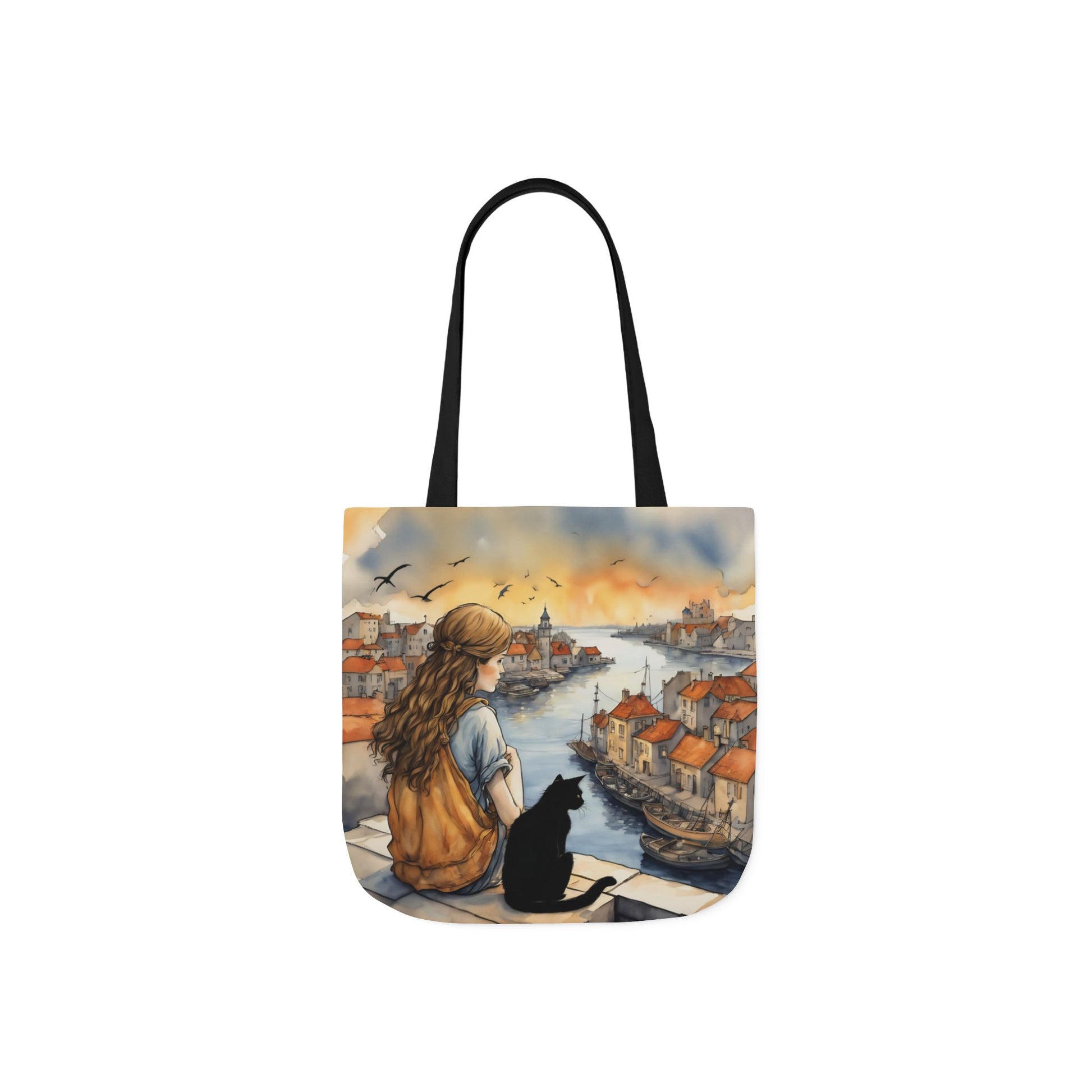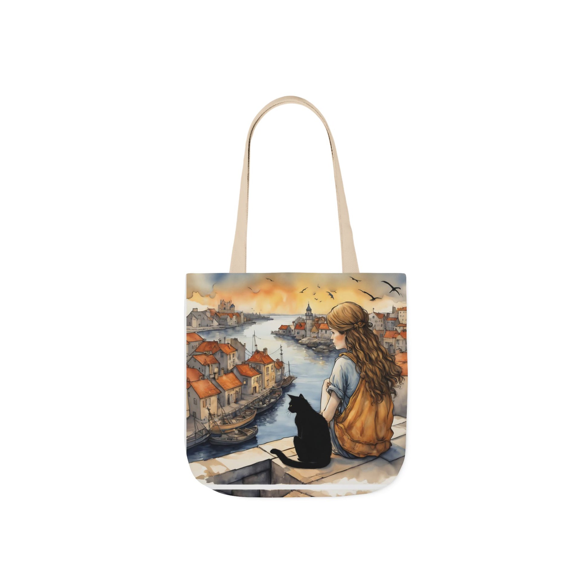 Elevate your everyday style with this Girl with a Black cat on a roof top vibrant Canvas Tote Bag. Crafted from luxuriously soft 100% polyester canvas, it features a stunning all-over print that showcases bold colors and unique designs, perfect for making a statement wherever you go. This tote bag effortlessly blends functionality with flair, making it ideal for daily errands, beach days, or city adventures. With its spacious interior and boxed corners, it provides ample room for your essentials while the five color strap options let you express your personal style. This bag is perfect for art lovers, eco-conscious shoppers, and anyone who enjoys adding a splash of color to their life. Whether you're celebrating a birthday, gearing up for a summer festival, or just treating yourself, this Canvas Tote Bag is a must-have accessory for every occasion.