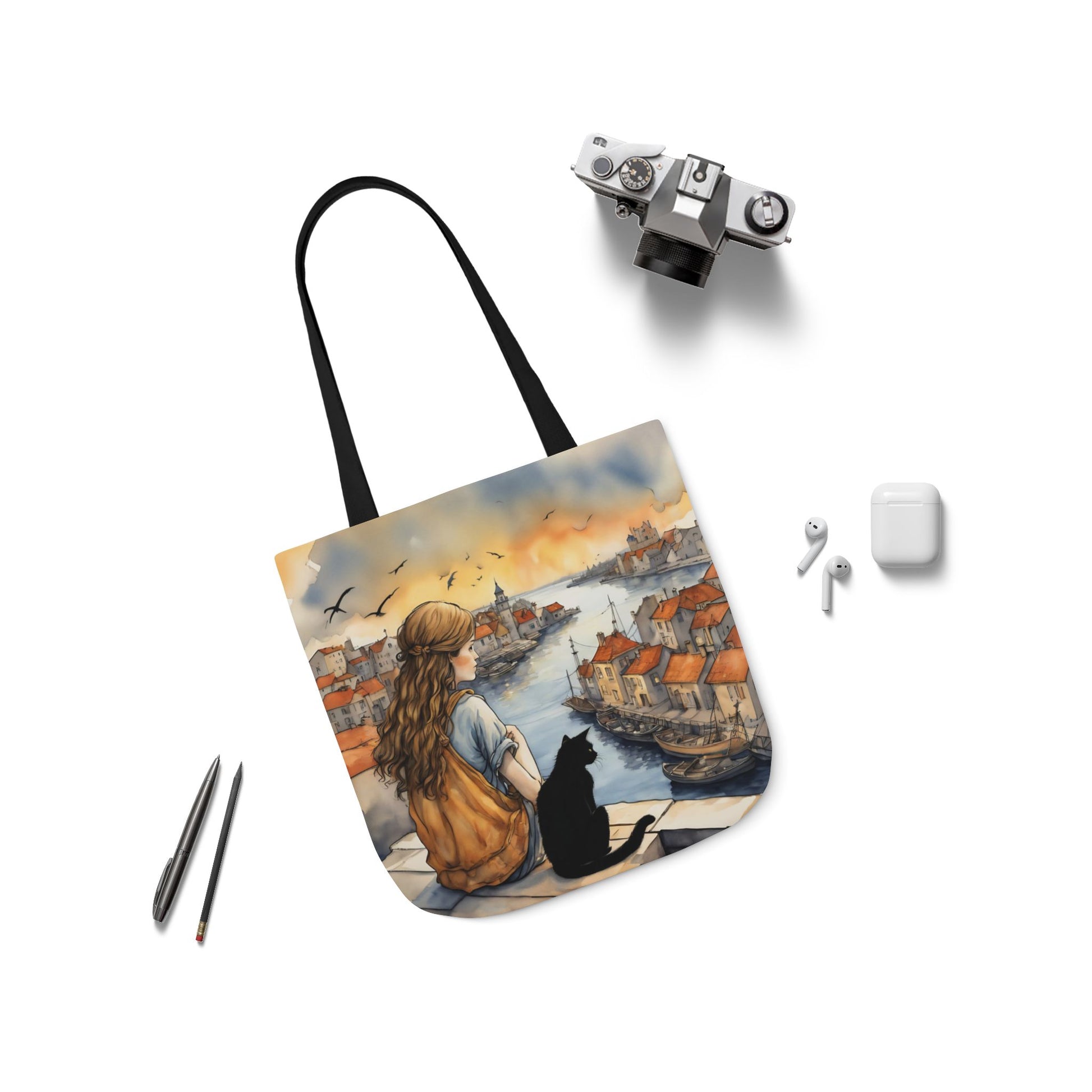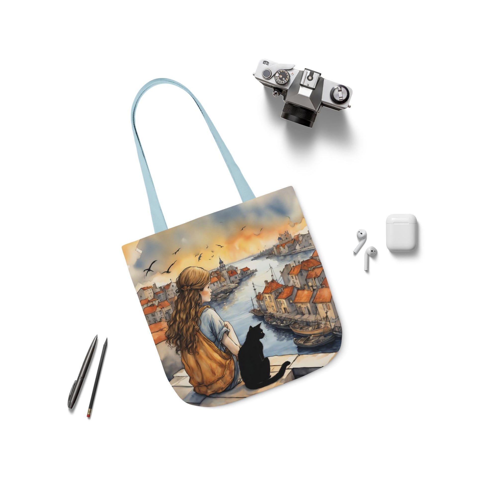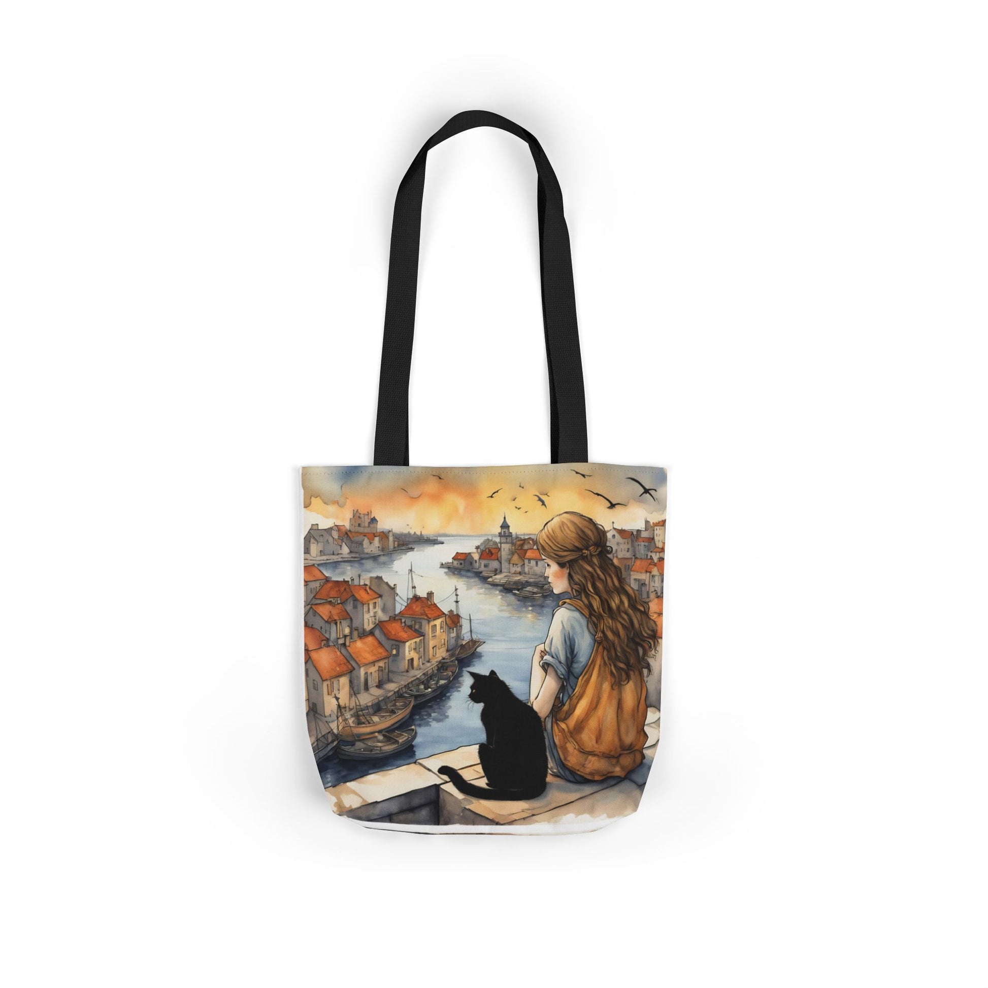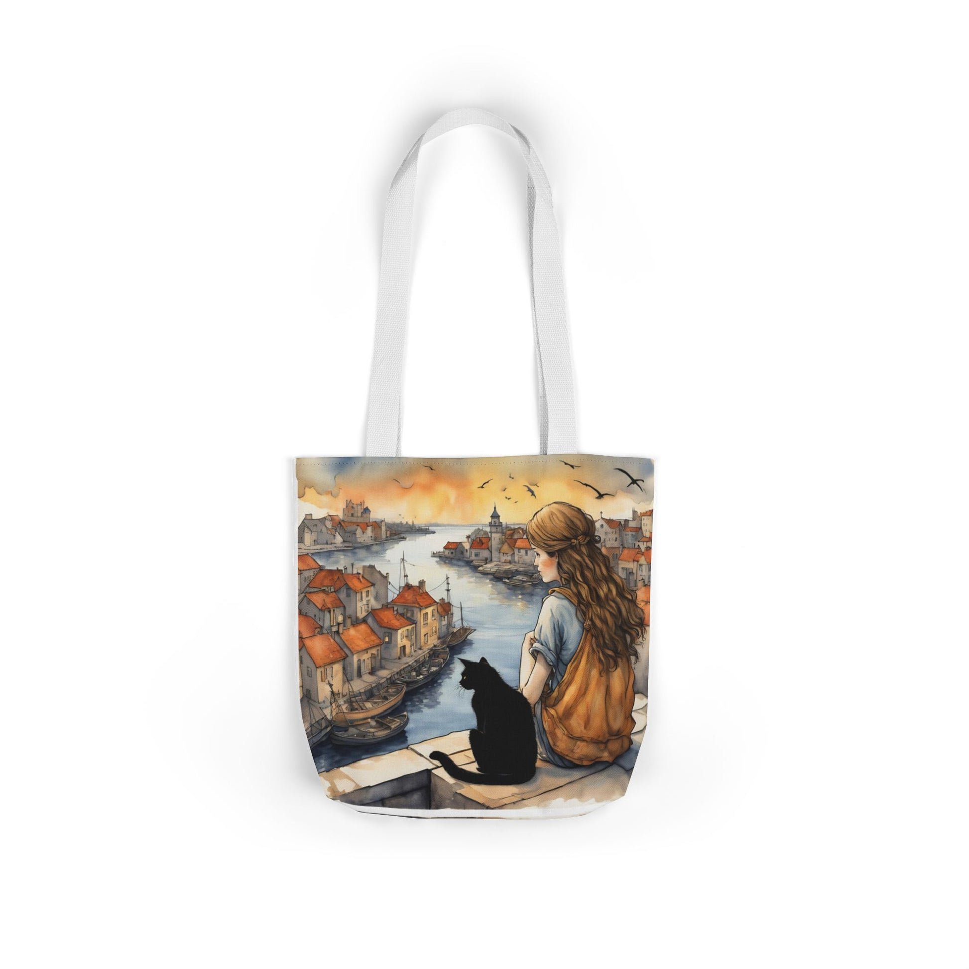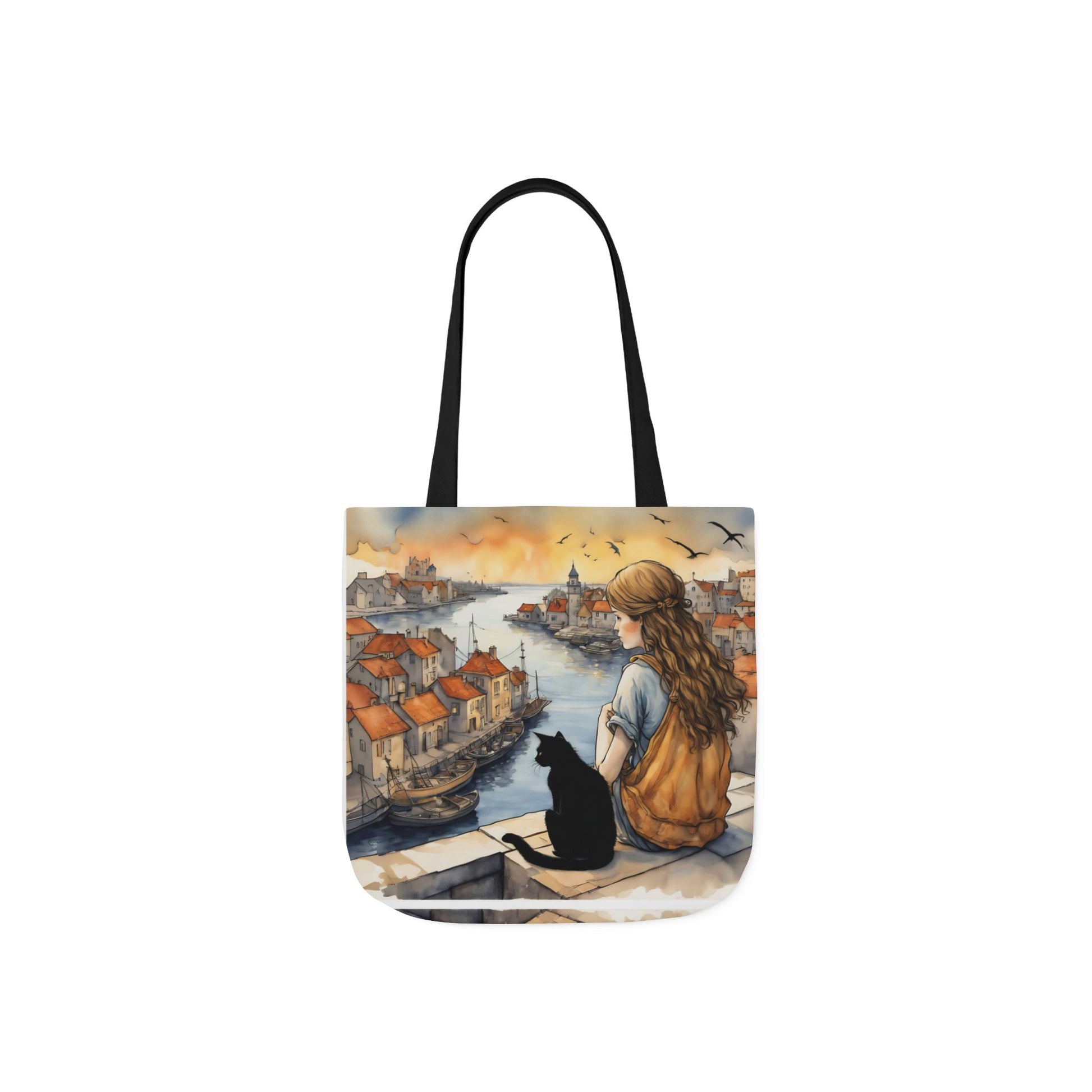 Elevate your everyday style with this Girl with a Black cat on a roof top vibrant Canvas Tote Bag. Crafted from luxuriously soft 100% polyester canvas, it features a stunning all-over print that showcases bold colors and unique designs, perfect for making a statement wherever you go. This tote bag effortlessly blends functionality with flair, making it ideal for daily errands, beach days, or city adventures. With its spacious interior and boxed corners, it provides ample room for your essentials while the five color strap options let you express your personal style. This bag is perfect for art lovers, eco-conscious shoppers, and anyone who enjoys adding a splash of color to their life. Whether you're celebrating a birthday, gearing up for a summer festival, or just treating yourself, this Canvas Tote Bag is a must-have accessory for every occasion.