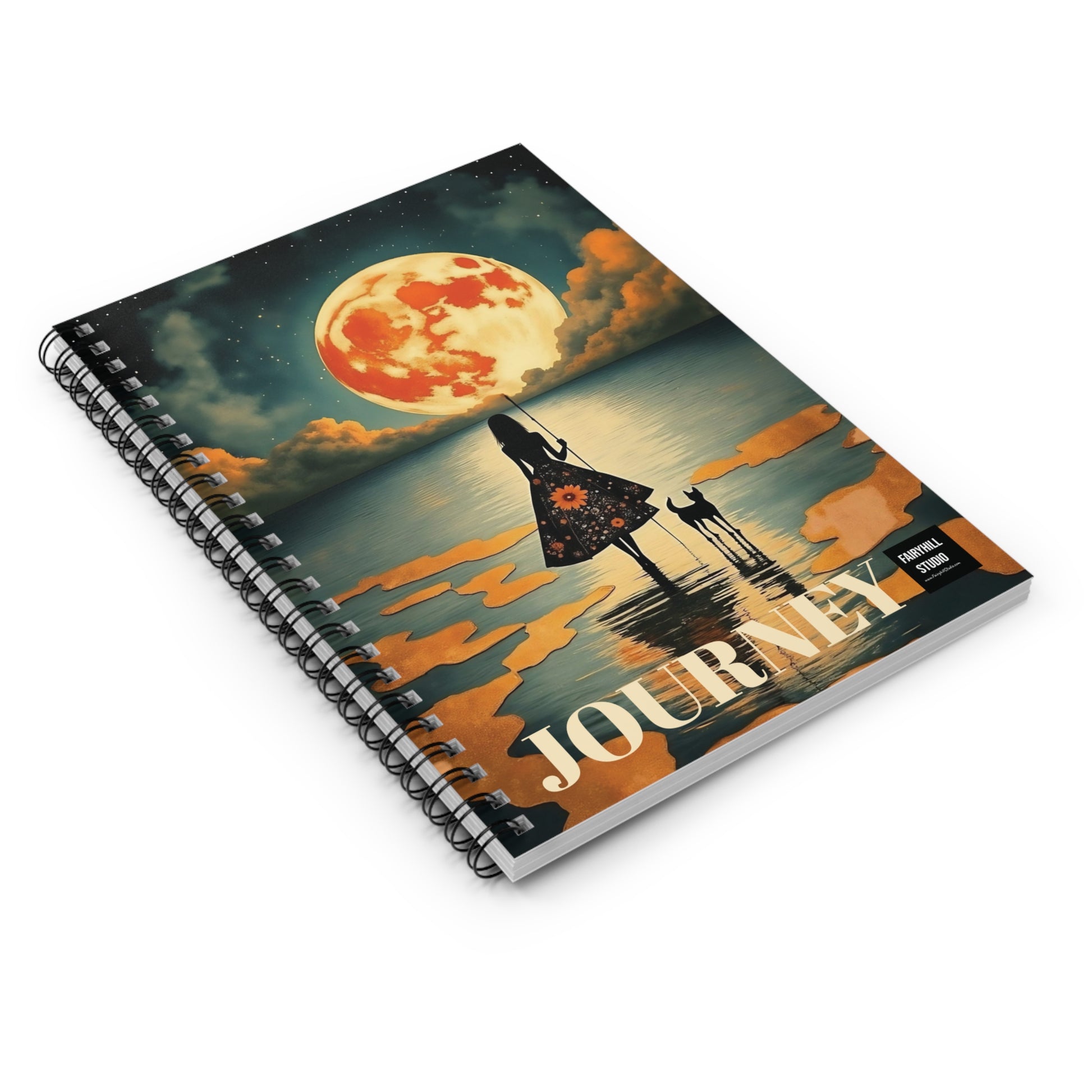 A Spiral Notebook journal featuring Girl with a fullmoon balloon by Fairyhill studio, perfect for writing down thoughts and ideas. The ruled line pages provide structure while the metal spiral binding adds a fancy touch. This notebook is ideal for creative individuals looking to add a touch of whimsy to their everyday life. Perfect for students, artists, and music lovers. Great for back to school, birthdays, or as a thoughtful gift for any occasion.