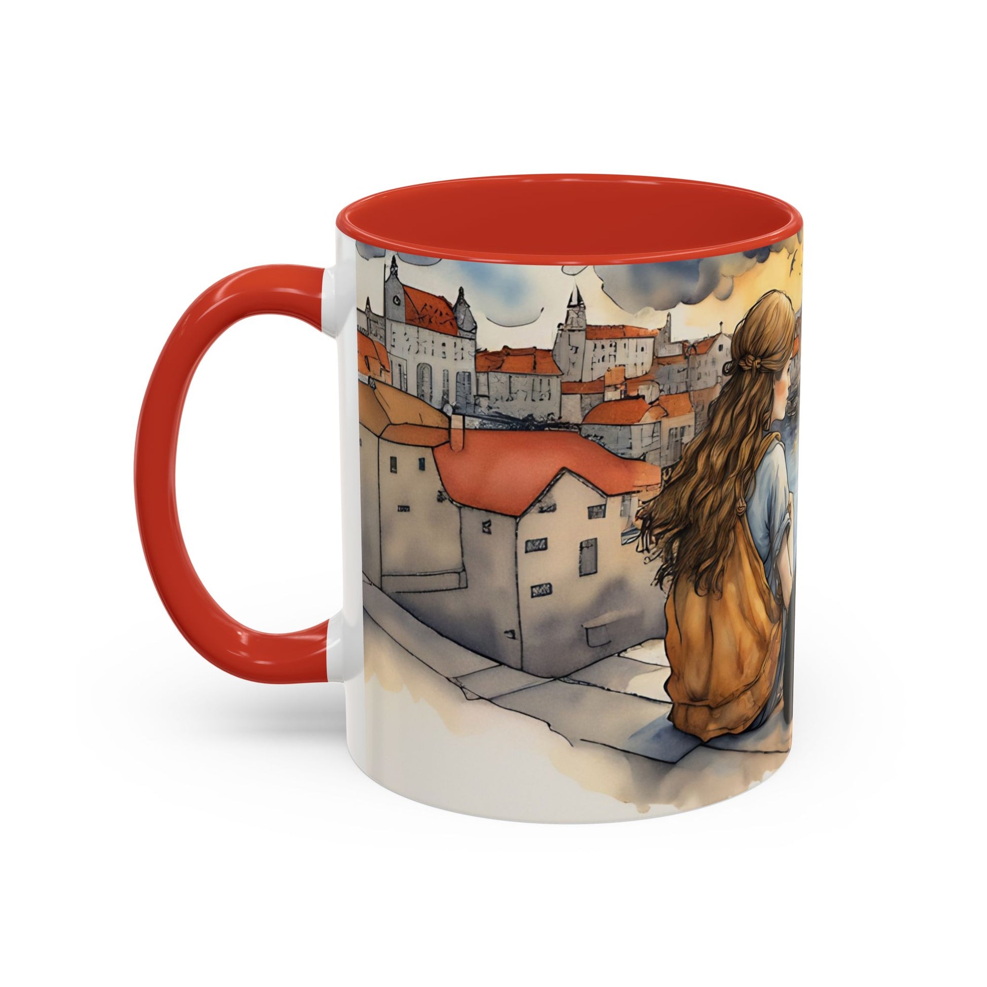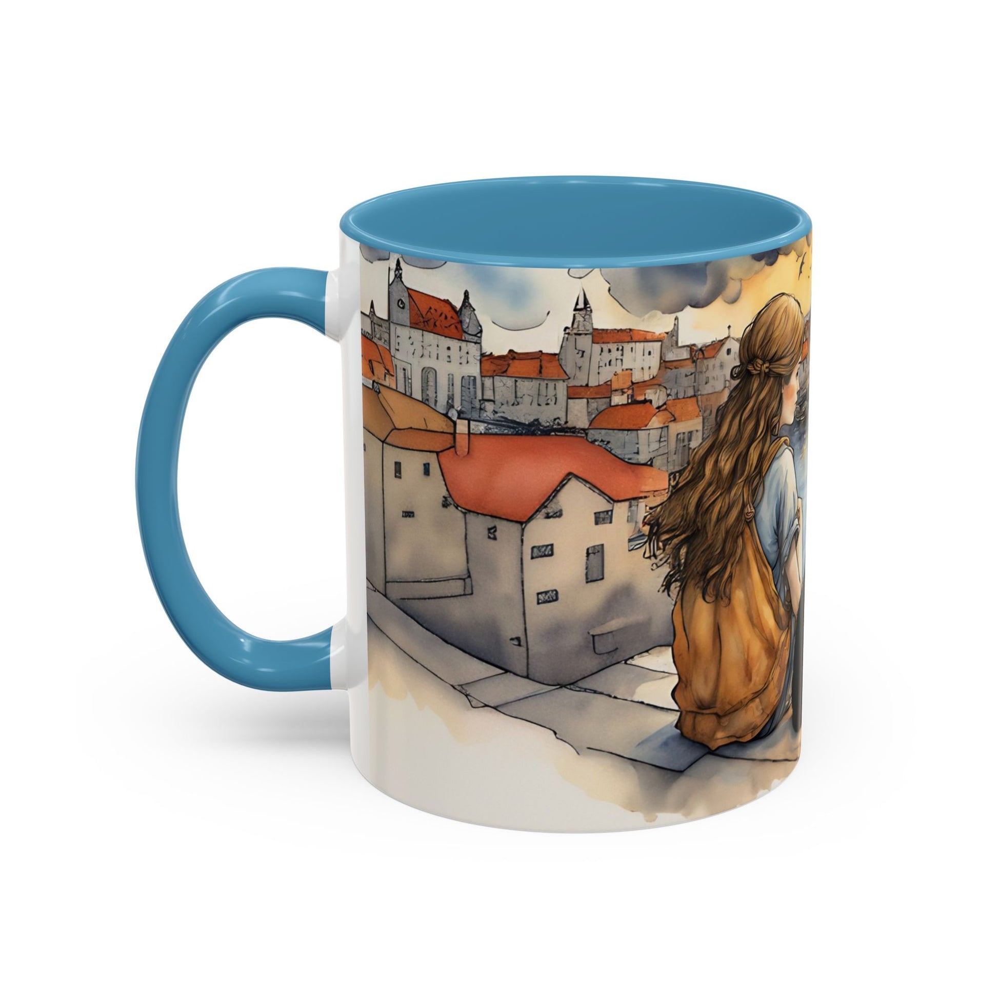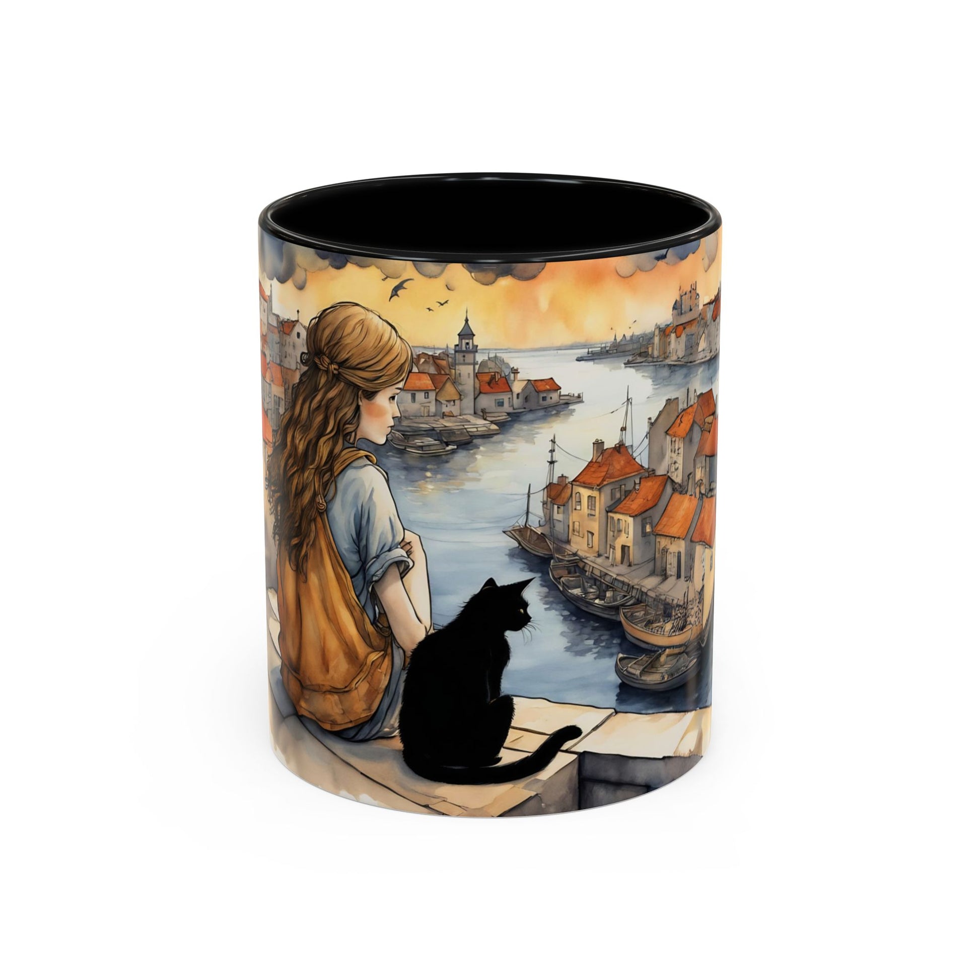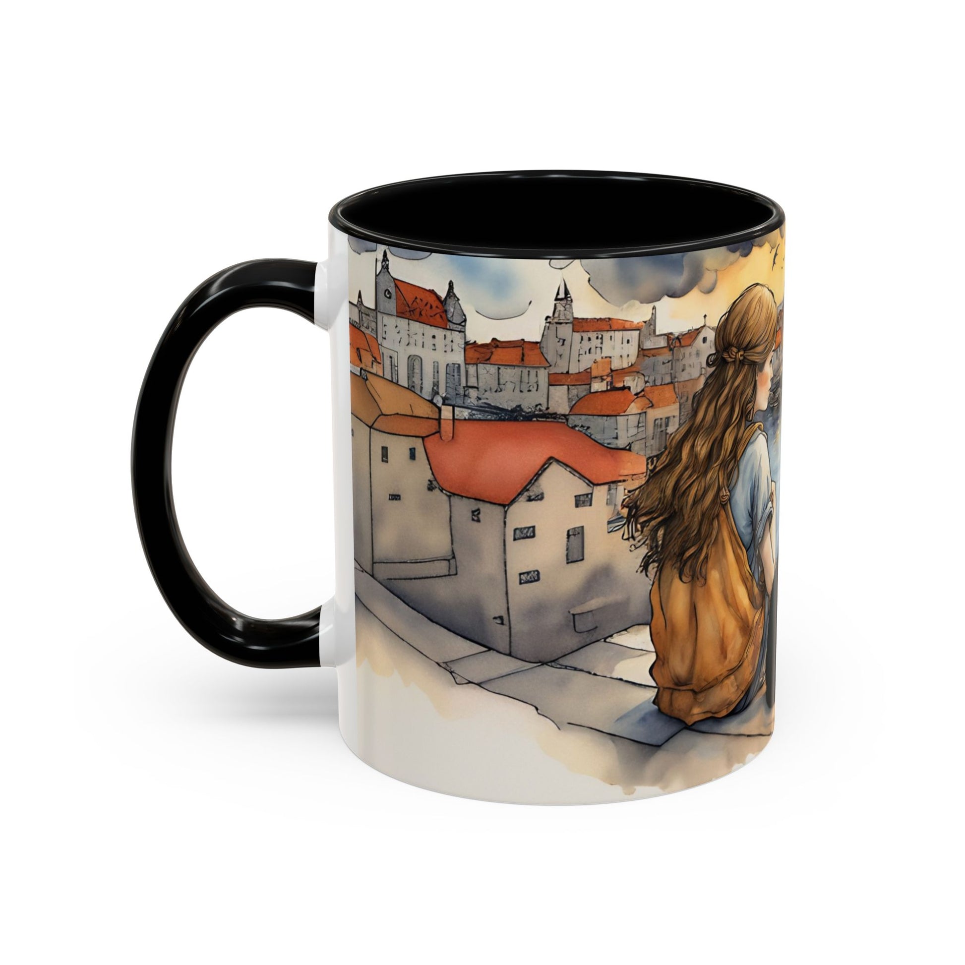 Girl with Black cat on a roof top Art-Themed Coffee Mug - 11 & 15oz Accent Mug for Musroom Fsiry Lovers