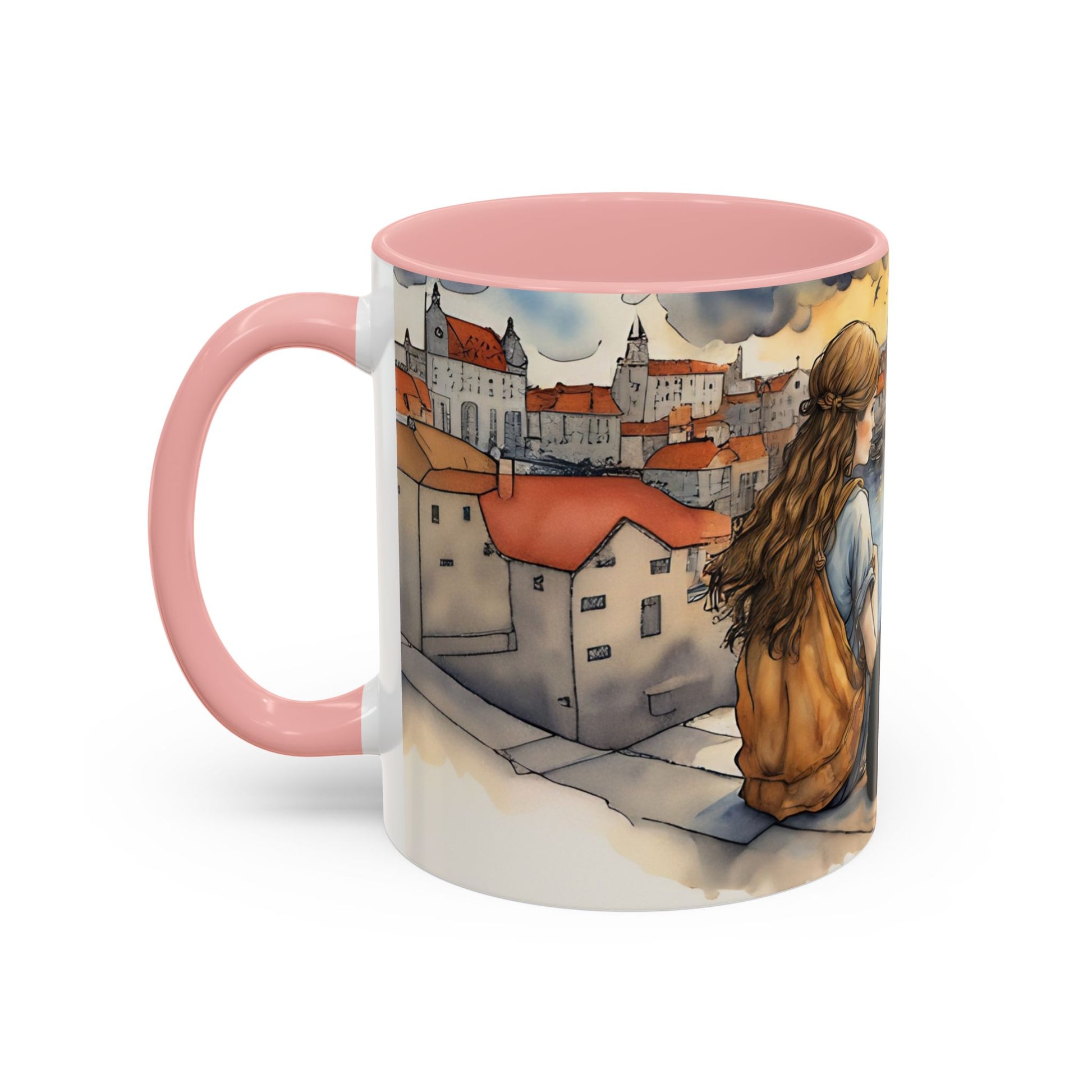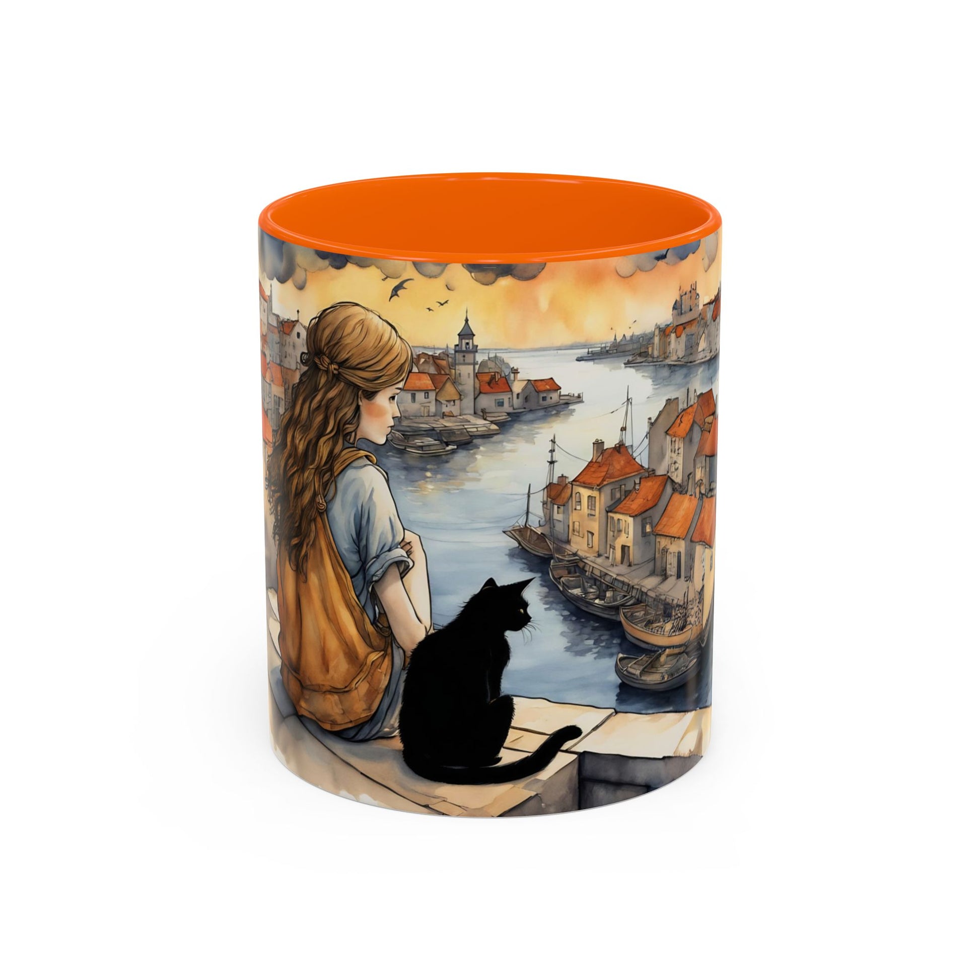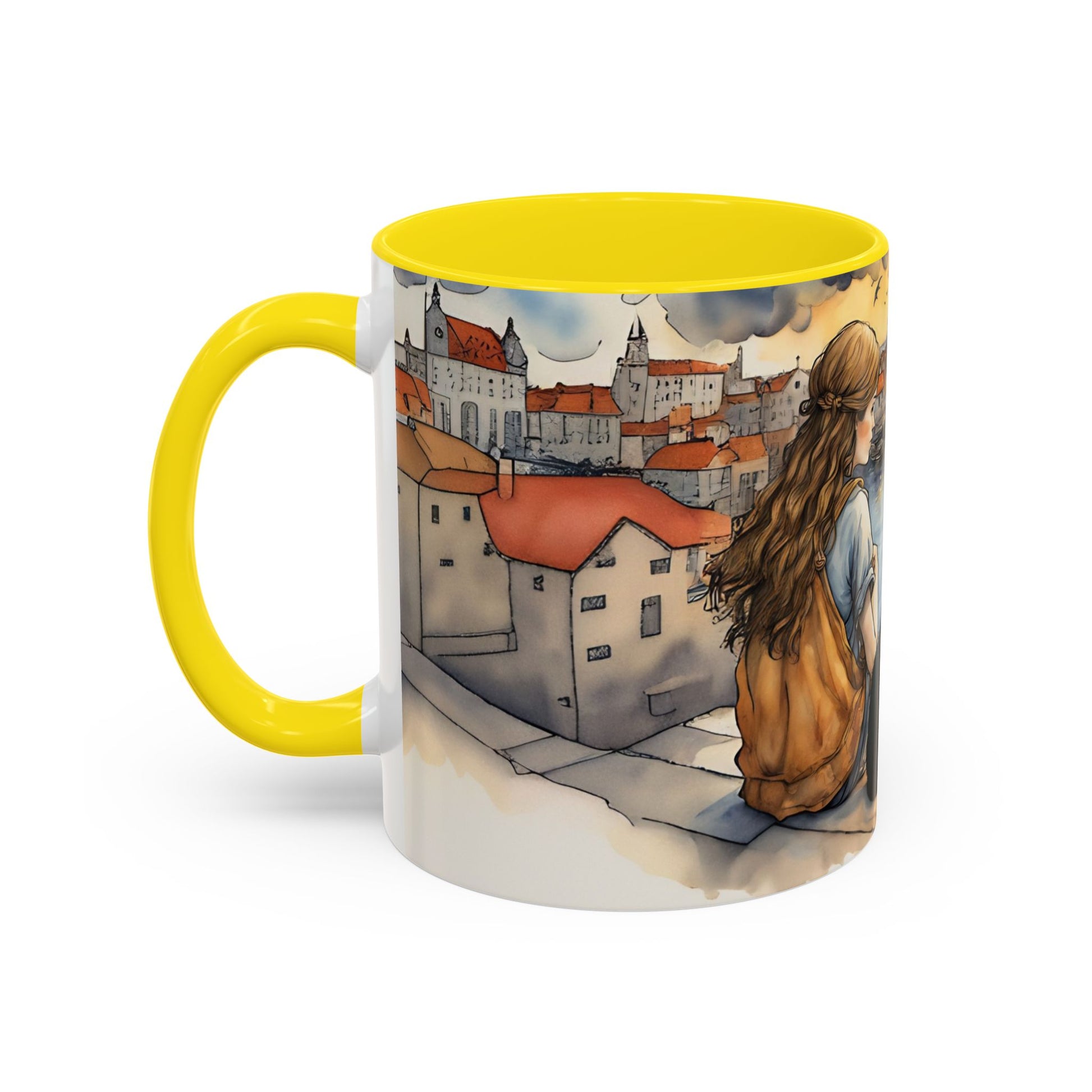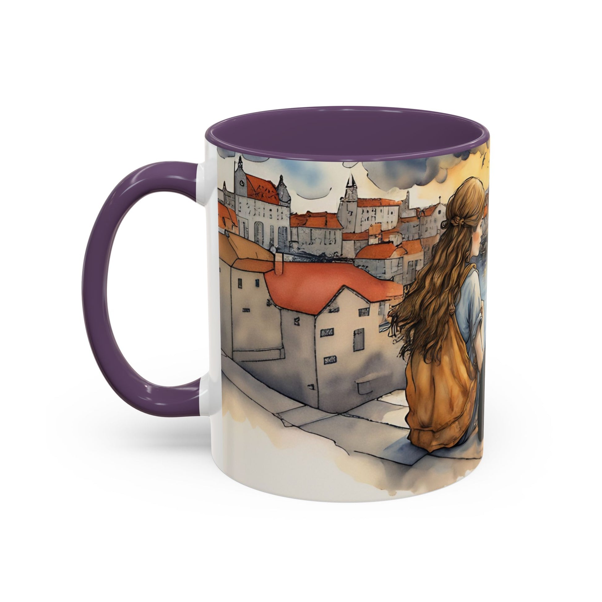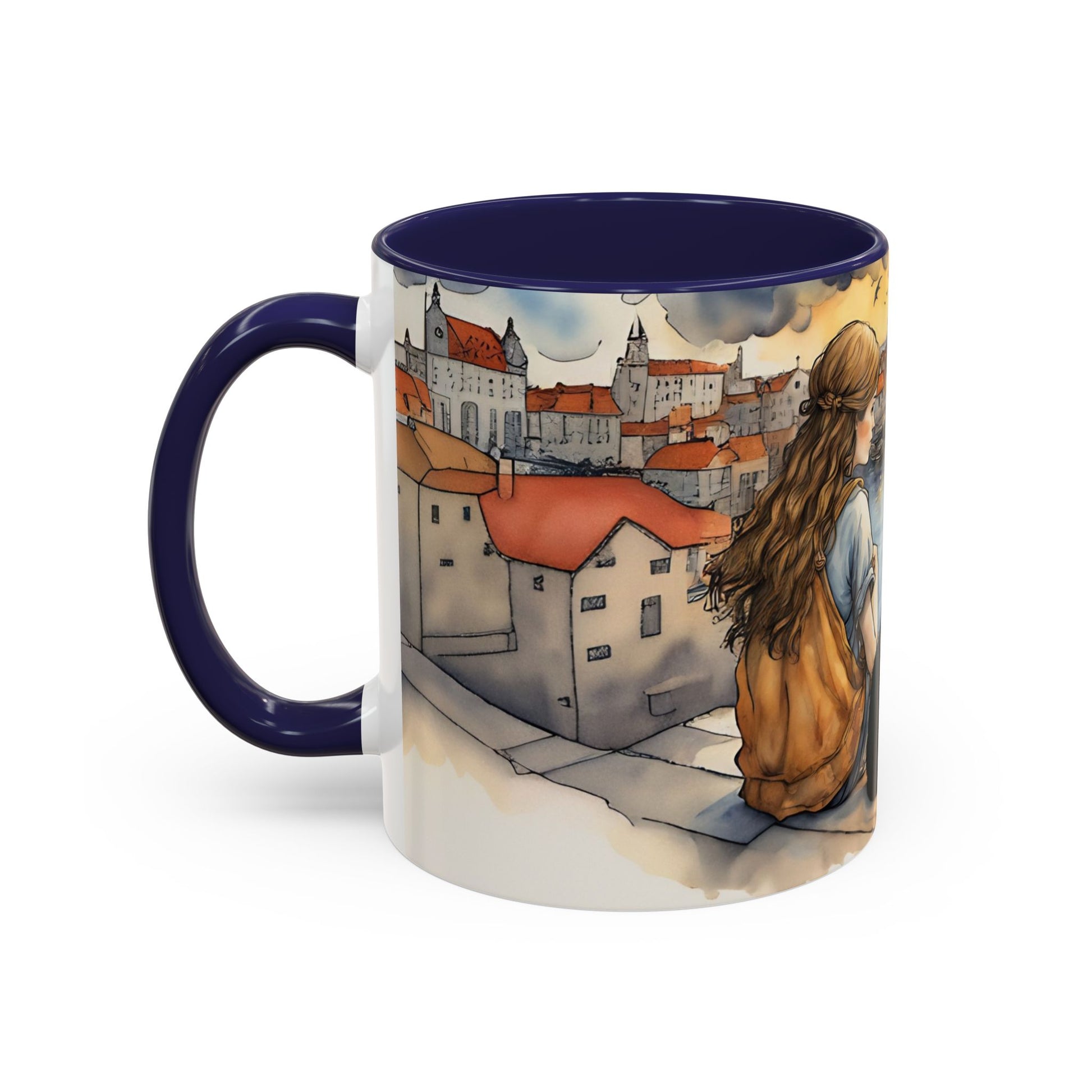 Girl with Black cat on a roof top Art-Themed Coffee Mug - 11 & 15oz Accent Mug for Musroom Fsiry Lovers